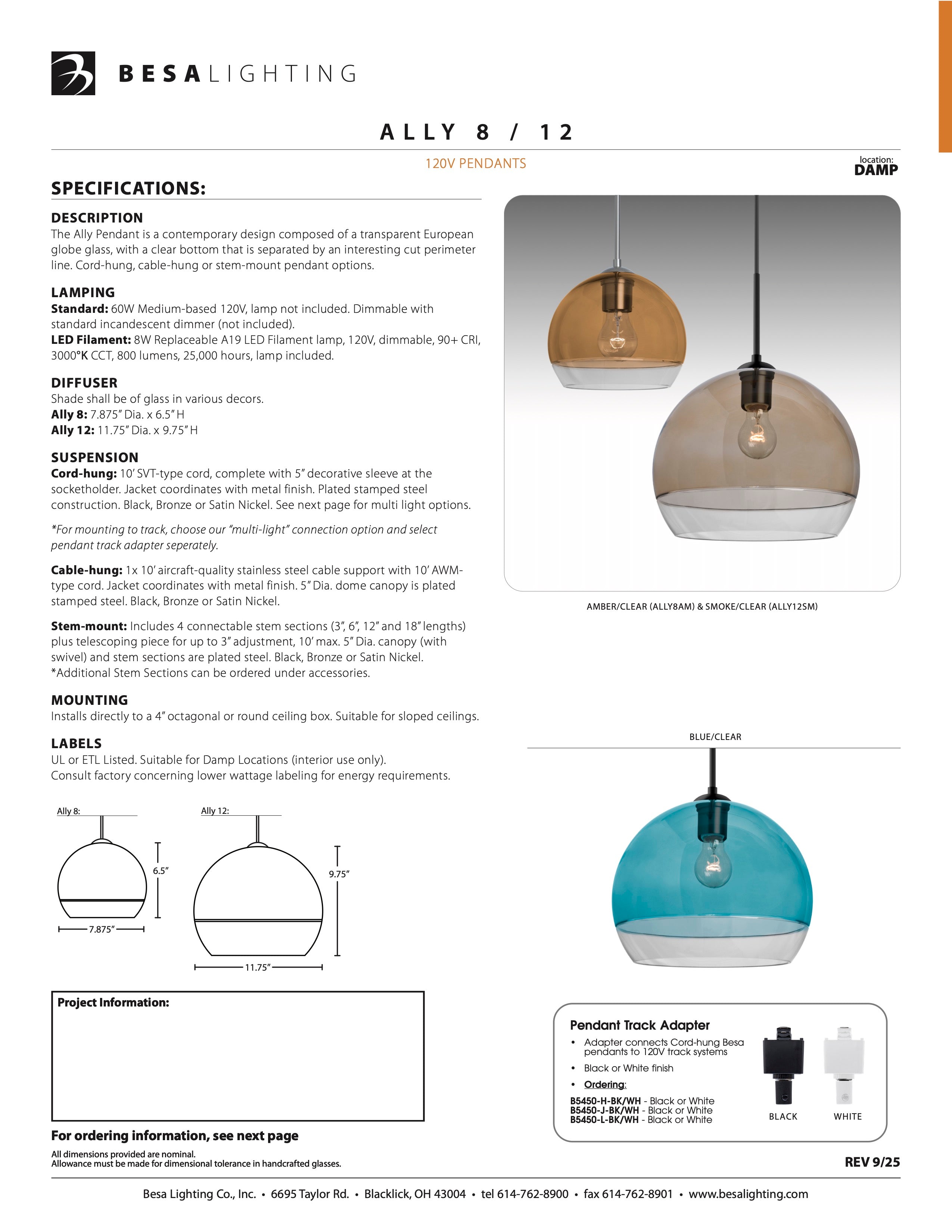 The Ally Pendant is a contemporary design composed of a transparent globe glass, with a clear bottom that is separated by an interesting cut perimeter line. The play of light through through the cut ellipse and bottom clear portion makes for a pleasing optical affect, enhanced by the exposed light source positioned inside the shade.