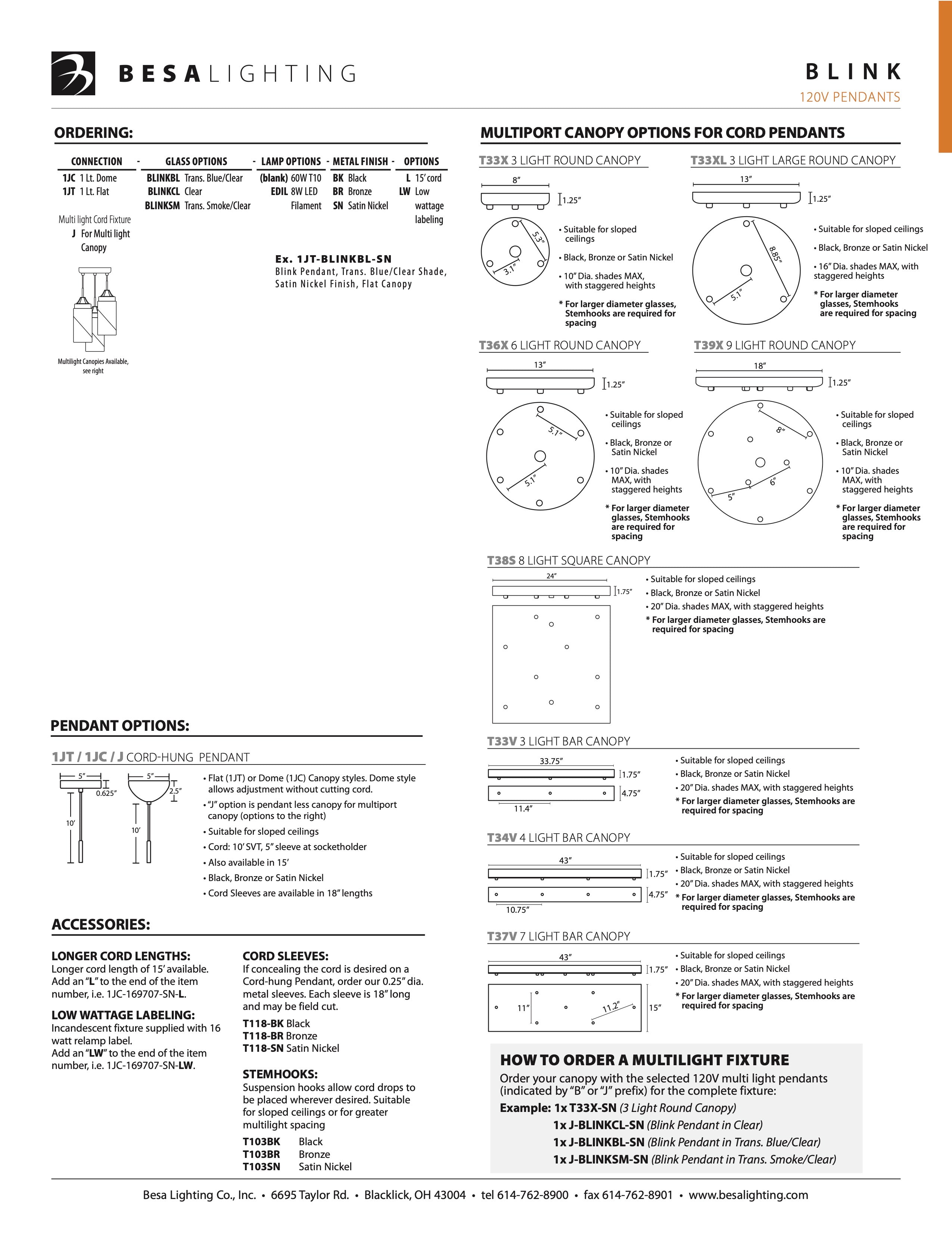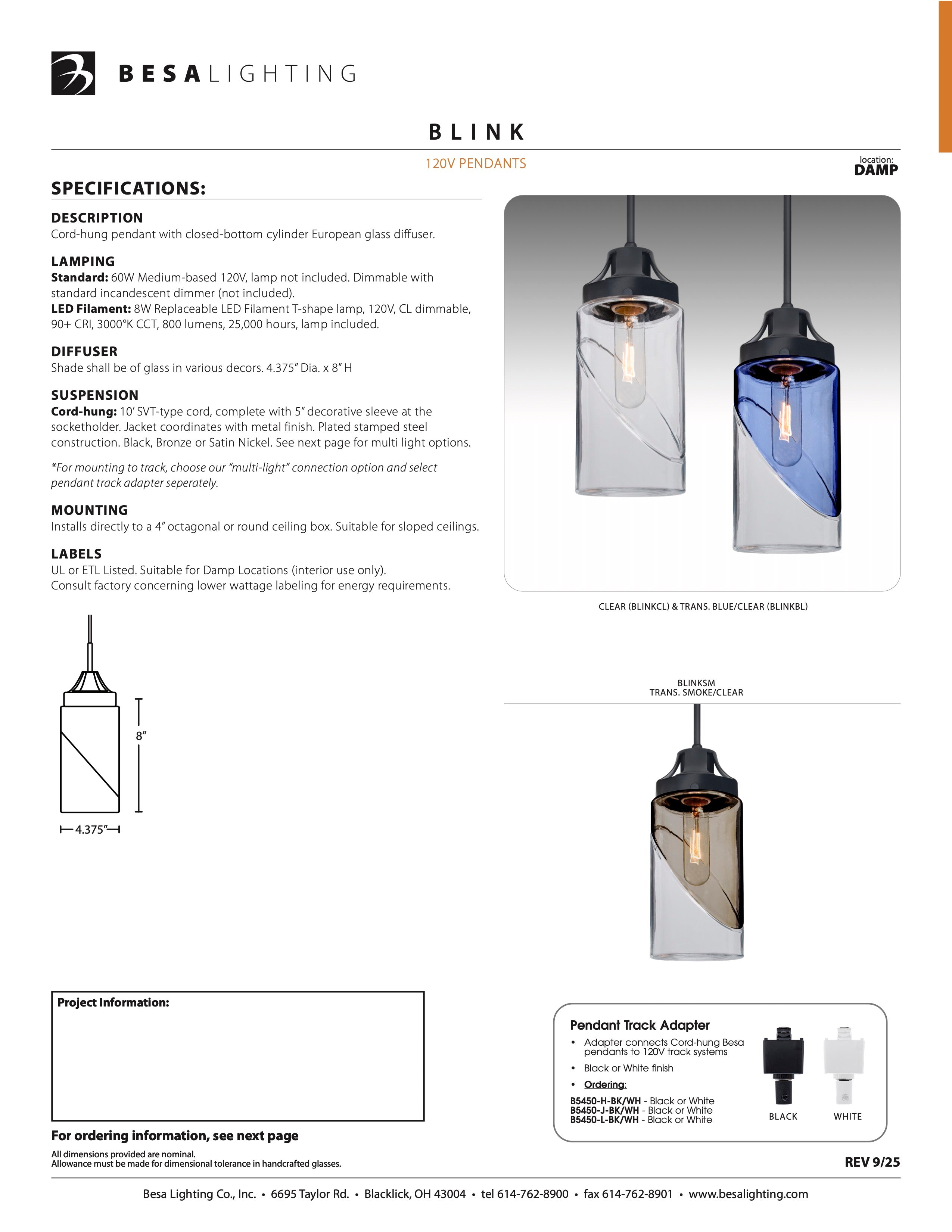 The Blink Pendant is a transitional design composed of a Clear closed-bottom cylinder glass, with a clear bottom portion that is separated from the trans color top by an interesting cut ellipse through the center. The play of light through through the cut ellipse makes for a pleasing optical affect, enhanced by the exposed light source positioned inside the shade.