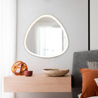 This LED mirror combines sculptural form and function with a soft organic silhouette and clean brushed sand nickel frame. Its gentle curves add a modern artistic touch to any space, while the integrated LED light provides adjustable illumination via dimmable CCT technology. Ideal for bathrooms, bedrooms, or entryways, this mirror offers a stylish upgrade with its frosted perimeter glow and minimalist controls for everyday use.