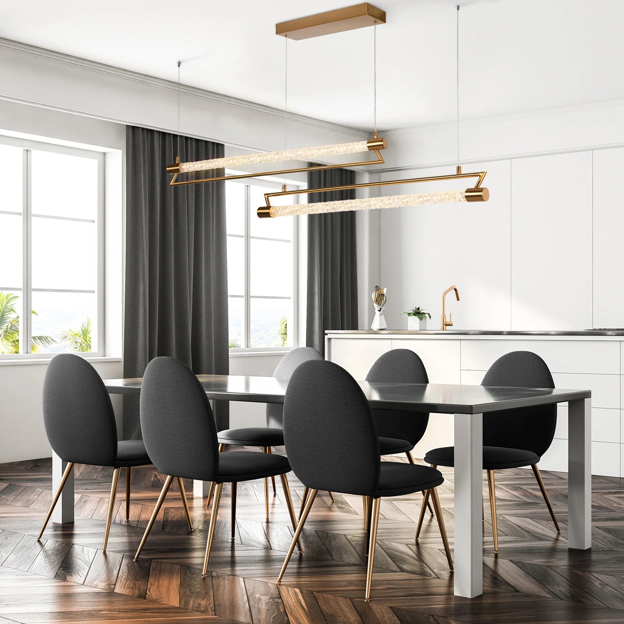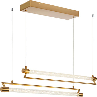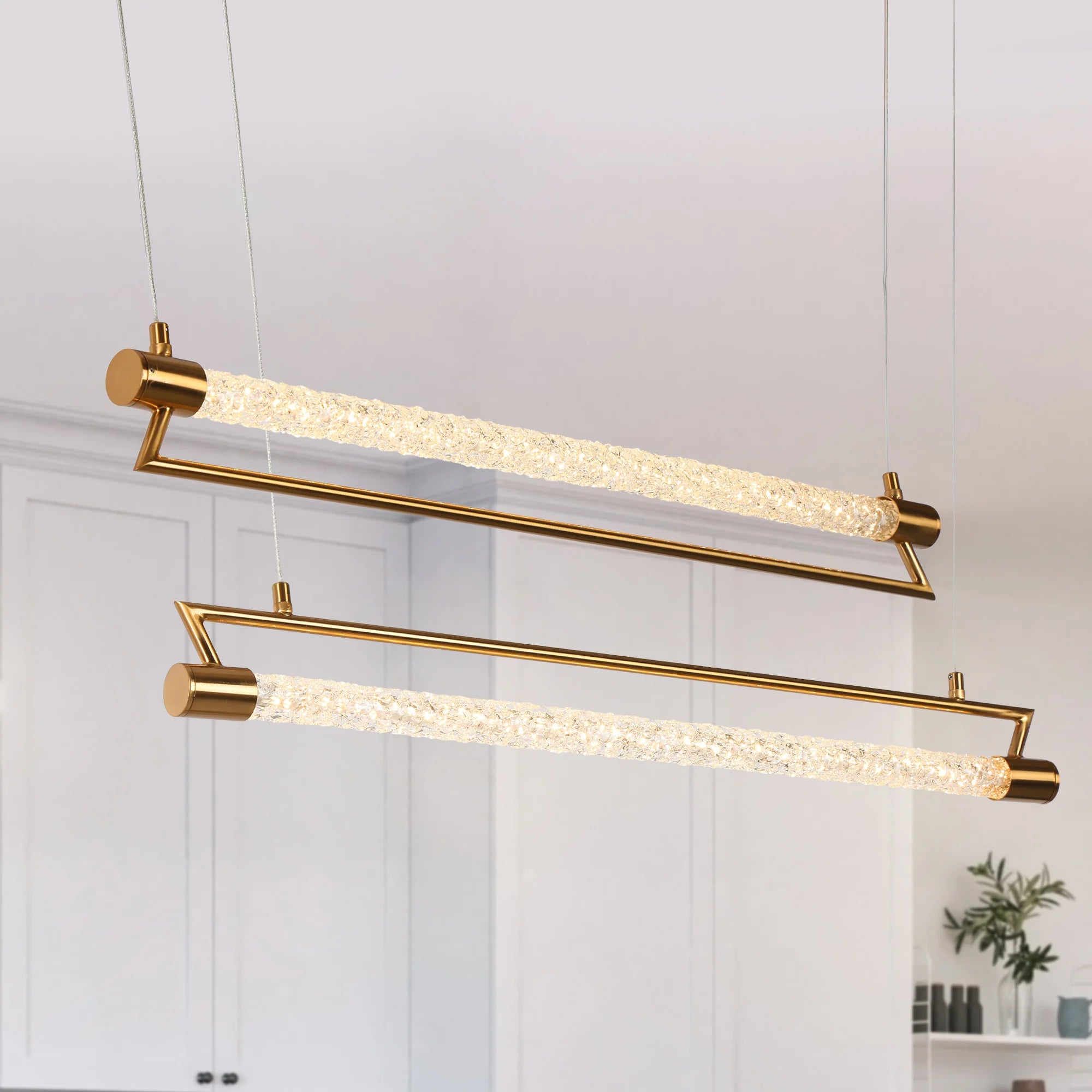 This stunning modern chandelier features a captivating two-tiered design with cascading glass tubes and gleaming brass accents. The integrated LED lights provide warm, inviting illumination (3045K color temperature) perfect for kitchens, dining rooms, or living areas. With its adjustable height and dimmable feature, this chandelier offers both versatility and ambiance.