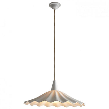 The Christie Pendant is exquisitely handcrafted in Bone China whose shade resembles rolling ocean waves. The unique pully system allows you to customize the length any time you choose. Available in Natural White. Includes a sand and taupe cotton braid cable. Made in the UK. UL listed.