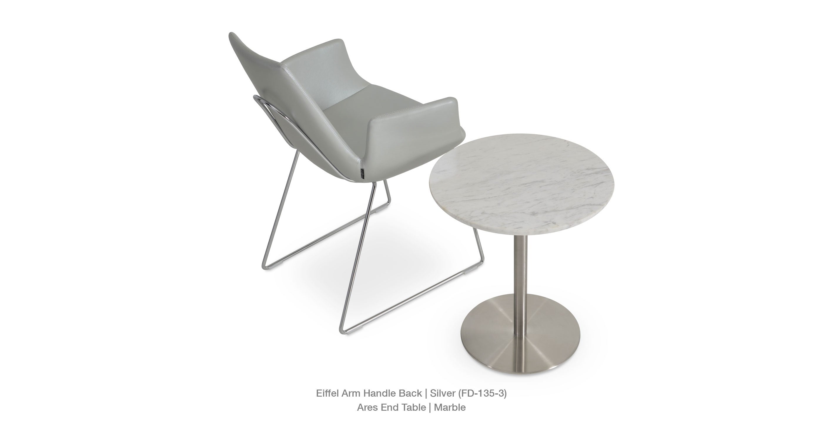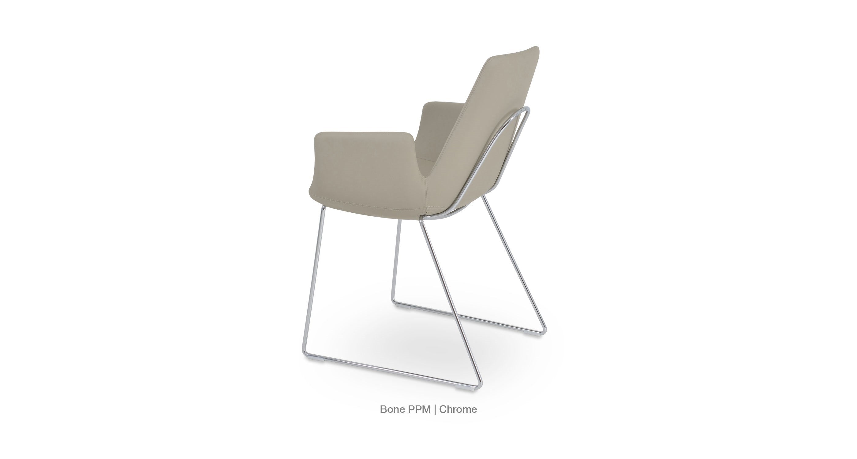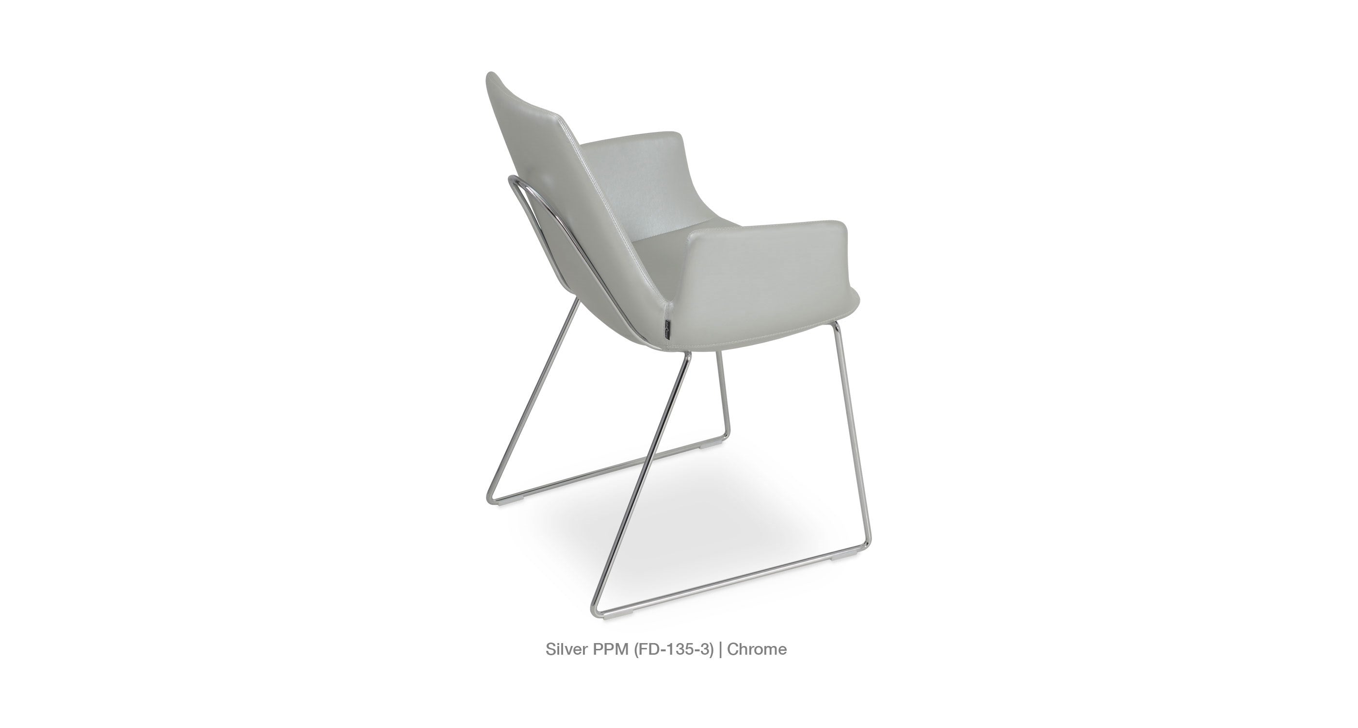 Eiffel Arm Handle Back is a contemporary dining chair with a comfortable upholstered seat and backrest on solid metal wire in chrome, as well as tube available in chrome and black powder coated finish. Each leg is tipped with a plastic glide embedded into the metal wire. The seat has a steel structure with “S” shape springs for extra flexibility and strength. This steel frame molded by injecting polyurethane foam. Eiffel seat is upholstered with a removable velcro, enclosed leather, PPM, leatherette, wool as well as Camira organic wool slip cover. Eiffel Arm Handle Back may be upholstered with variety of other colors as a special order with a minimum of quantity required. The chair is suitable for both residential and commercial use.