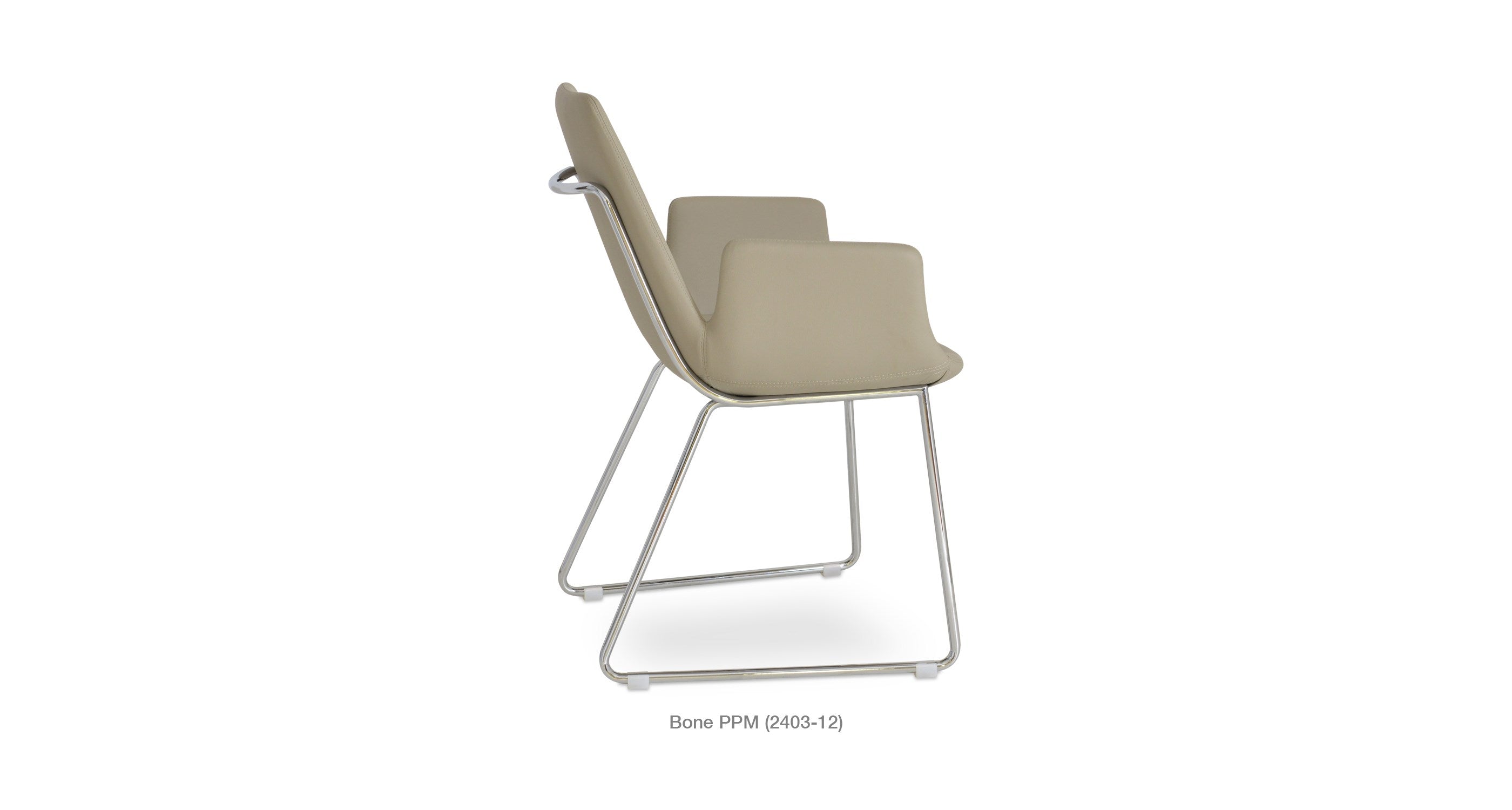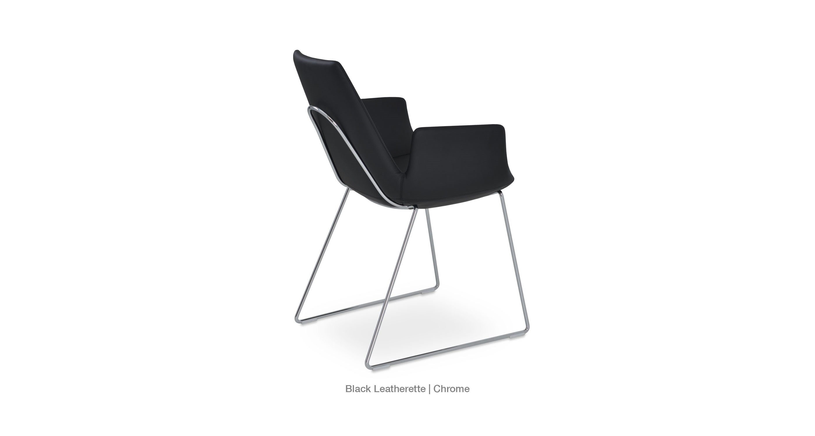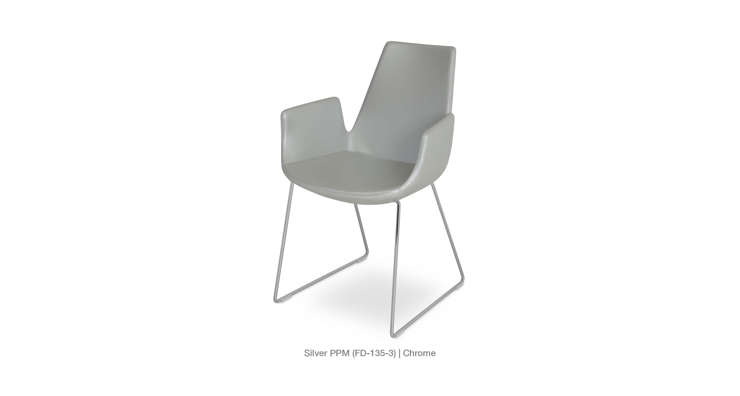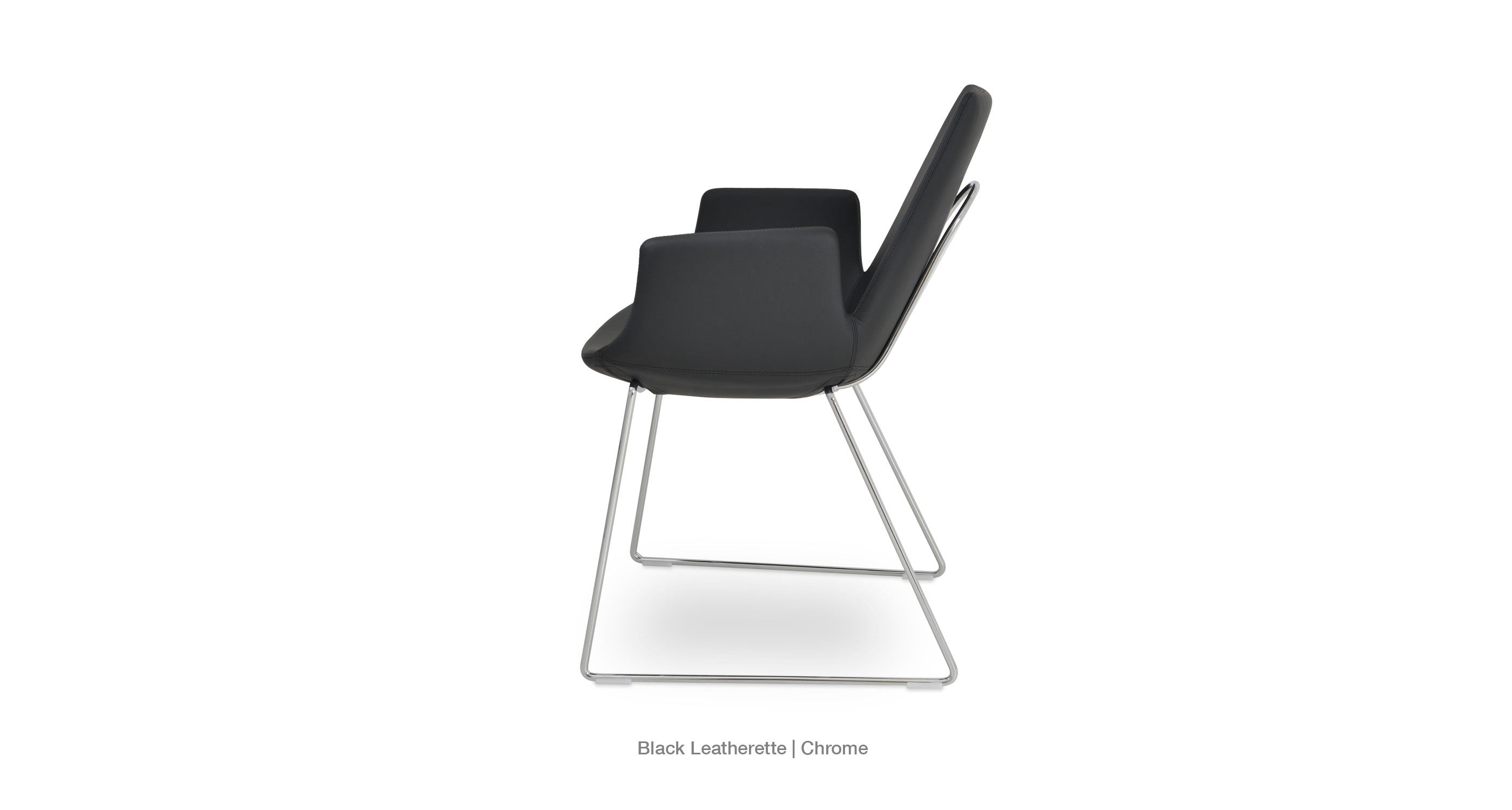 Eiffel Arm Handle Back is a contemporary dining chair with a comfortable upholstered seat and backrest on solid metal wire in chrome, as well as tube available in chrome and black powder coated finish. Each leg is tipped with a plastic glide embedded into the metal wire. The seat has a steel structure with “S” shape springs for extra flexibility and strength. This steel frame molded by injecting polyurethane foam. Eiffel seat is upholstered with a removable velcro, enclosed leather, PPM, leatherette, wool as well as Camira organic wool slip cover. Eiffel Arm Handle Back may be upholstered with variety of other colors as a special order with a minimum of quantity required. The chair is suitable for both residential and commercial use.