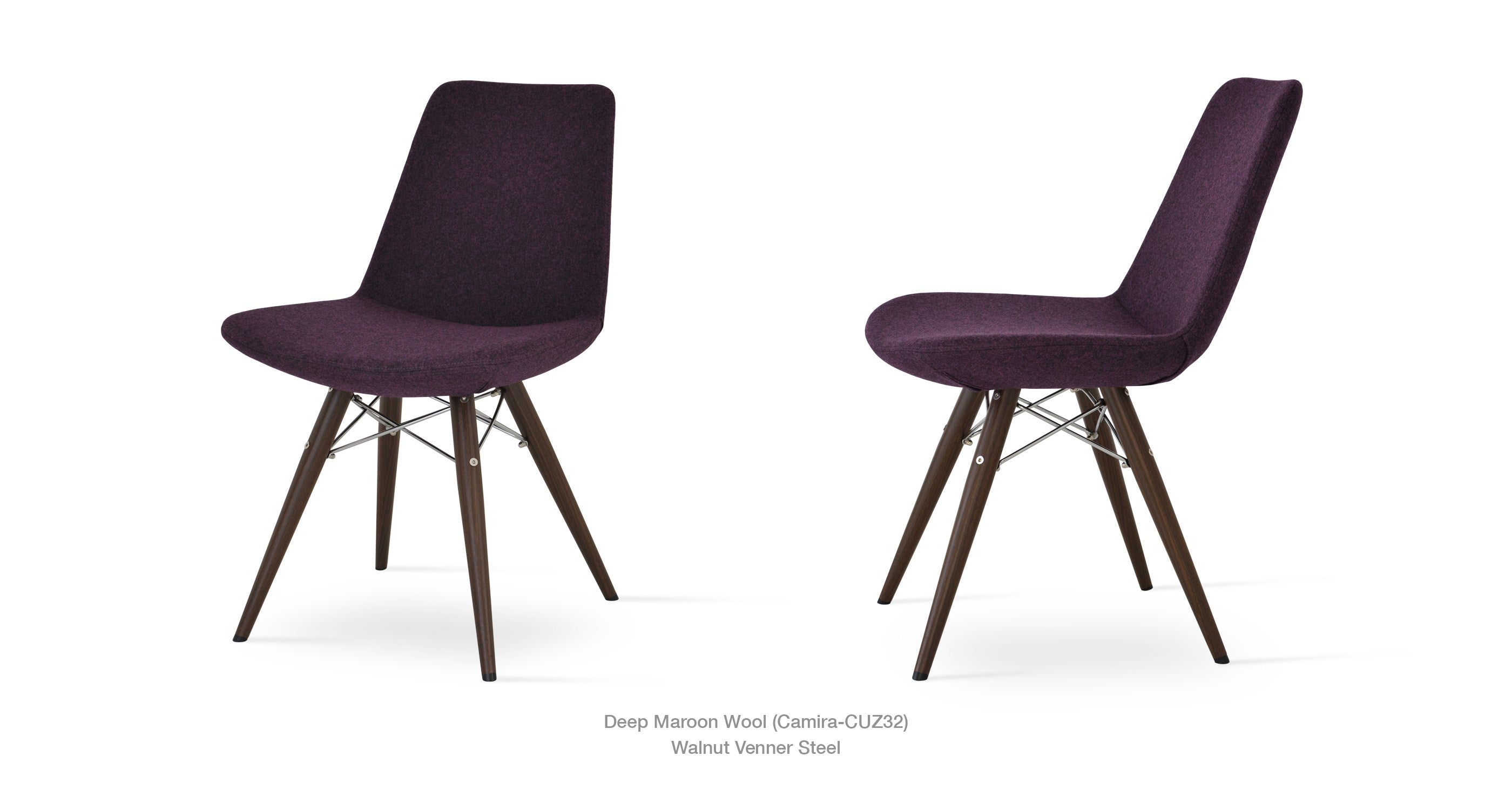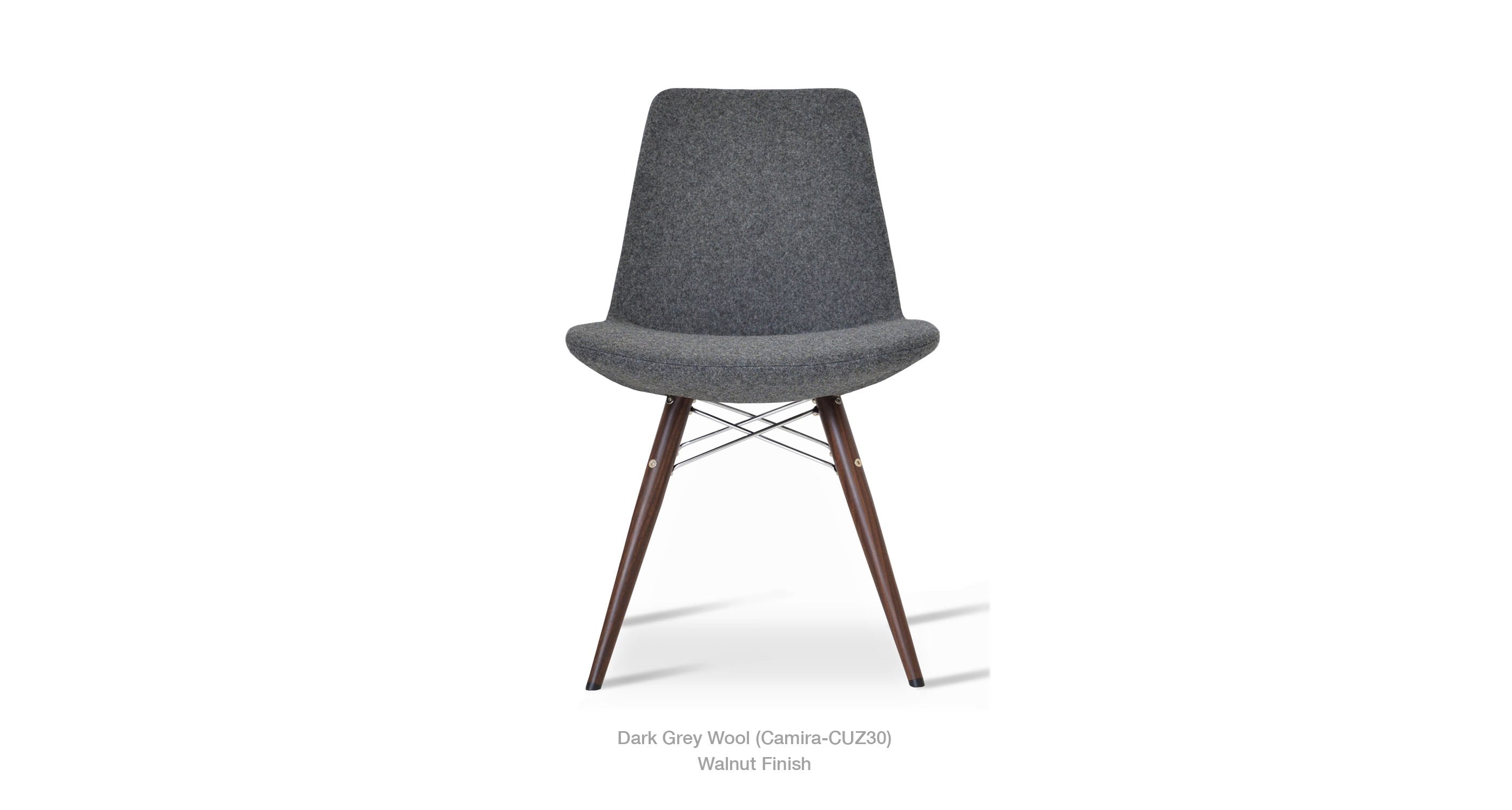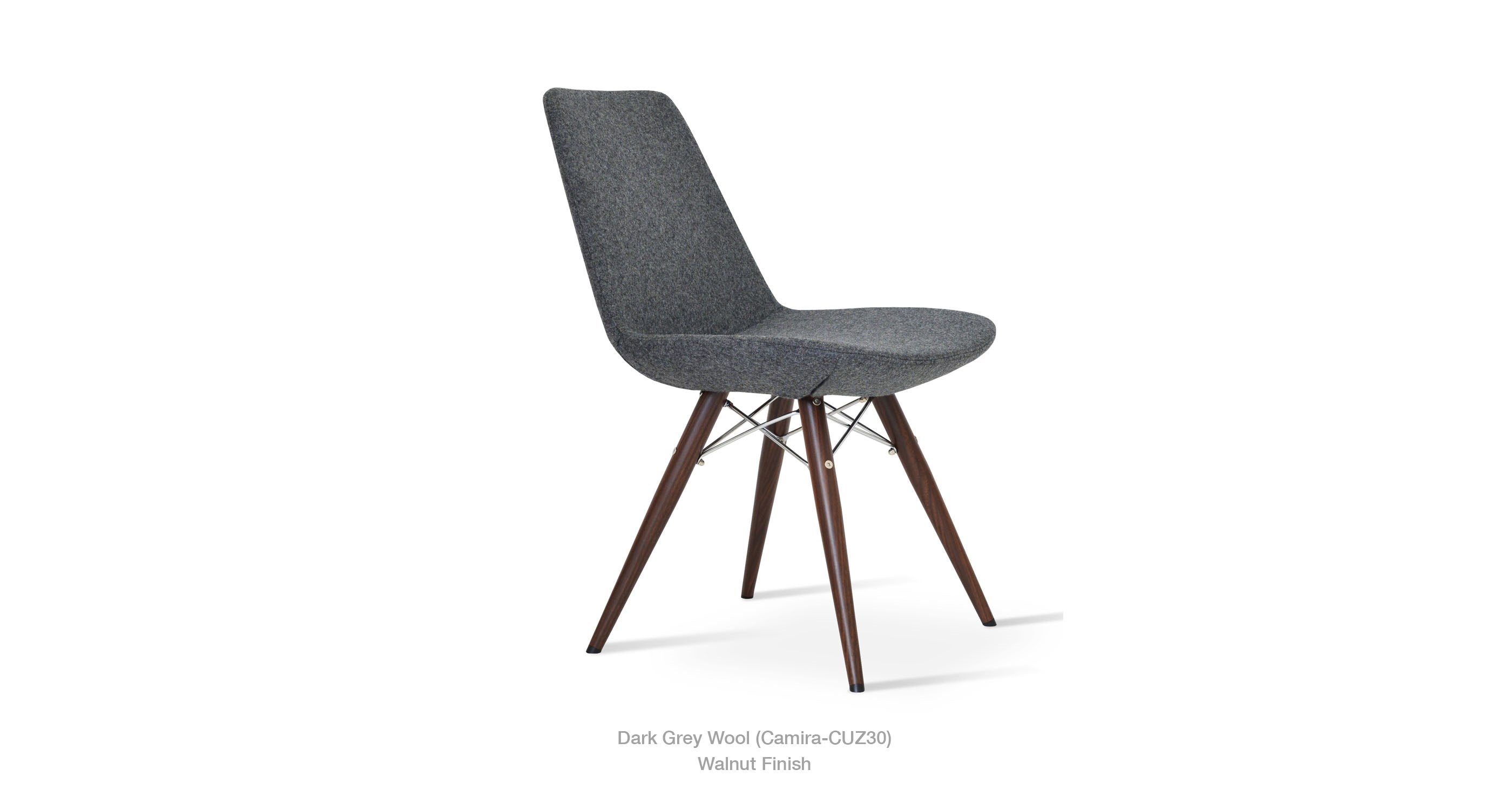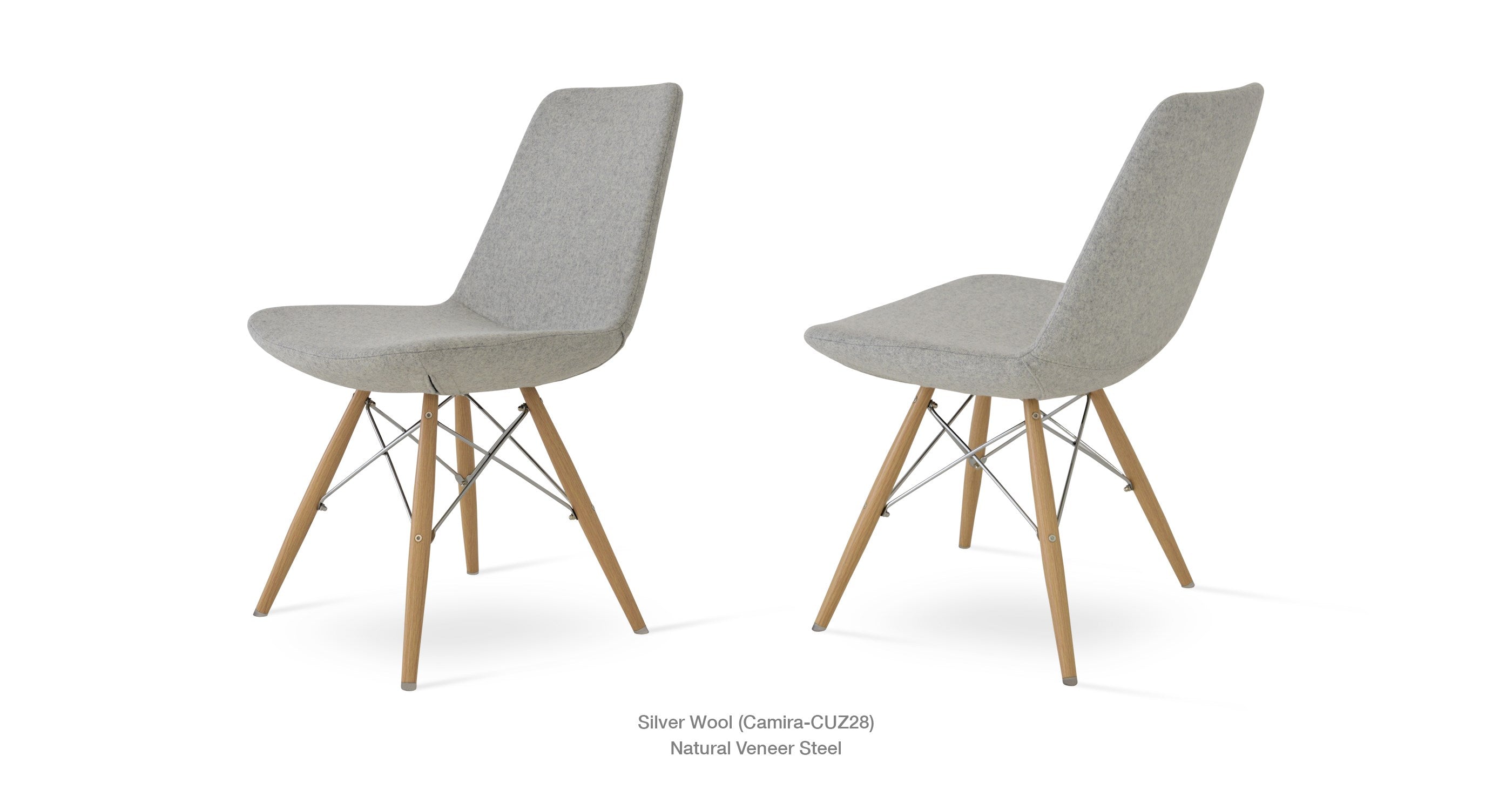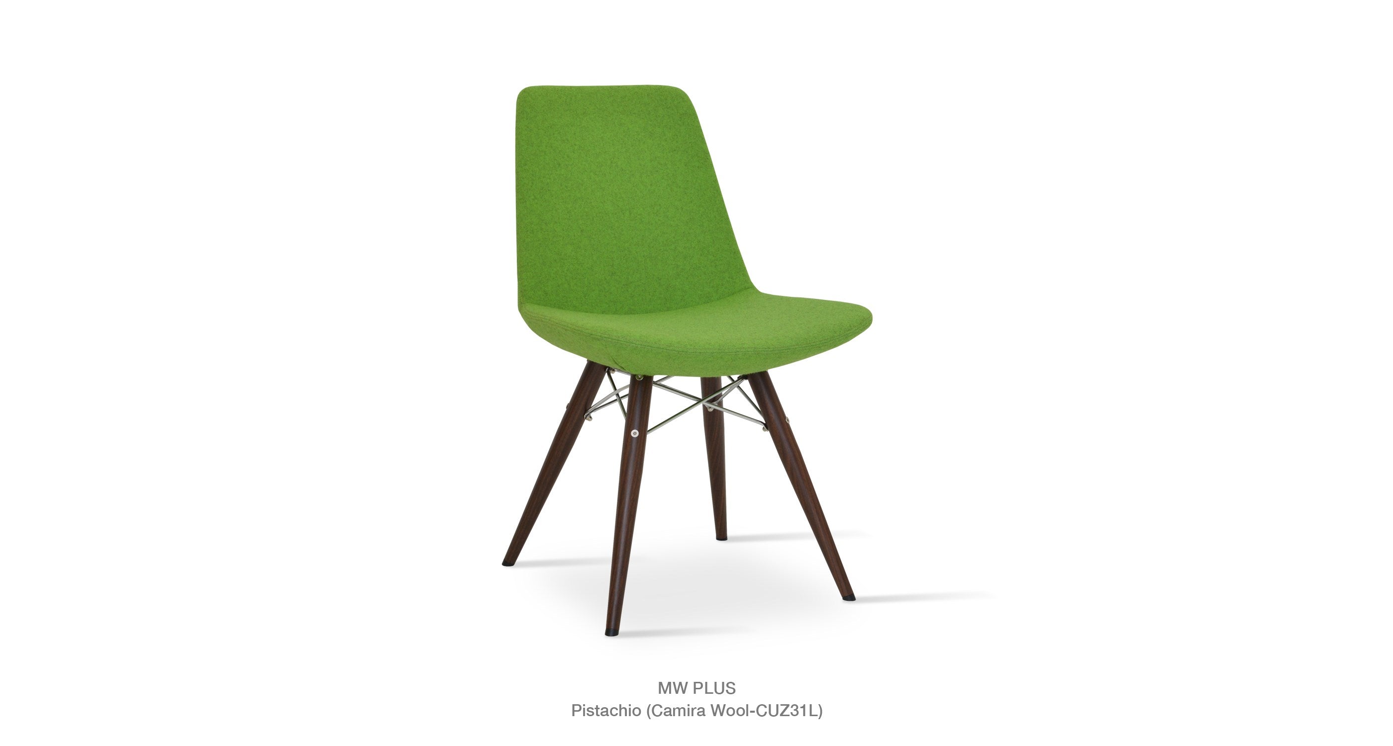 Eiffel MW is a contemporary dining chair with a comfortable upholstered seat and backrest on dowel legs. Eiffel MW has veneer steel legs available in black powder, natural as well as stainless steel finishes. Black wires are used with natural metal legs and chrome wires are used with black powdered metal legs. Each leg is tipped with a plastic glide screwed into the foot. The seat has a steel structure with “S” shape springs for extra flexibility and strength. This steel frame is molded by an injecting polyurethane foam. Eiffel seat is upholstered with a removable velcro, enclosed leather, PPM, leatherette, wool as well as Camira organic wool slip cover. Eiffel MW may be upholstered with variety of other colors as a special order with a minimum of quantity required. The chair is suitable for both residential and commercial use.