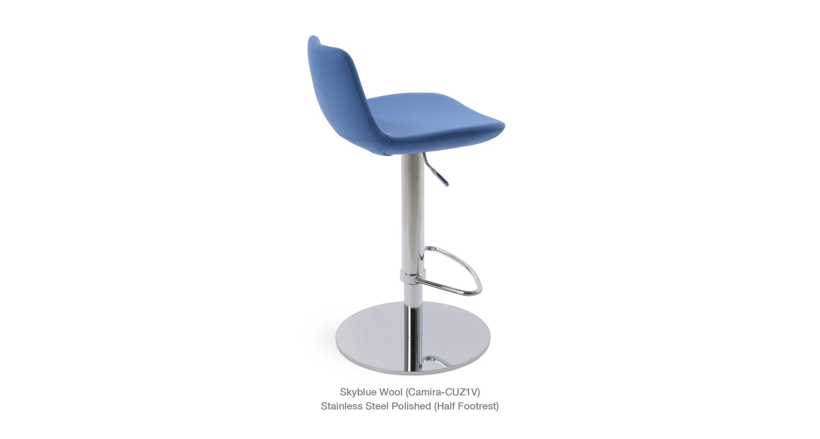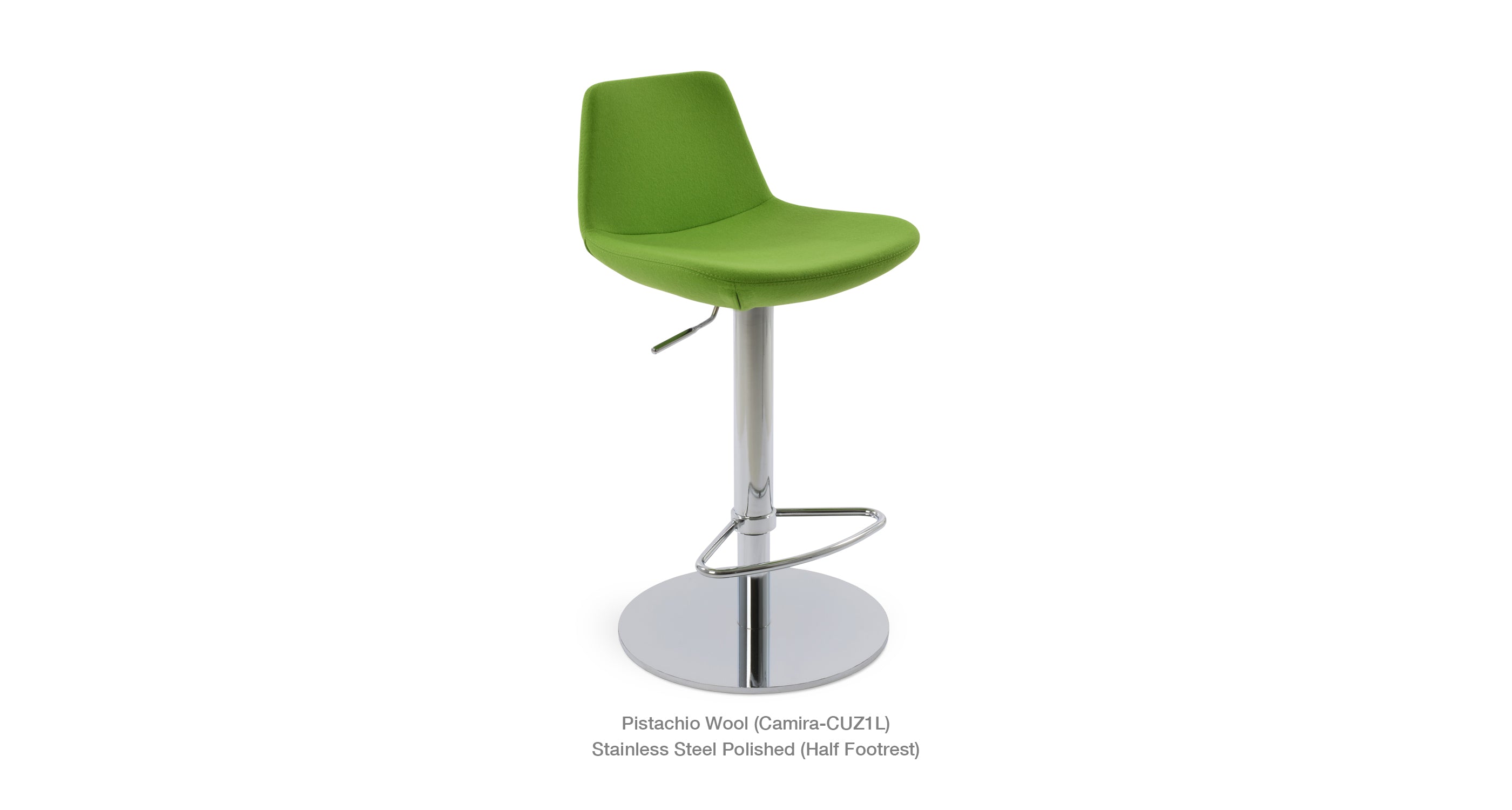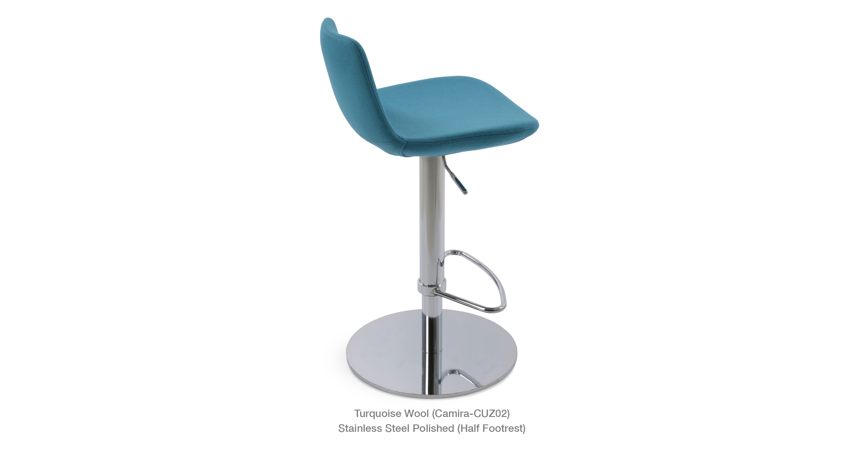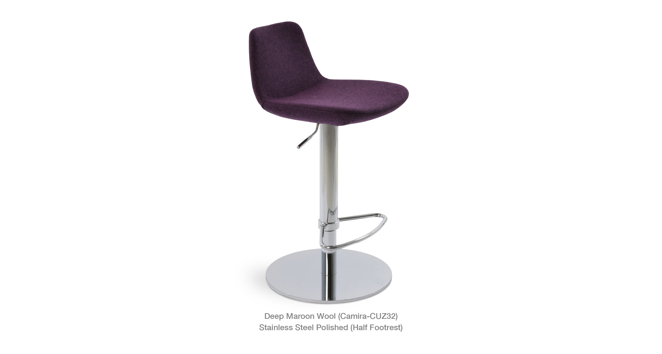 Pera Piston Half Footrest is a unique stool with a comfortable upholstered seat and backrest on an adjustable gas piston base which swivels and also adjusts easily from a counter height to a bar height with a lever that activates the gas piston mechanism. The solid steel round base is available in chrome or stainless steel. The seat has a steel structure with “S” shape springs for extra flexibility and strength. This steel frame molded by injecting polyurethane foam. Pera seat is upholstered with a removable velcro enclosed leather, PPM or wool fabric slip cover. The stool is suitable for both residential and commercial use.