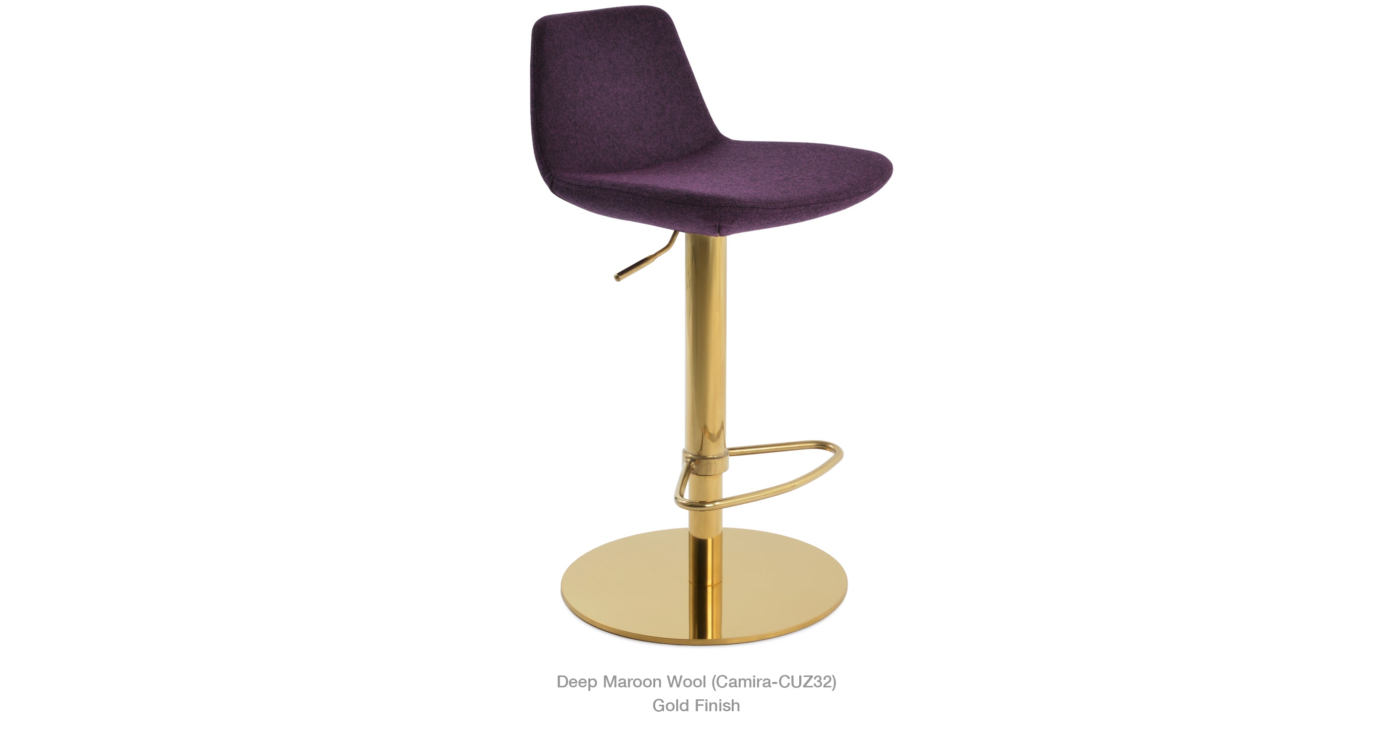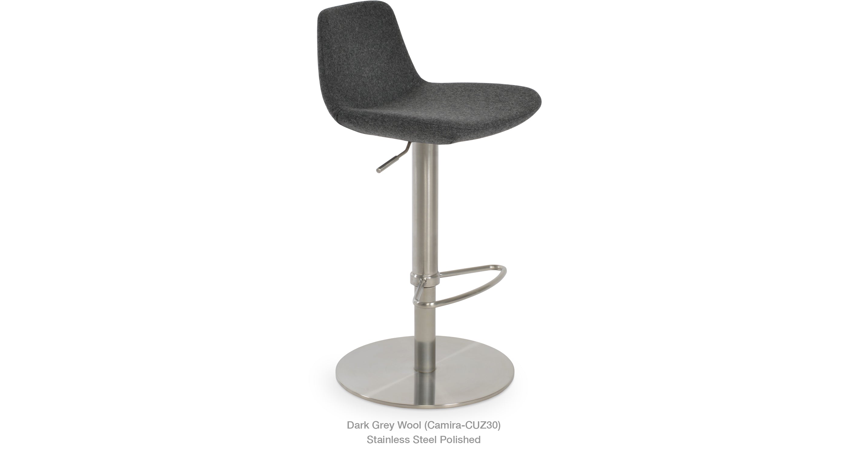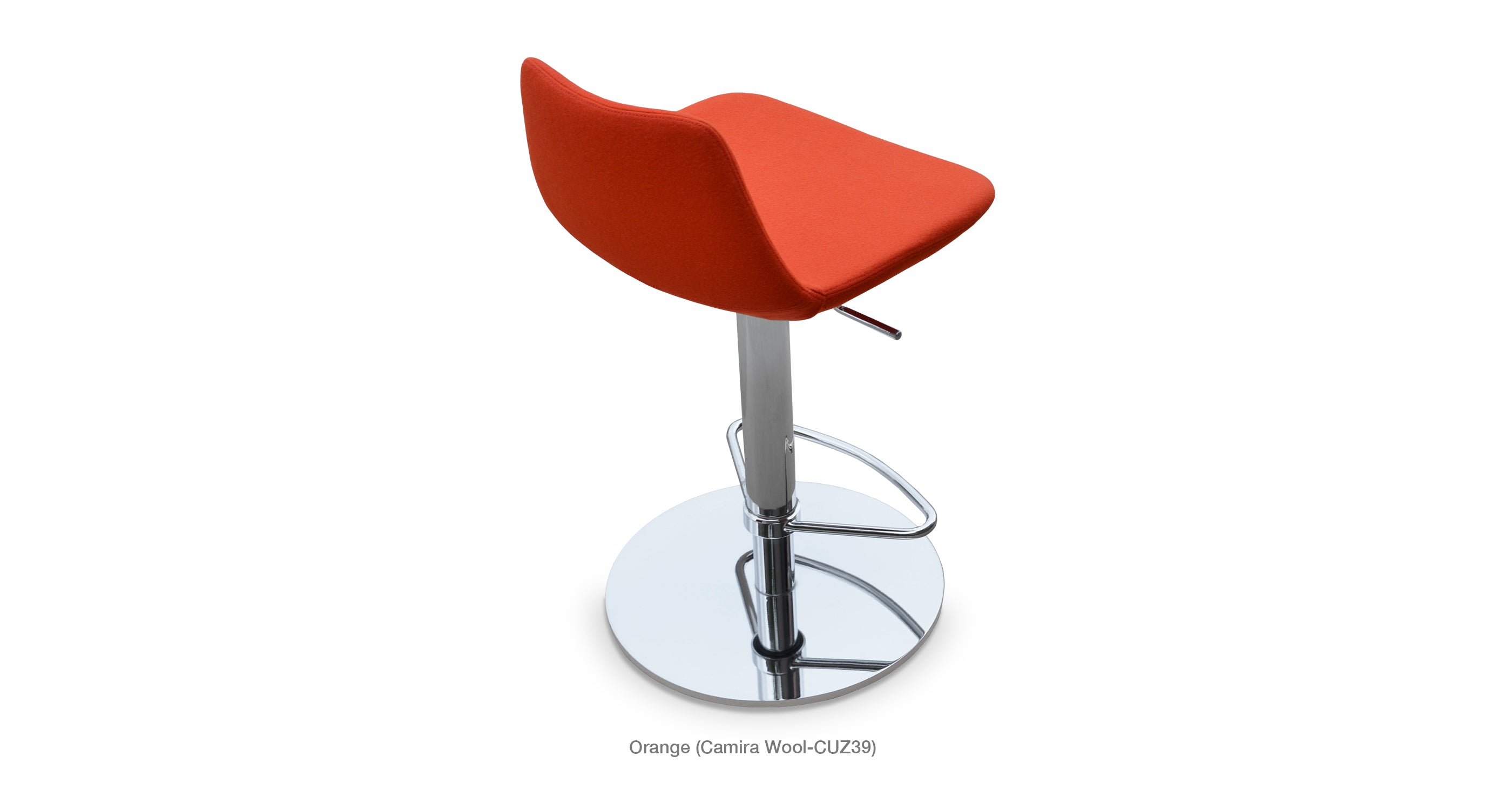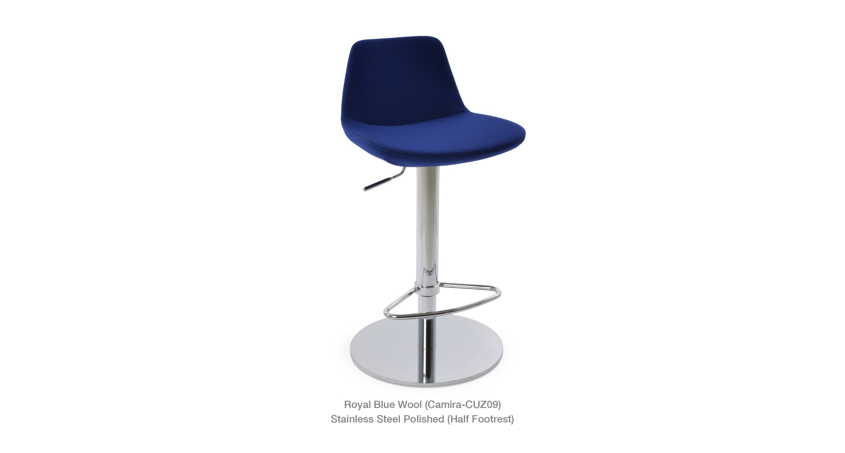 Pera Piston Half Footrest is a unique stool with a comfortable upholstered seat and backrest on an adjustable gas piston base which swivels and also adjusts easily from a counter height to a bar height with a lever that activates the gas piston mechanism. The solid steel round base is available in chrome or stainless steel. The seat has a steel structure with “S” shape springs for extra flexibility and strength. This steel frame molded by injecting polyurethane foam. Pera seat is upholstered with a removable velcro enclosed leather, PPM or wool fabric slip cover. The stool is suitable for both residential and commercial use.
