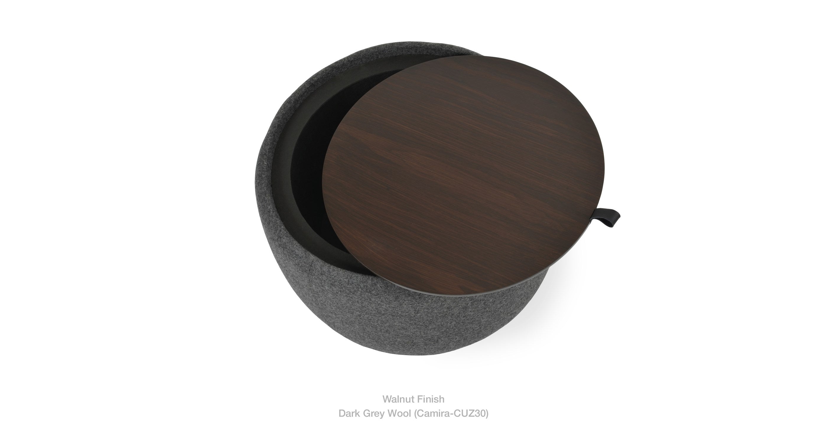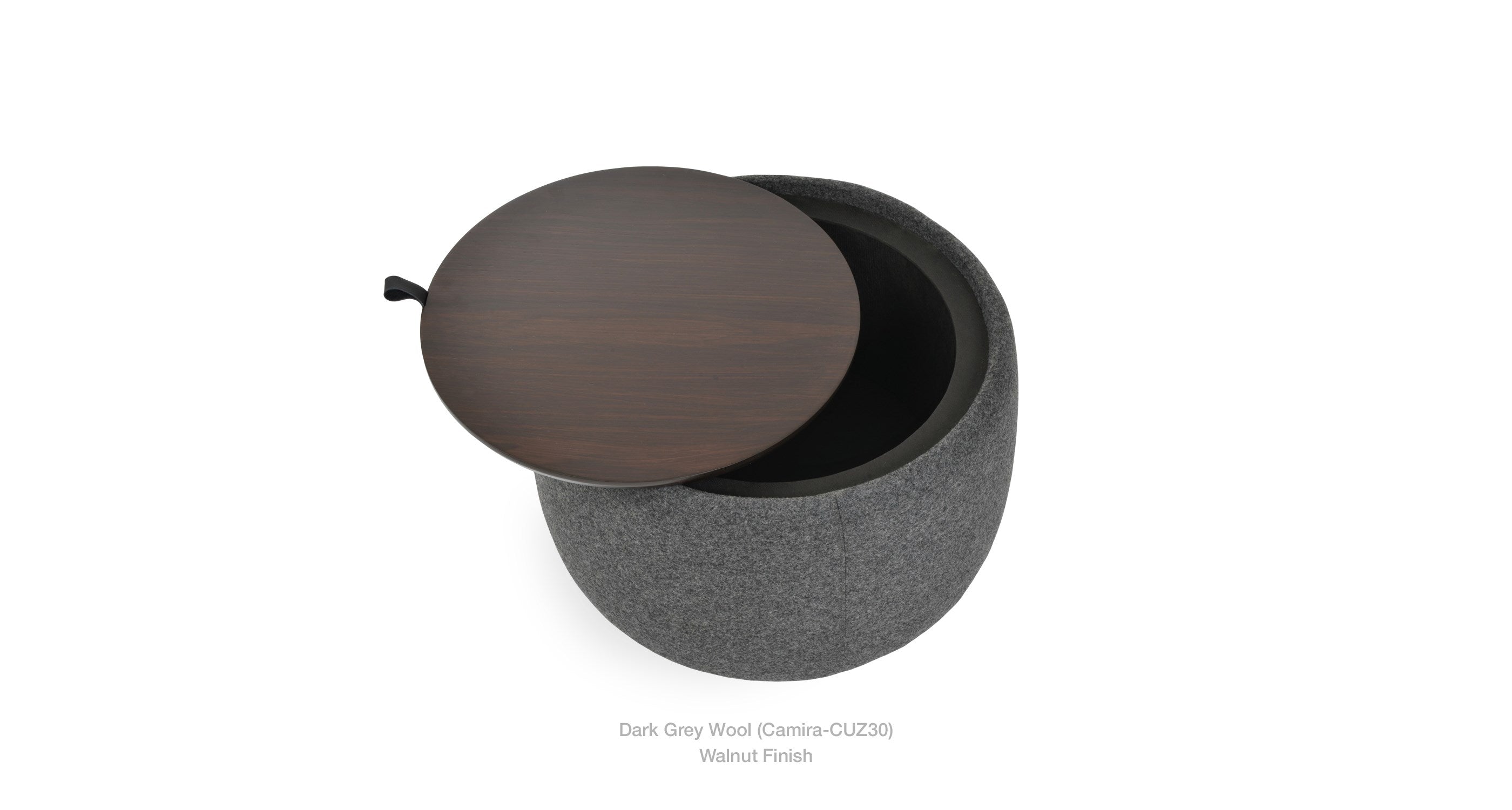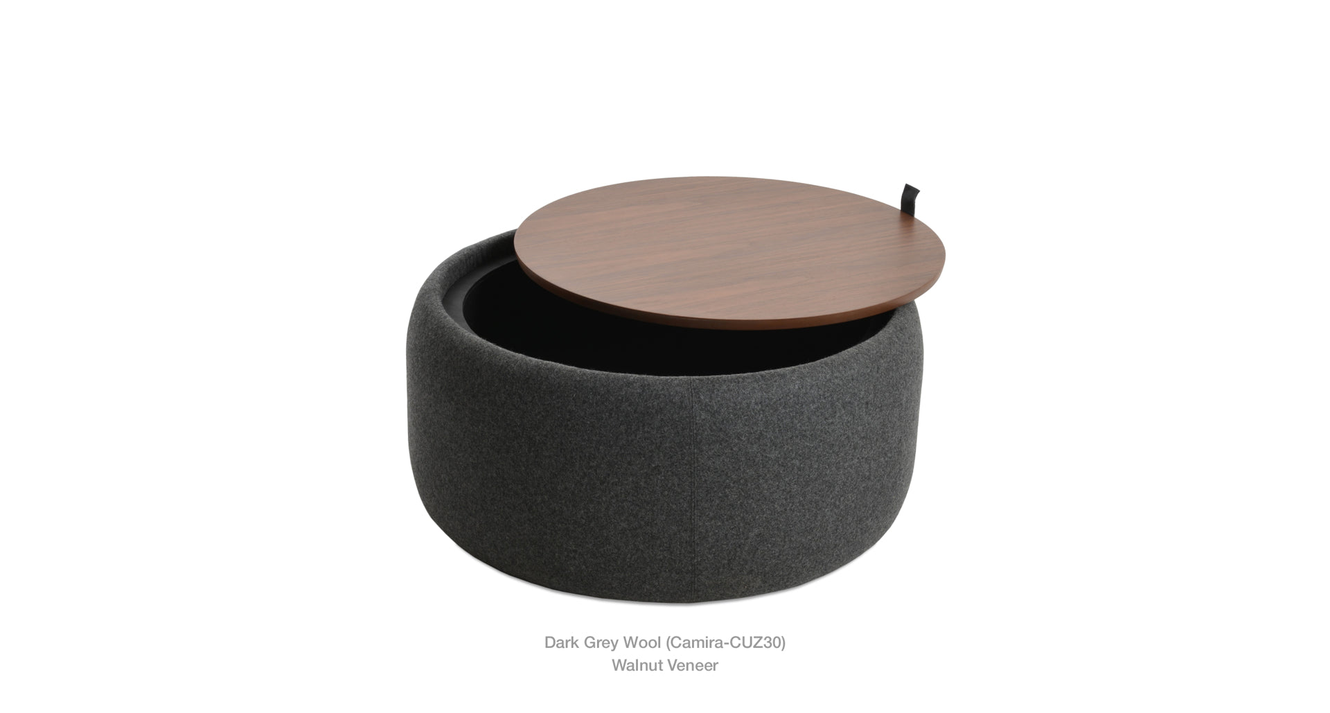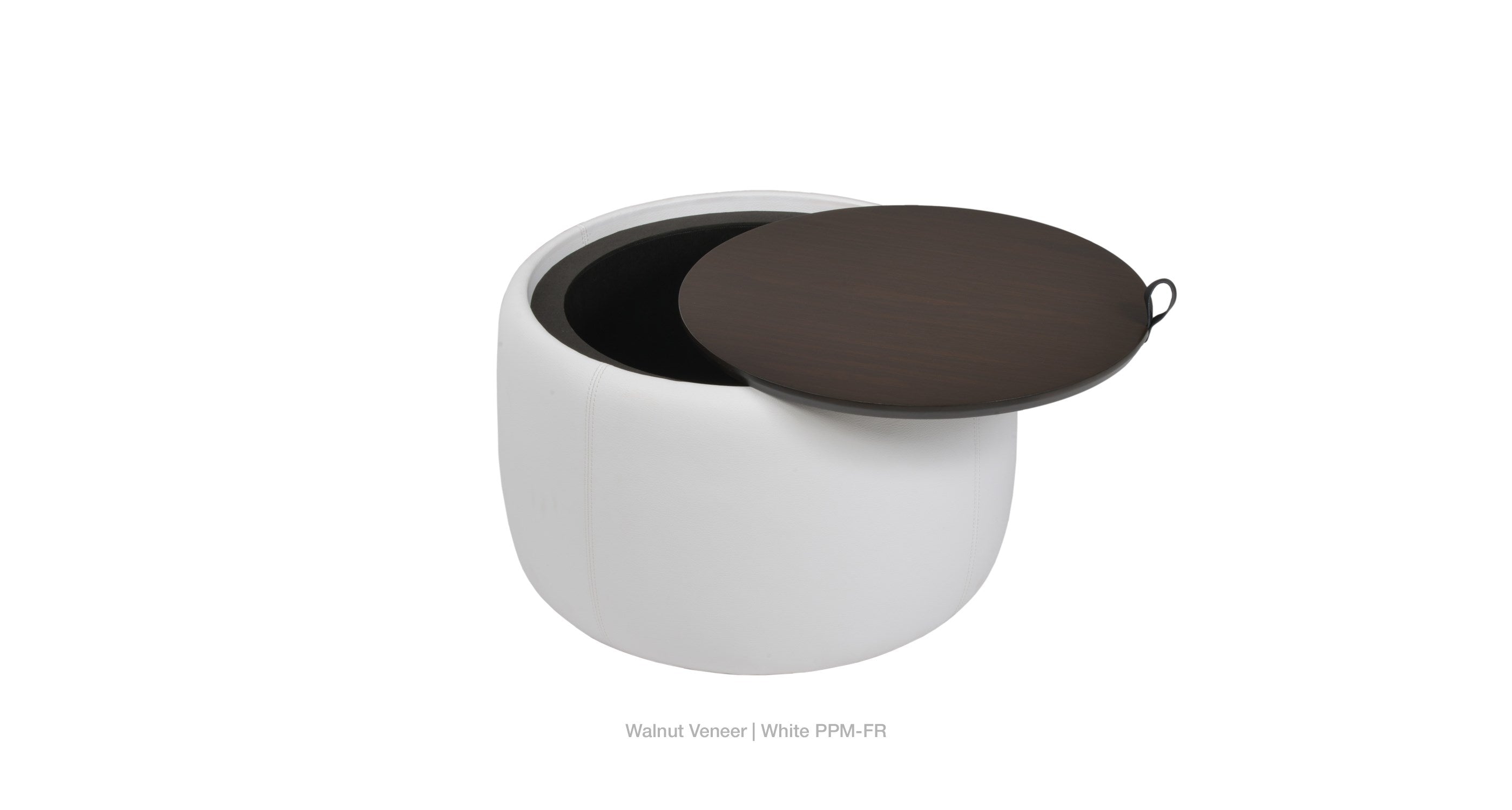 Curvy and little, Planet Ottoman / storage / coffee table can serve as additional seating or provide convenient table top space in any living space. Small in size but refined in detail, the ottoman is upholstered in PPM, Camira Wool and Boucle Fabric that comes with five castors on the bottom for easy maneuvering. The top of the ottoman is beech wood finished in walnut and it can easily be lifted via a small PPM strap detailing and can be used as storage item.
