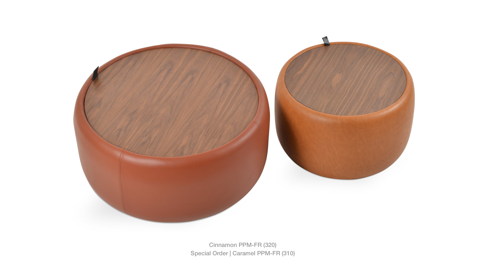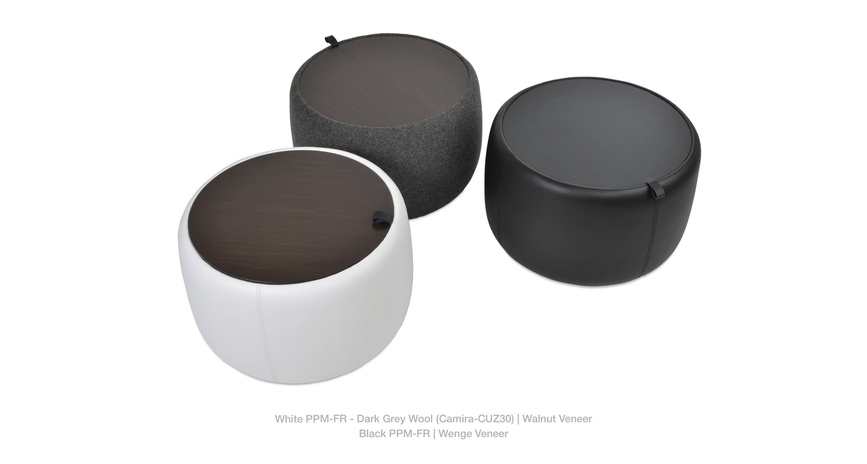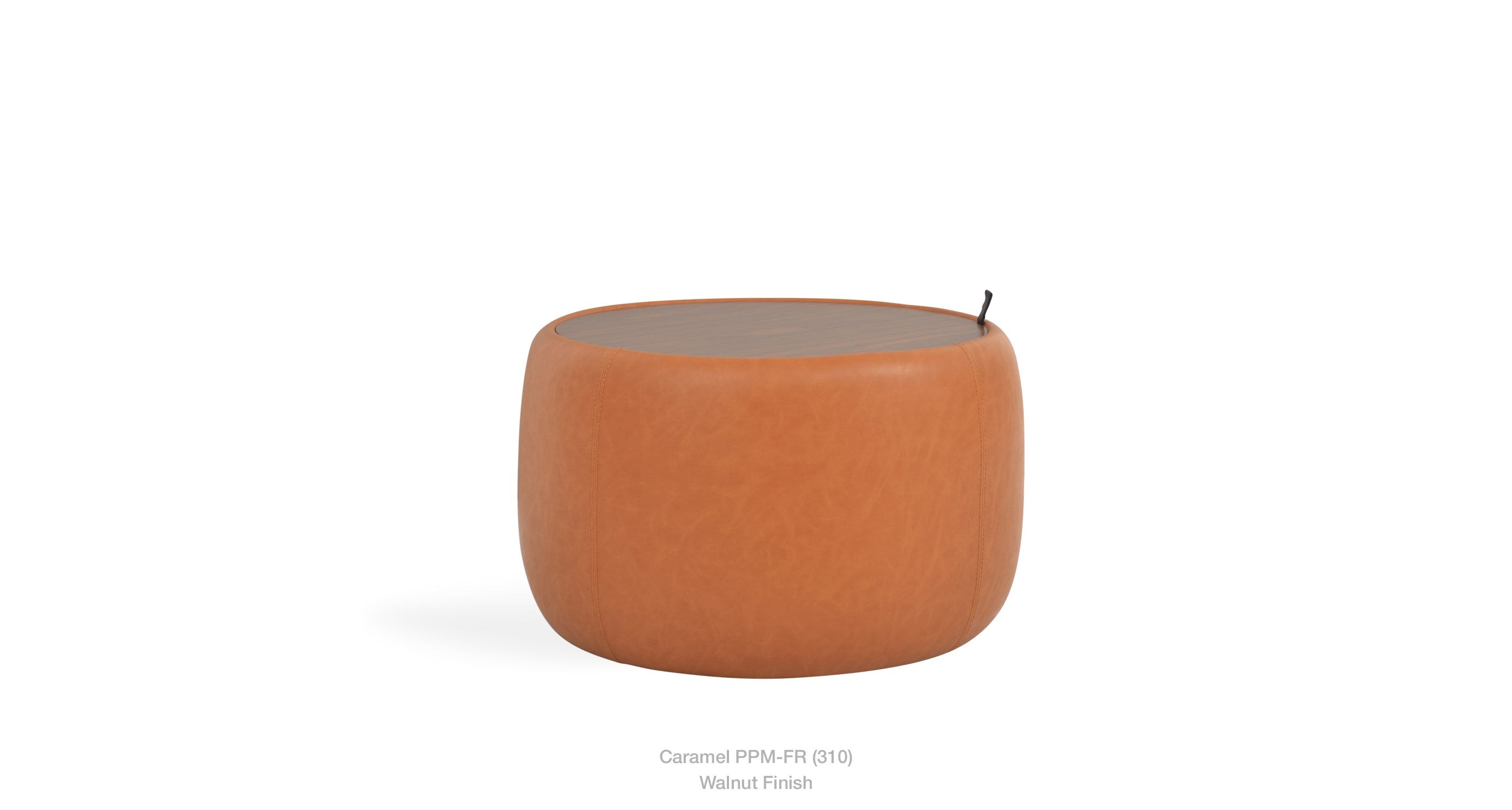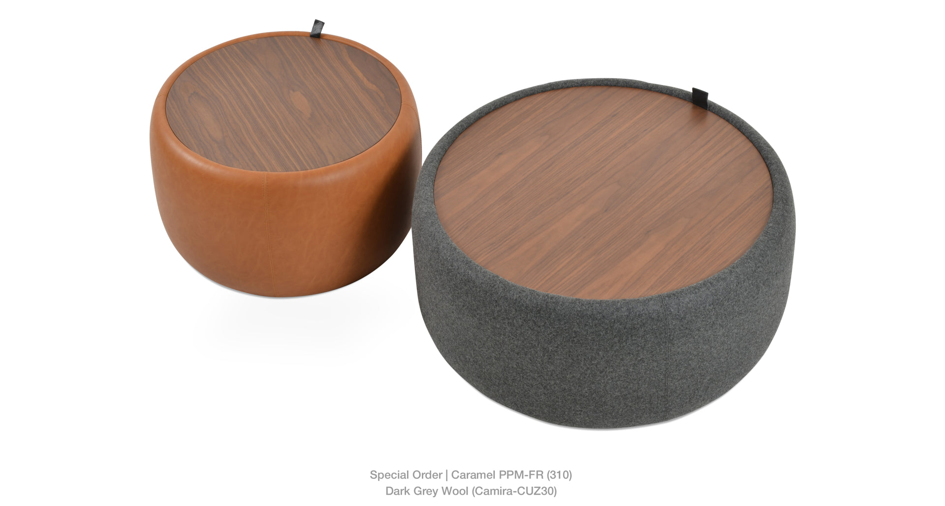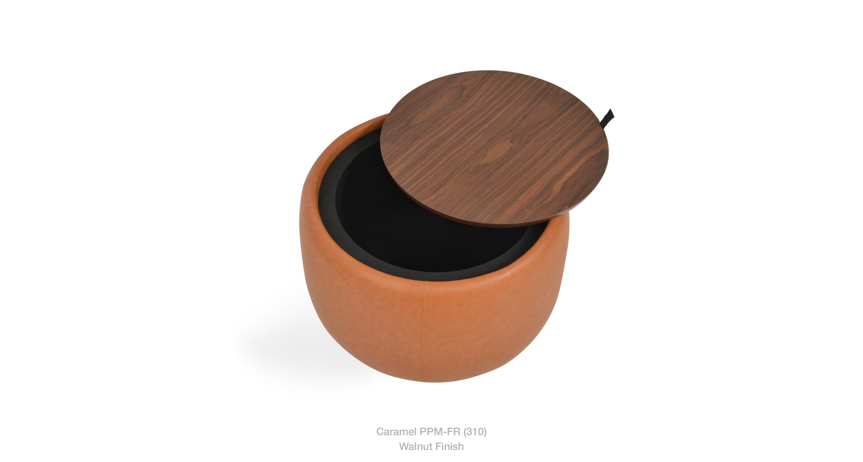 Curvy and little, Planet Ottoman / storage / coffee table can serve as additional seating or provide convenient table top space in any living space. Small in size but refined in detail, the ottoman is upholstered in PPM, Camira Wool and Boucle Fabric that comes with five castors on the bottom for easy maneuvering. The top of the ottoman is beech wood finished in walnut and it can easily be lifted via a small PPM strap detailing and can be used as storage item.
