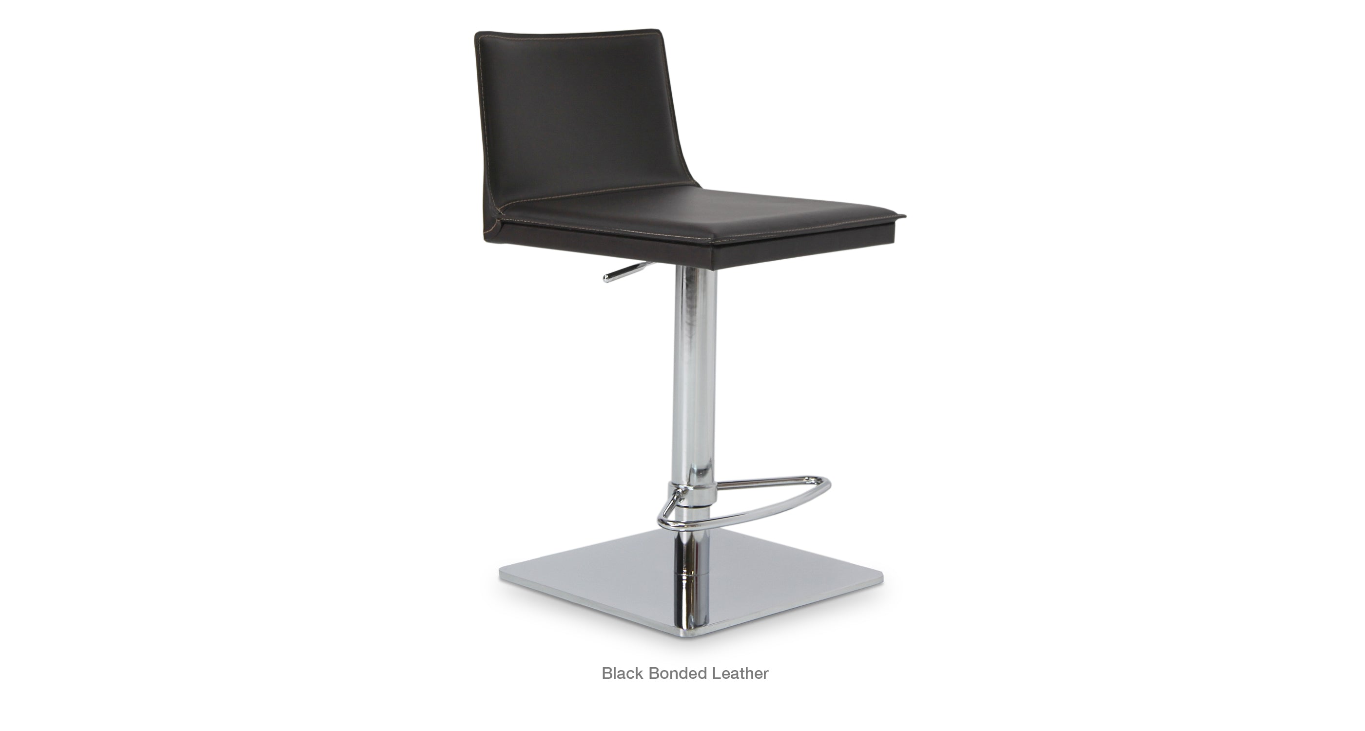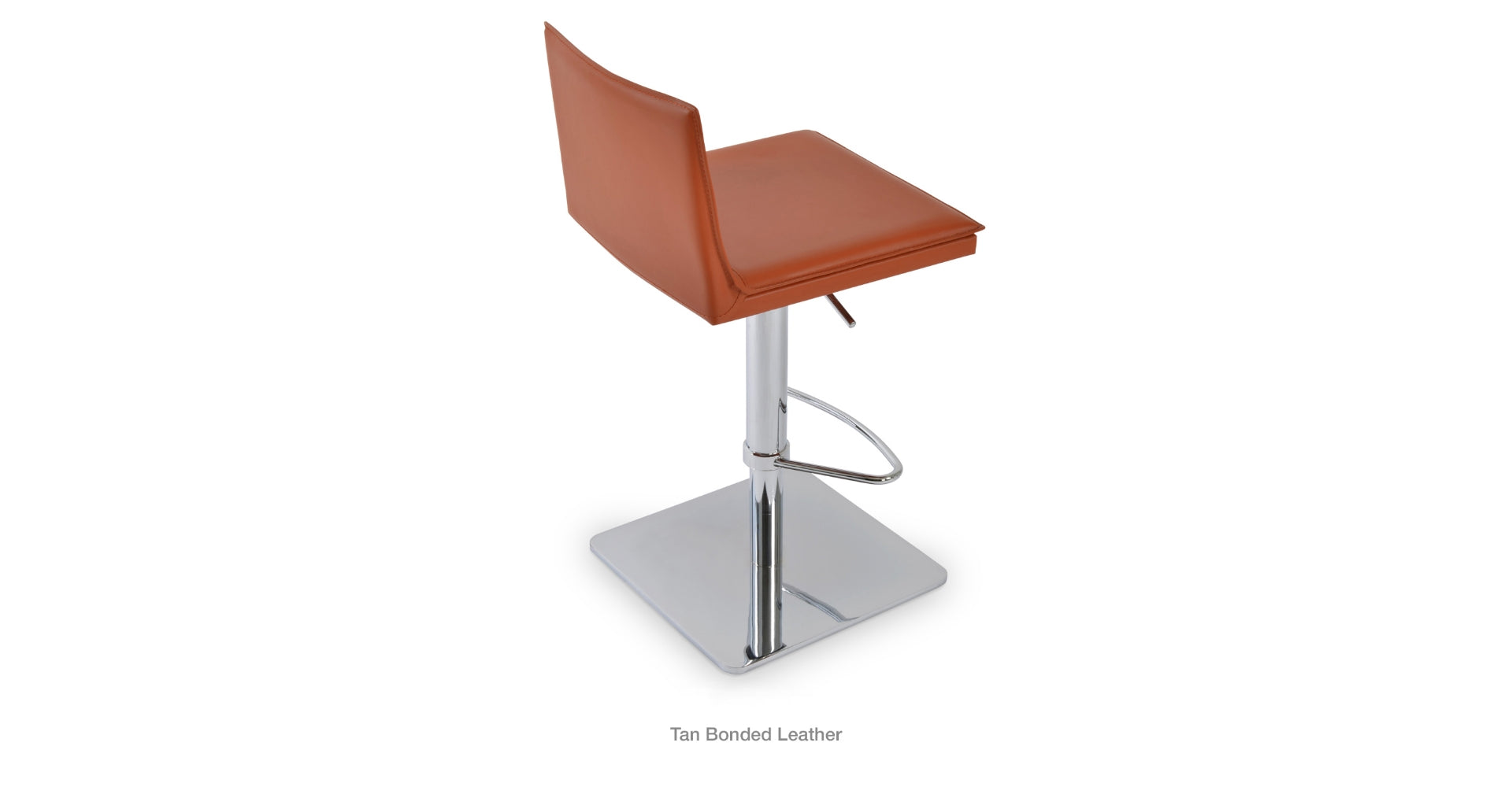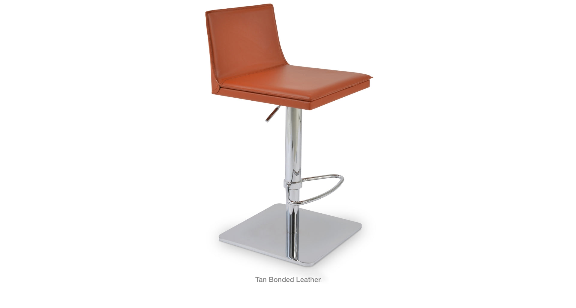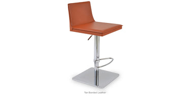 Tiffany piston is a contemporary stool with a comfortable upholstered seat and backrest on an adjustable gas piston base which swivels and also adjusts easily from a counter height to a bar height with a lever that activates the gas piston mechanism. The solid steel square base is available in polished and brushed stainless steel. The stool has a slightly padded seat and chromed steel footrests. The seat is upholstered with regenerated leather only. The stool is suitable for both residential and commercial use.