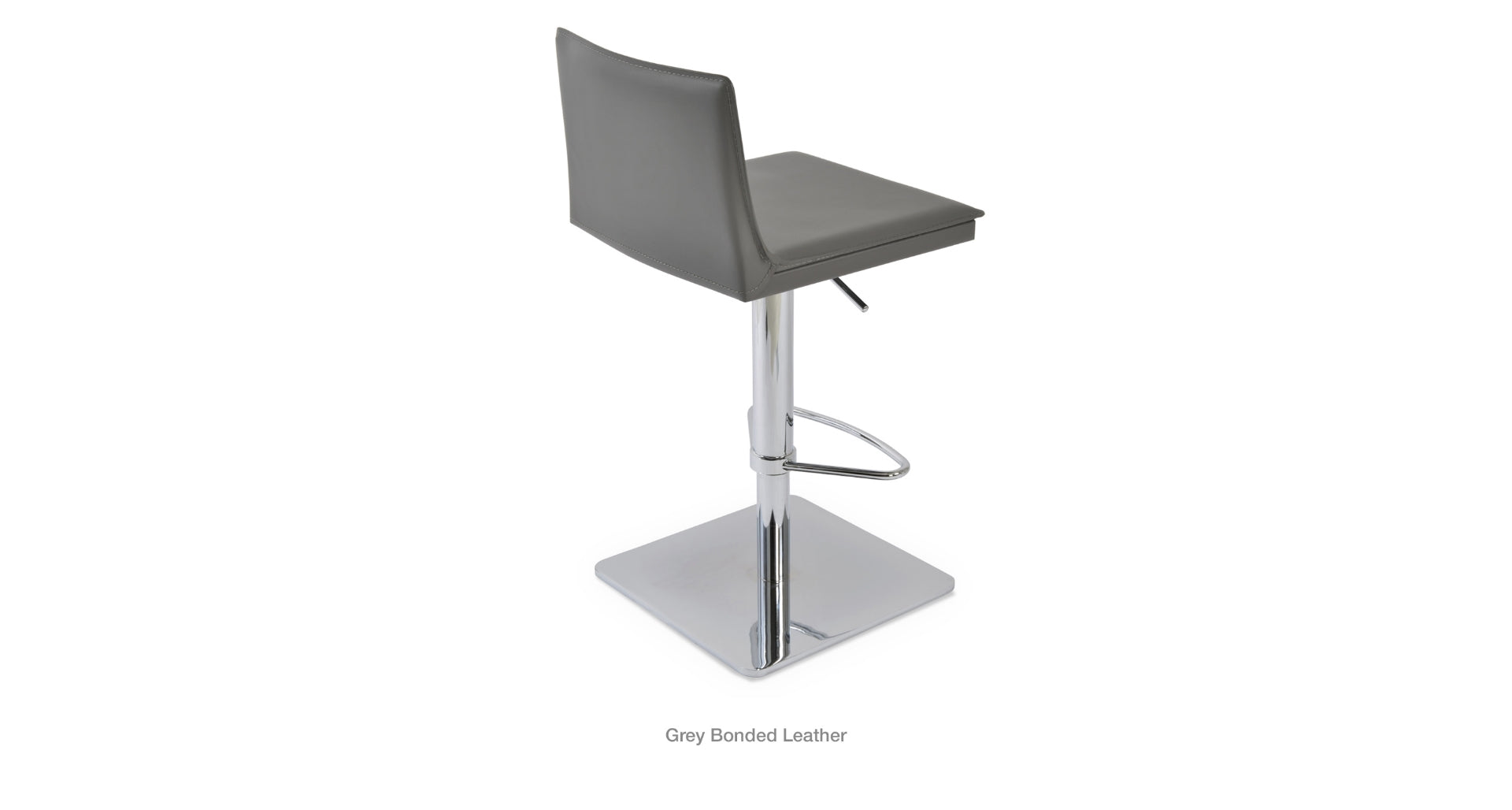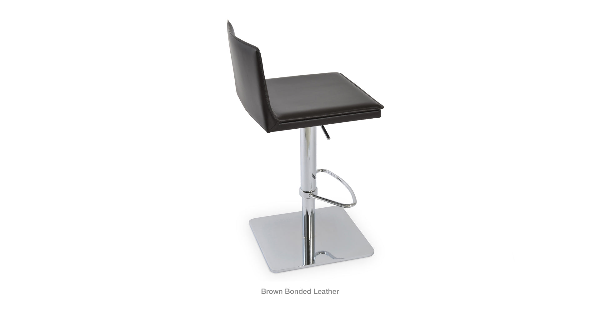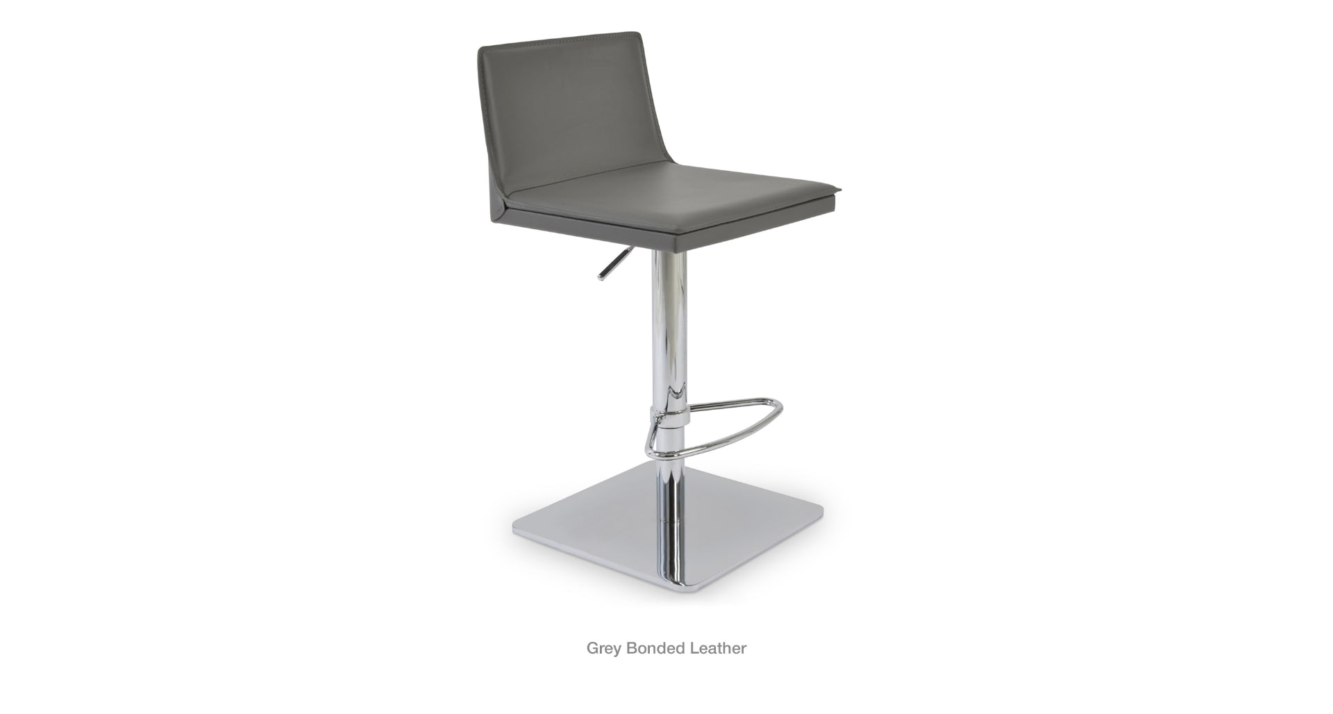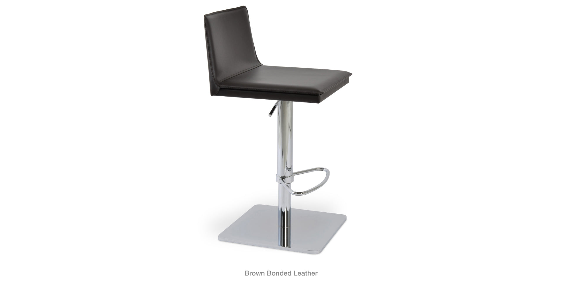 Tiffany piston is a contemporary stool with a comfortable upholstered seat and backrest on an adjustable gas piston base which swivels and also adjusts easily from a counter height to a bar height with a lever that activates the gas piston mechanism. The solid steel square base is available in polished and brushed stainless steel. The stool has a slightly padded seat and chromed steel footrests. The seat is upholstered with regenerated leather only. The stool is suitable for both residential and commercial use.