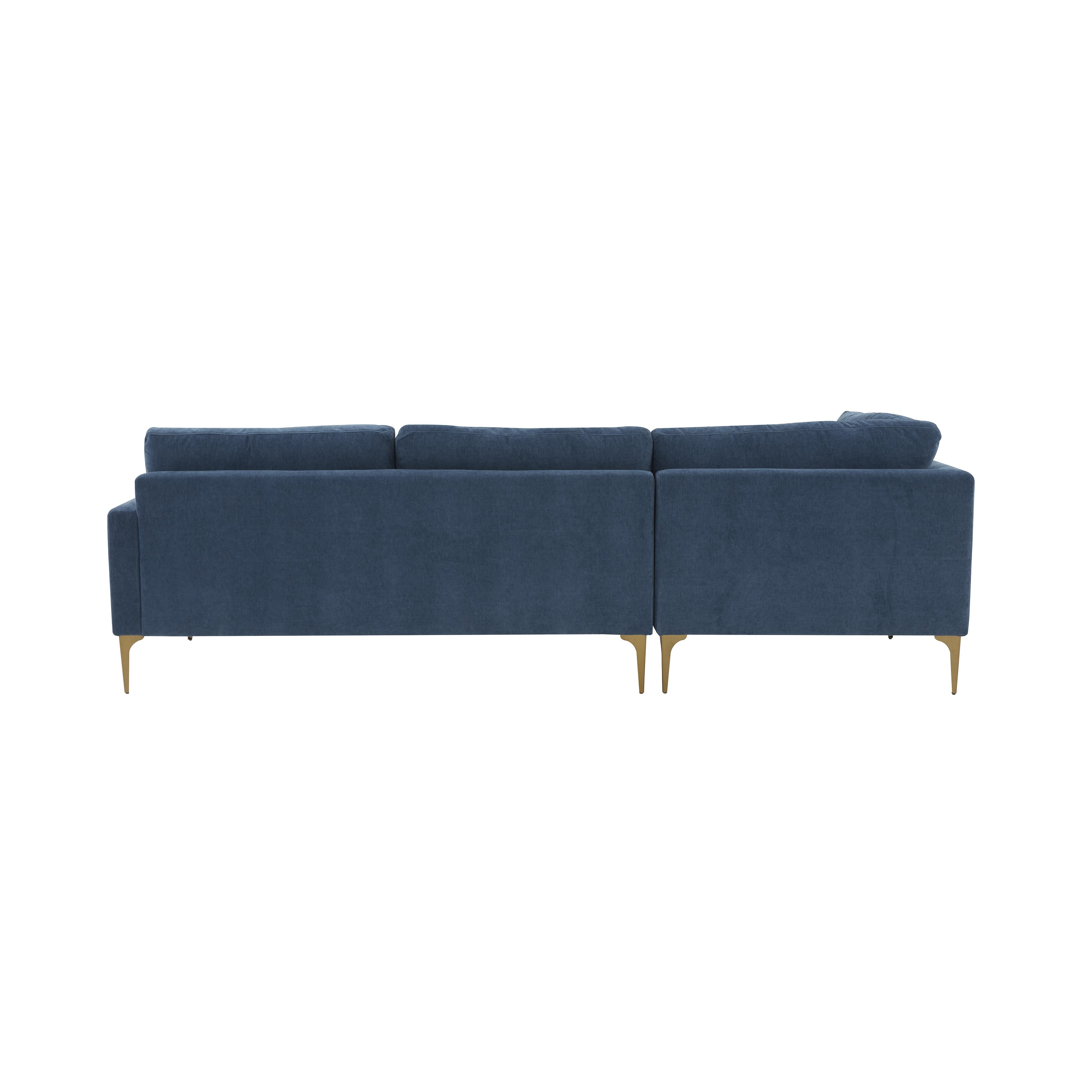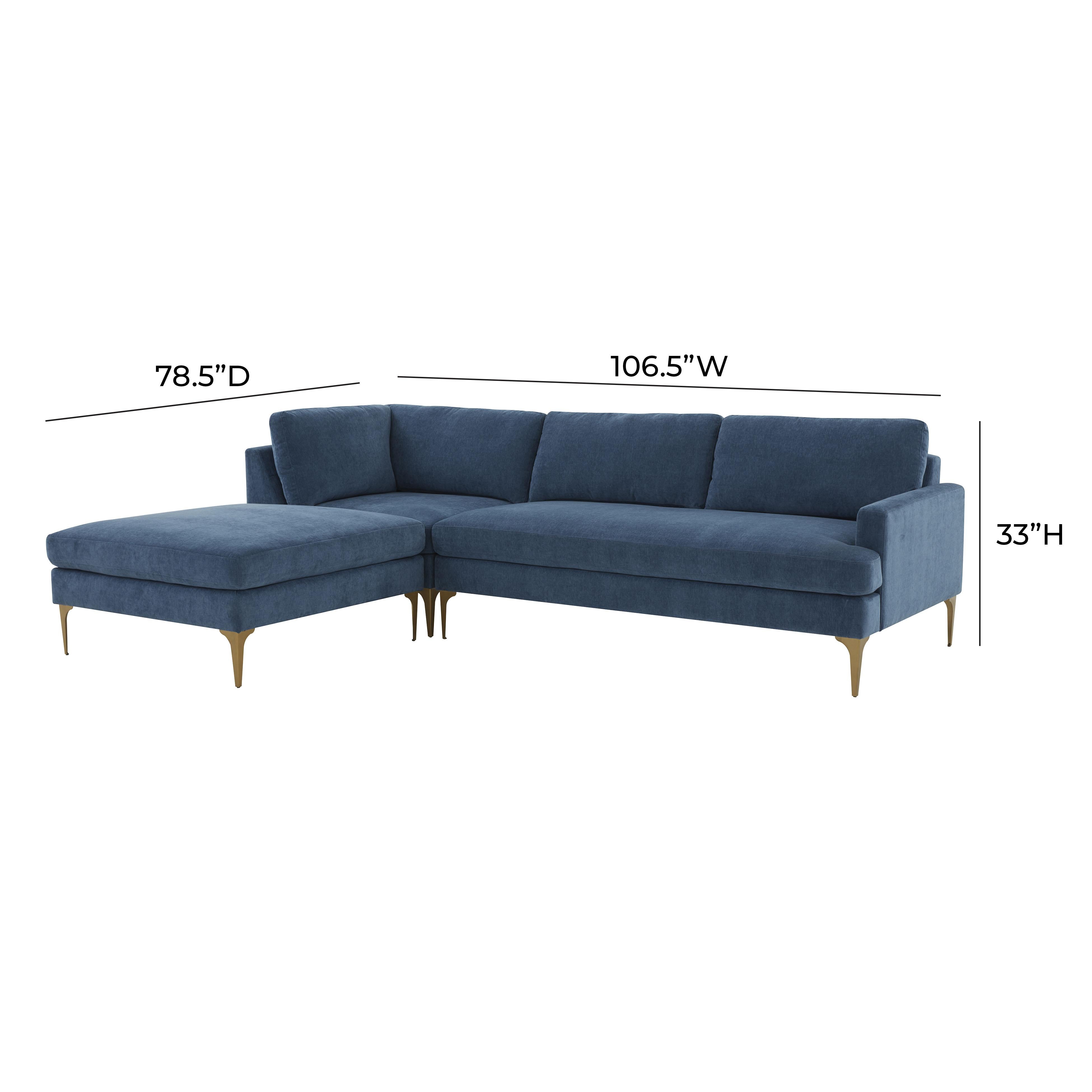 The Serena Collection makes modern design soft and cozy and is sure to become your favorite spot. This 3-piece sectional—right-arm loveseat, corner chair, and ottoman—is upholstered in a luxurious blue distressed velvet for lots of texture, and is available in three colors. The clean lines are complemented by tall metal legs finished in brass. Enjoy our preset configurations or customize your own design - the Serena is the sectional you have been looking for.