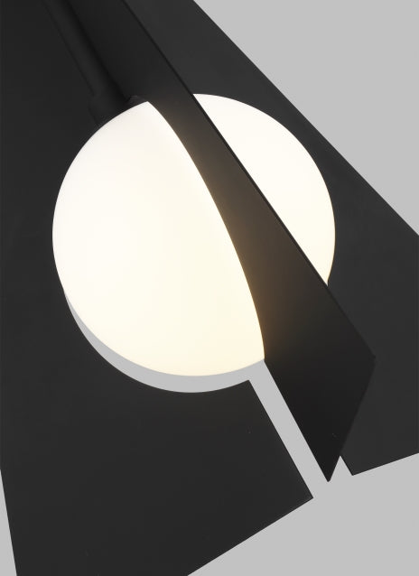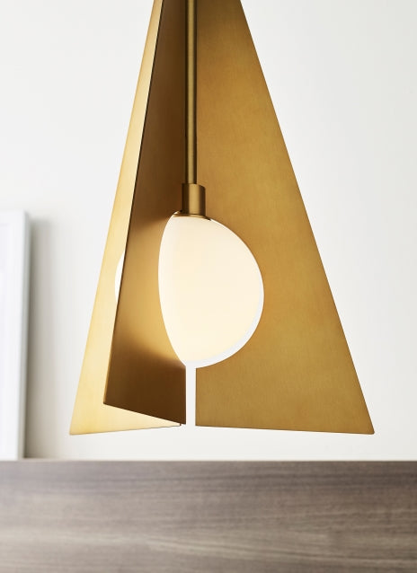 The Orbel Pyramid Grande Pendant by Visual Comfort Modern, designed by Sean Lavin, draws inspiration from Mid-Century modern art, featuring intersecting metal triangles that encase a frosted glass globe. Measuring 25 inches in height and 17.8 inches in width, this line-voltage pendant is ideal for dining rooms, entryways, or living areas. It accommodates a 60W E26 medium base lamp (not included) and is compatible with most ELV and TRIAC dimmers. The fixture includes adjustable stems for customizable hanging lengths and is available in finishes like Natural Brass and Nightshade Black.