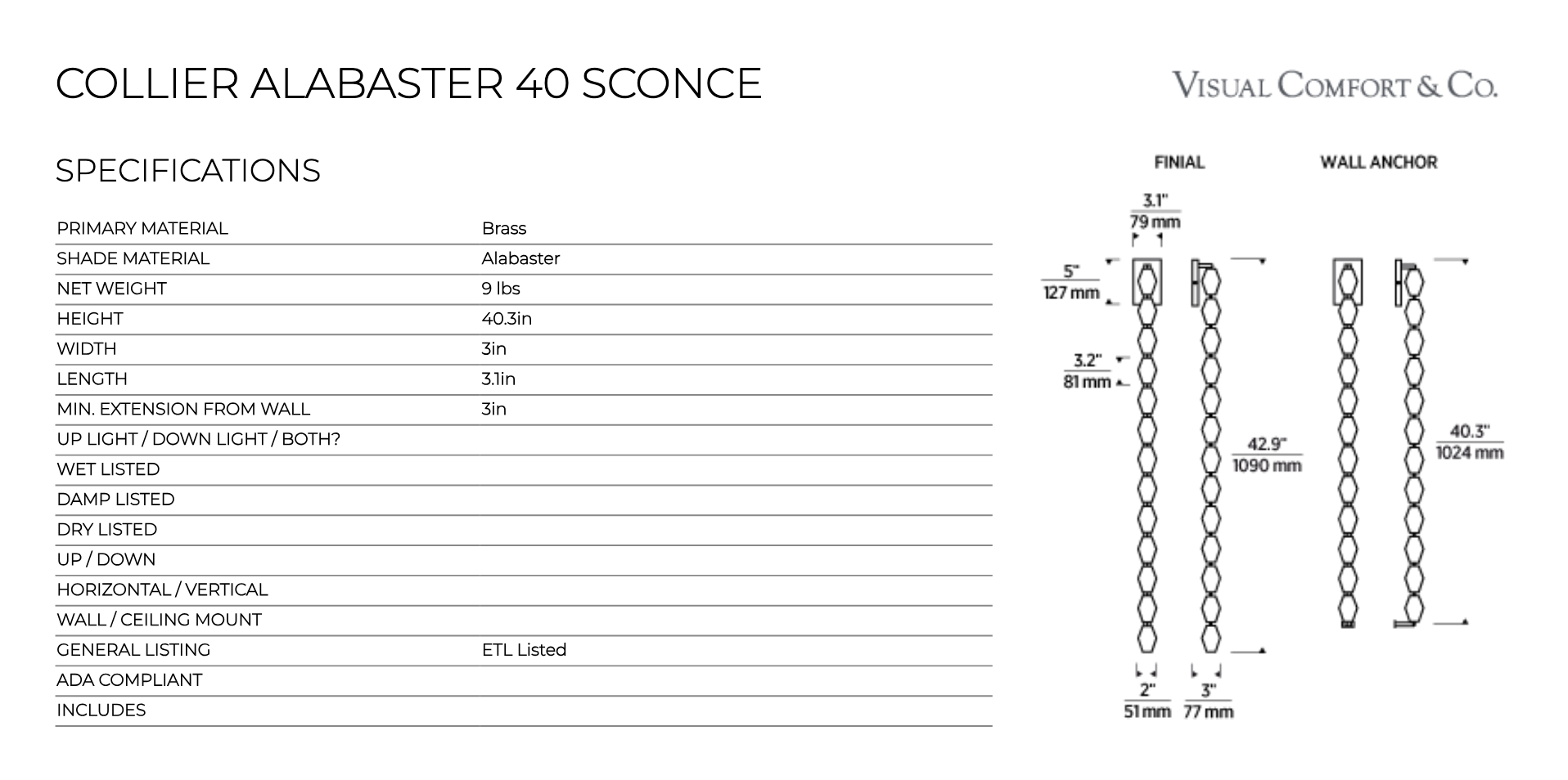 Collier Alabaster 40-inch Dimmable LED Wall Sconce by Visual Comfort _ NEW