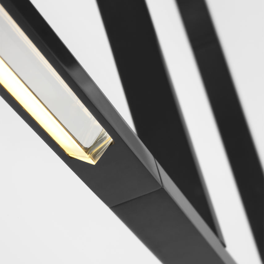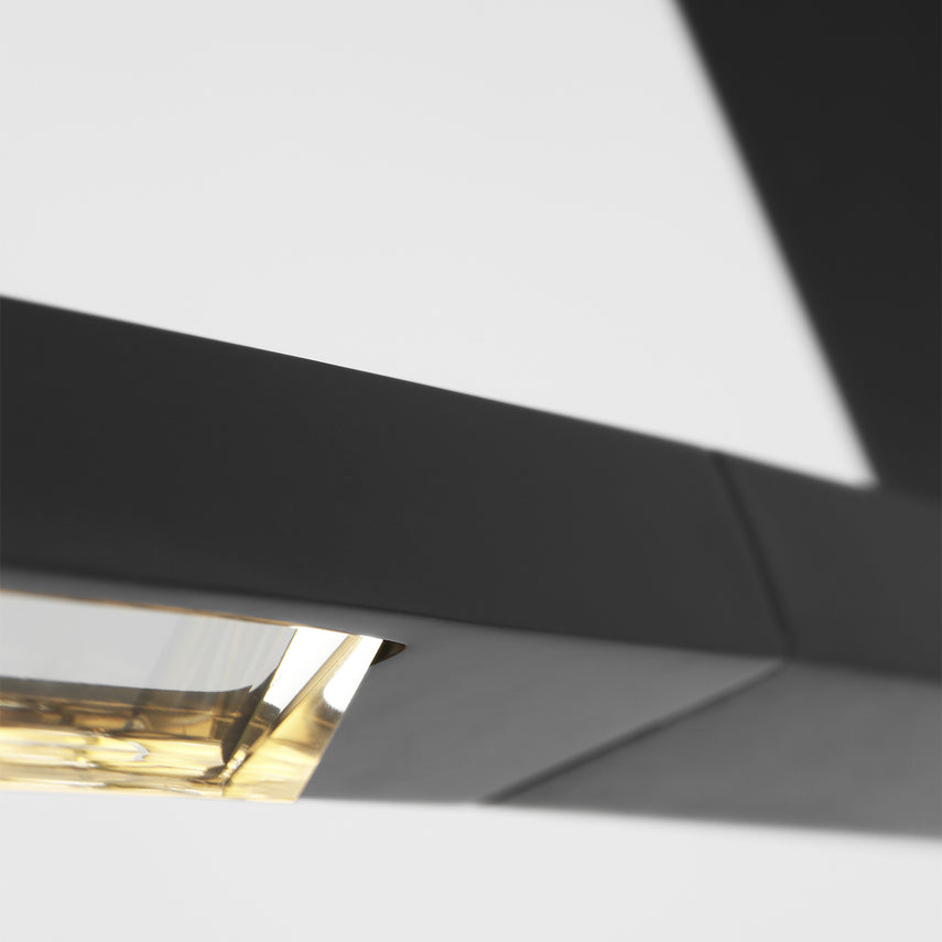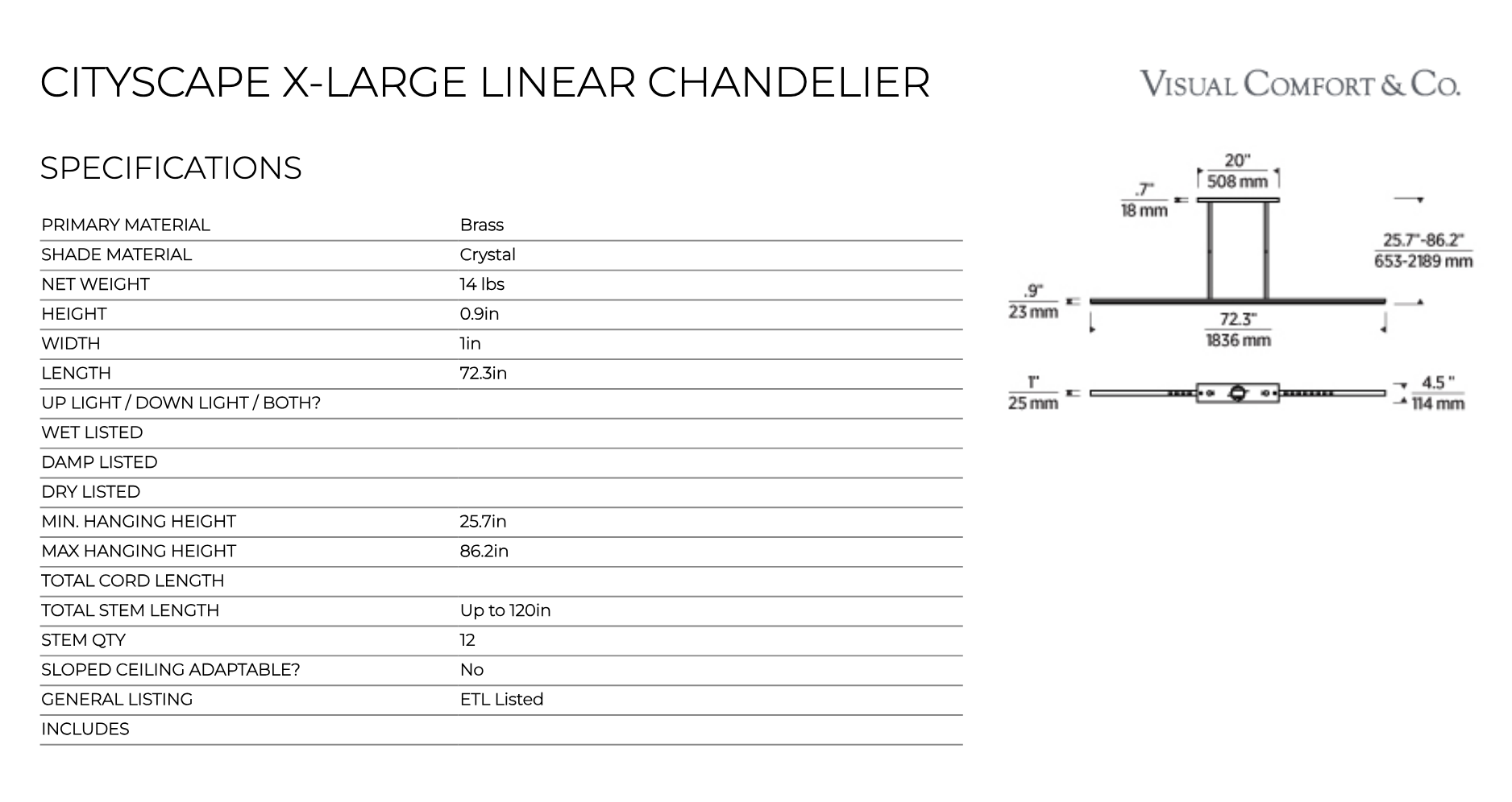 Crafted by Sean Lavin for Visual Comfort, the Cityscape X-Large 72" Linear Chandelier is a standout fixture featuring a geometric brass frame and crystal shades. Its integrated LED design and adjustable hanging height make it ideal for large dining areas, modern living rooms, and commercial interiors.