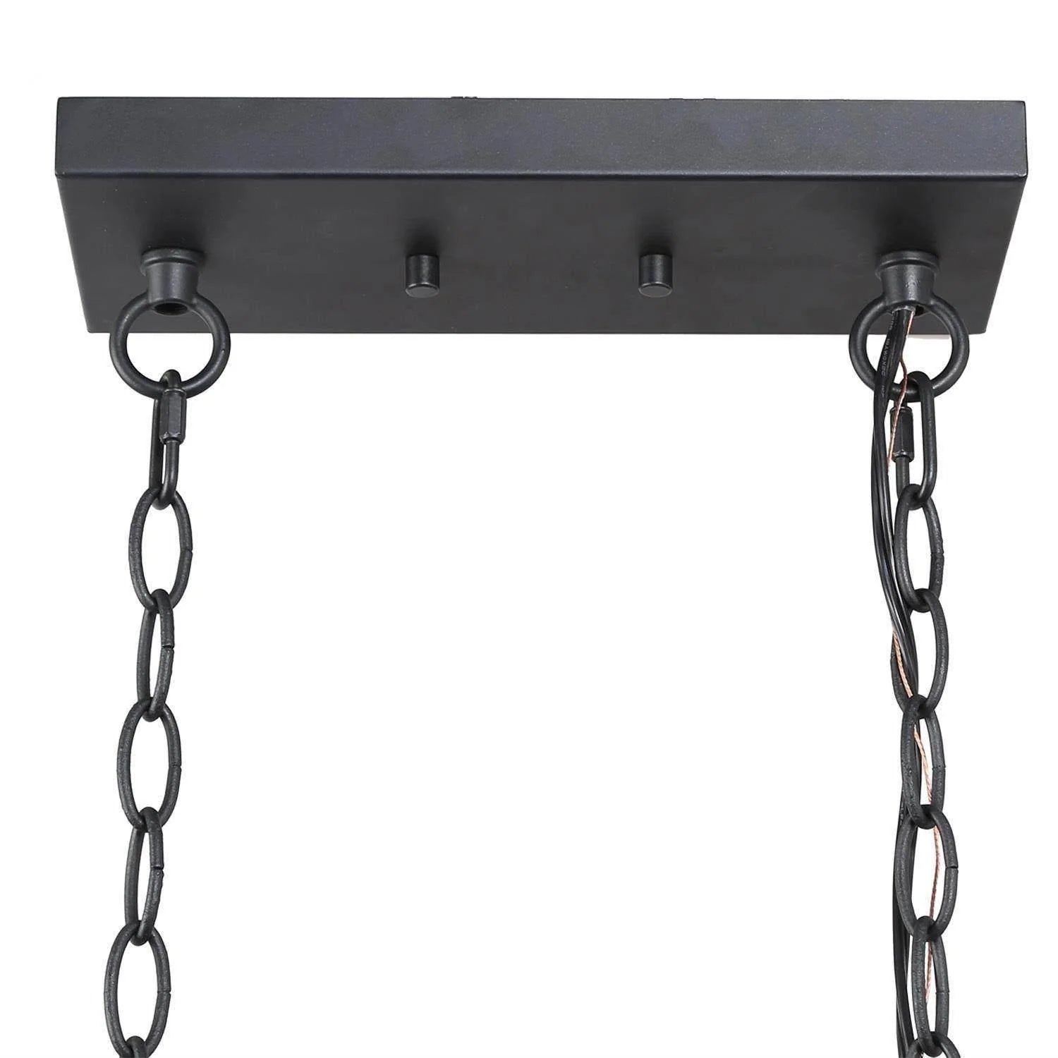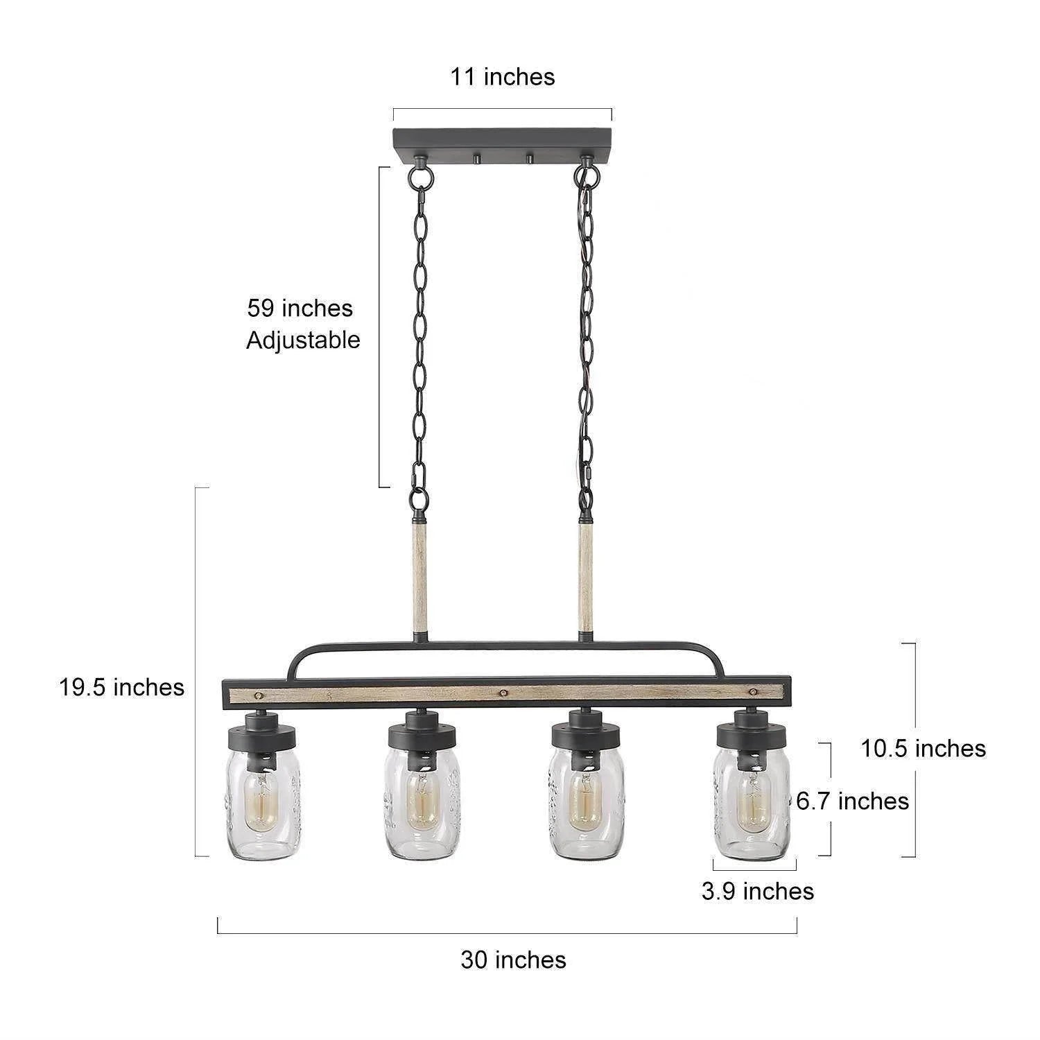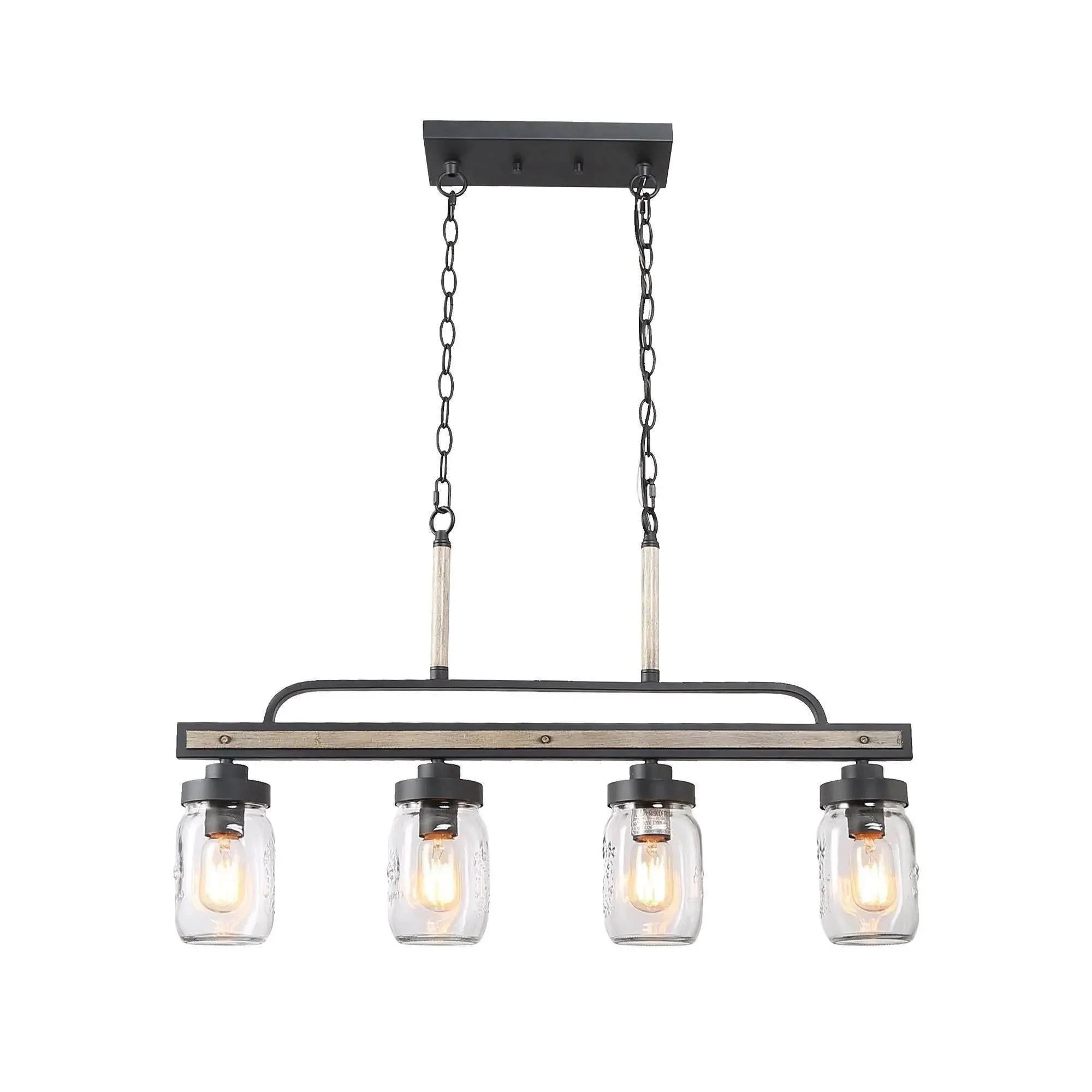 Bring warm, balanced lighting and modern rustic character to kitchen islands, dining rooms, living rooms, bedrooms, offices, entryways, restaurants, and boutique hotels with this four-light chandelier. Clear jar-style glass shades pair with sturdy metal in an aged gray and wood-texture finish, while black ironwork adds crisp contrast. Designed for four E26 medium-base bulbs (40W max each) on 120V circuits, this fixture is dry-rated, dimmable with a compatible switch (not included), and sloped-ceiling ready. A 59" chain and adjustable hanging height (23.5"–79.5") make installation flexible; the UL listing offers peace of mind. Sized at 30"W × 19.5"H with a 3.9" extension and a low-profile rectangular canopy, it’s a stylish, practical choice for everyday spaces.