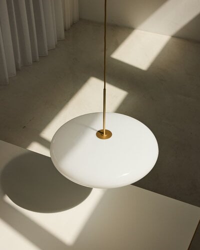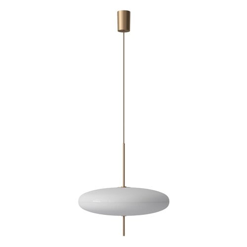 The Model 2065 is made of two joined opaline methacrylate saucer-shaped diffusers, suspended from a black painted aluminum ceiling canopy. The simplicity of the design and lightness of the materials makes for an elegant and free-floating luminaire. The newest version adds to these features in terms of sustainability: the diffusers are made of Green Cast®, a 100% recycled and recyclable PMMA (polymethyl methacrylate) — patented and made in Italy — that has exactly the same aesthetic and functional quality of original methacrylate.