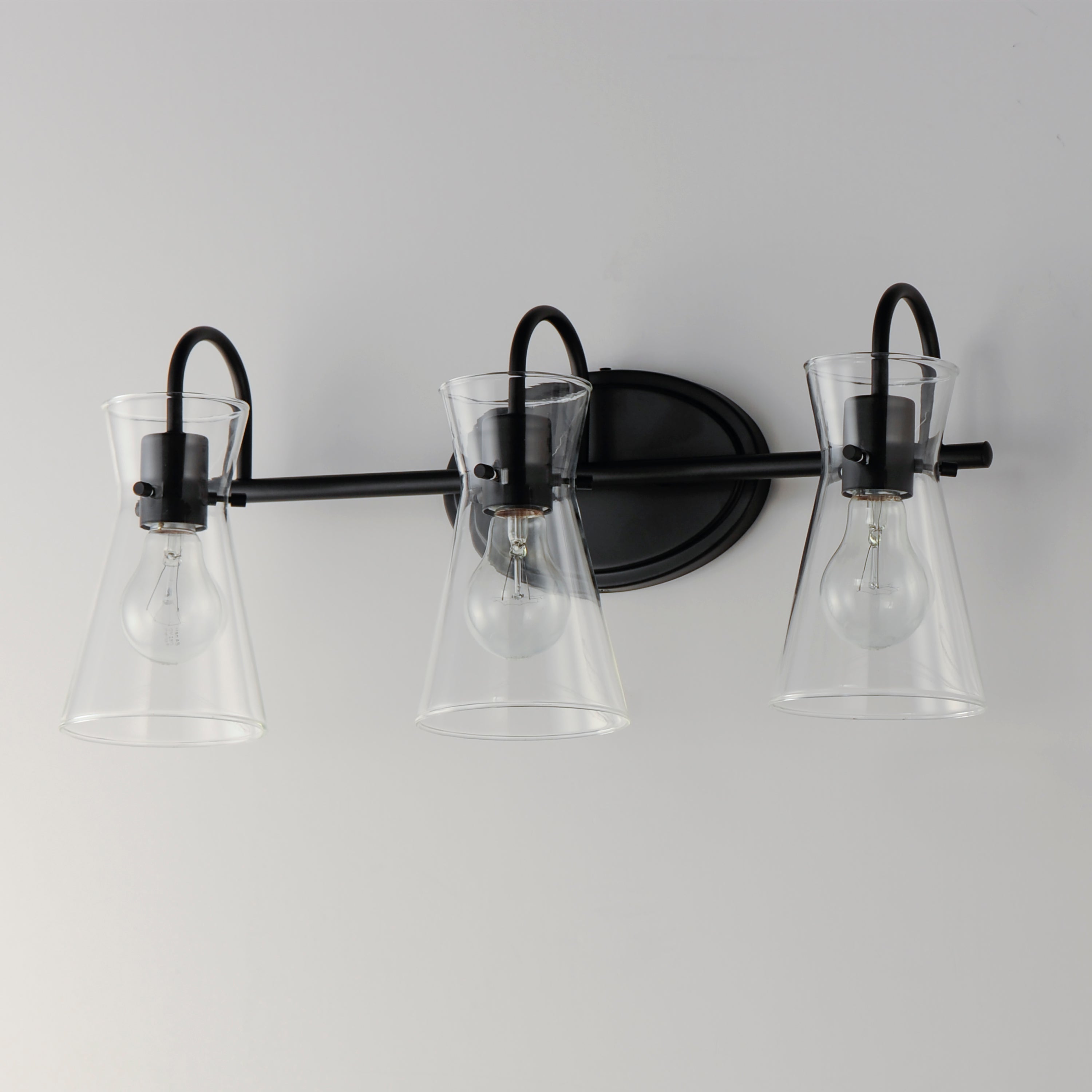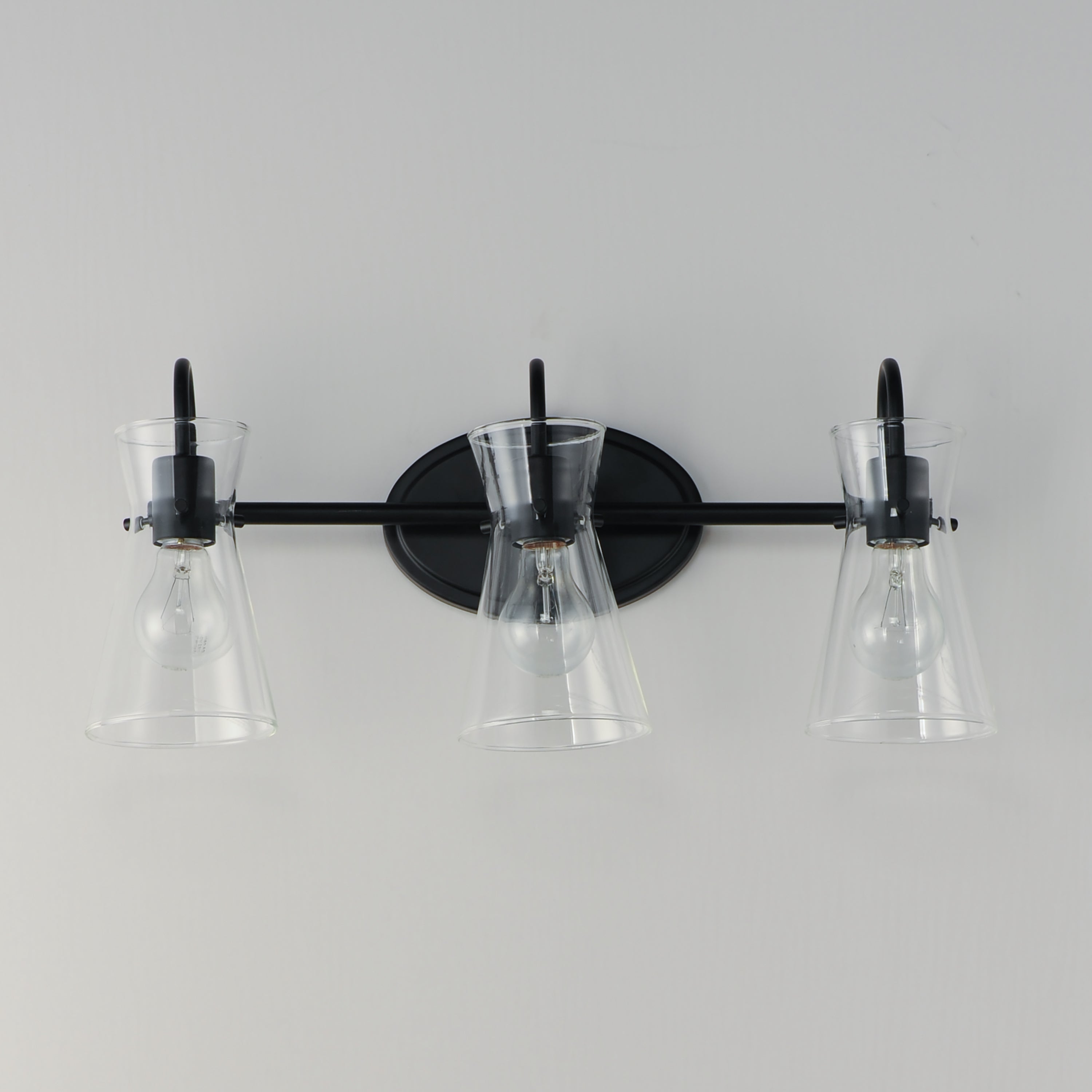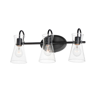 Suspended by three pin connections, the sharp silhouette of Ava's angular glass provides a designer look to enhance your bathroom design. Using Clear glass and a variety of complementary metal finishes the sconces are available in Black, Polished Chrome, or Natural Aged Brass allowing it to pair well with most interior color palettes.