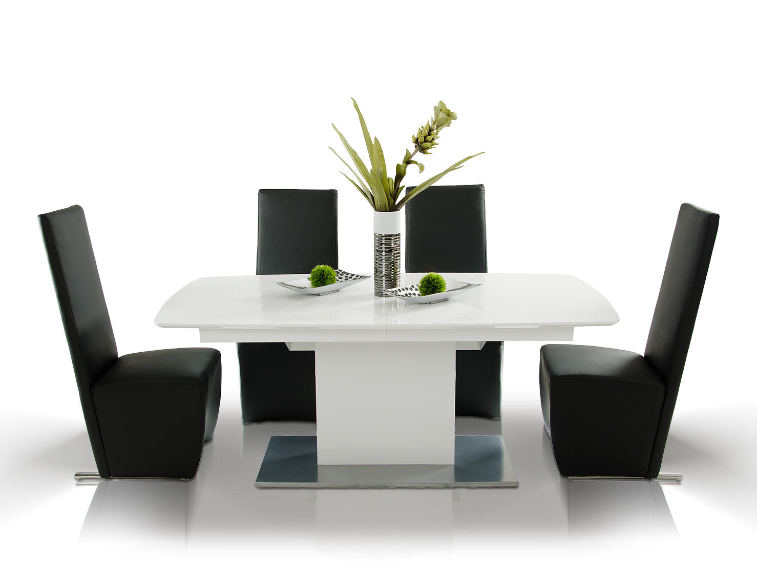 A solid aluminum base supports the Centro dining table. The table top is crocodile textured with a detailed twelve step laser-cut process. It is then treated with a durable white semi gloss lacquer top coat. Matching aluminum accents trim the sides of the Centro. Provide additional room for guests by using the butterfly extension. Matches the A&X Collection. Also available in black and high gloss options.