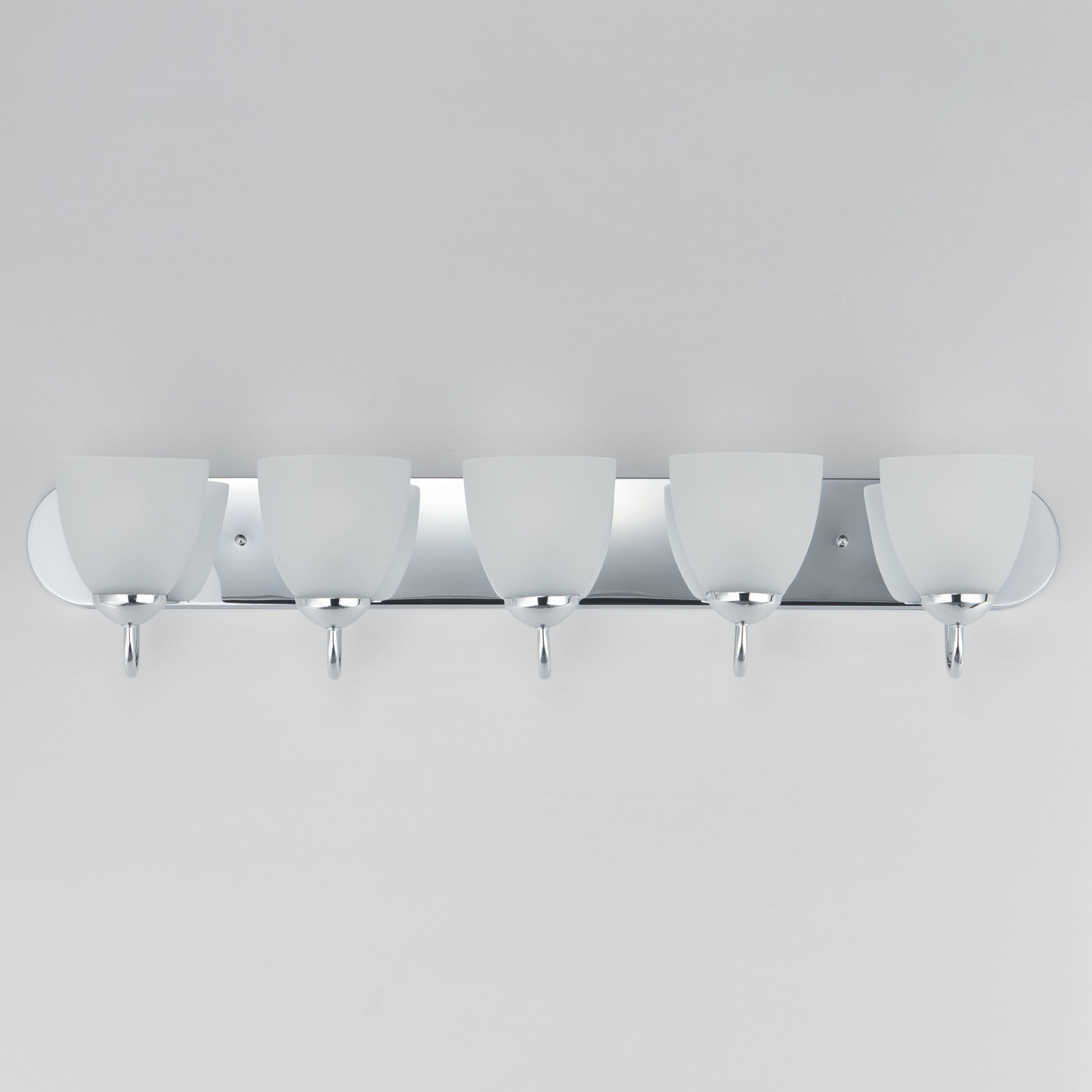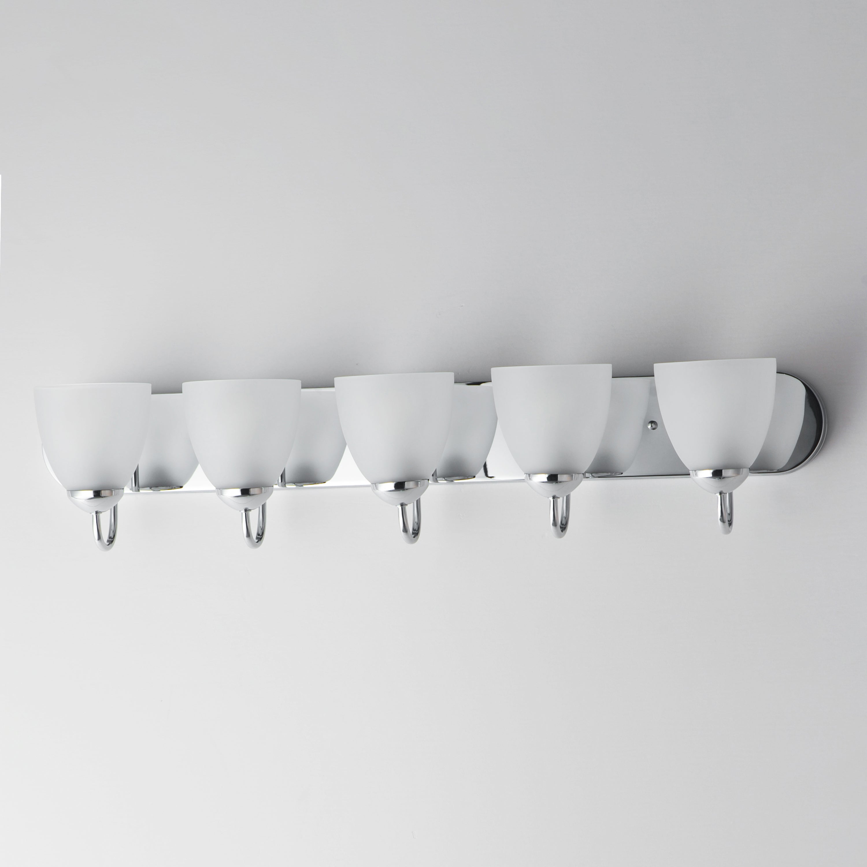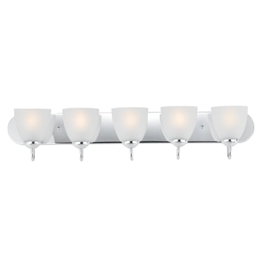 This transitional design works in any style home. Full length oval backplates support simple bell-shaped, Frosted glass shades. Available in Satin Nickel, Matte Black, and Polished Chrome.