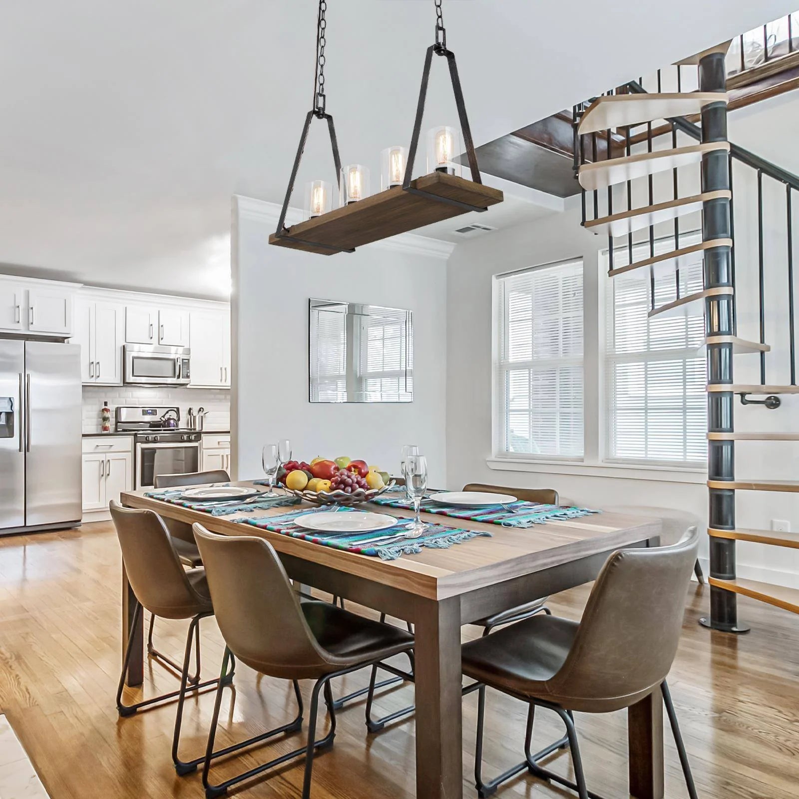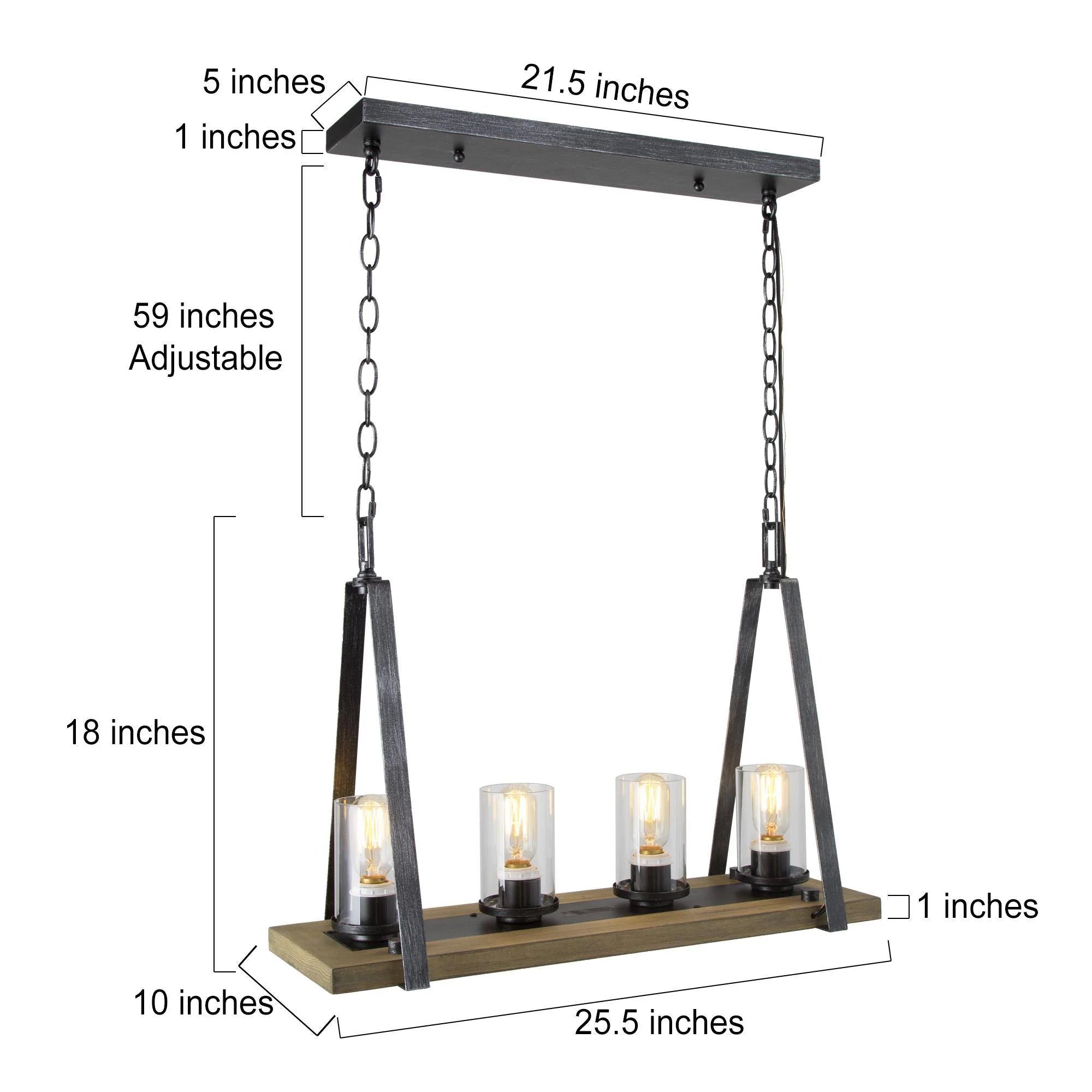 Bring warm, modern-farmhouse character to kitchens, dining rooms, offices, hotel suites, and more with this large linear chandelier featuring a matte-black metal frame accented by a wood-grain texture and four clear glass shades. Designed for standard 120V dry-rated spaces, it uses four E26 medium-base Type-A bulbs (60W max each, bulbs not included) and is dimmable with a compatible switch (not included). A 59" chain supports adjustable hanging heights from 22" to 78" and the sloped-ceiling-ready rectangular canopy installs cleanly. UL listed for peace of mind, this 25.5"W x 18"H x 10"E fixture (13.9 lb) pairs statement style with practical task lighting for kitchen islands, dining tables, breakfast nooks, pantries, study areas, small offices, cafés, bars, and hospitality lounges.