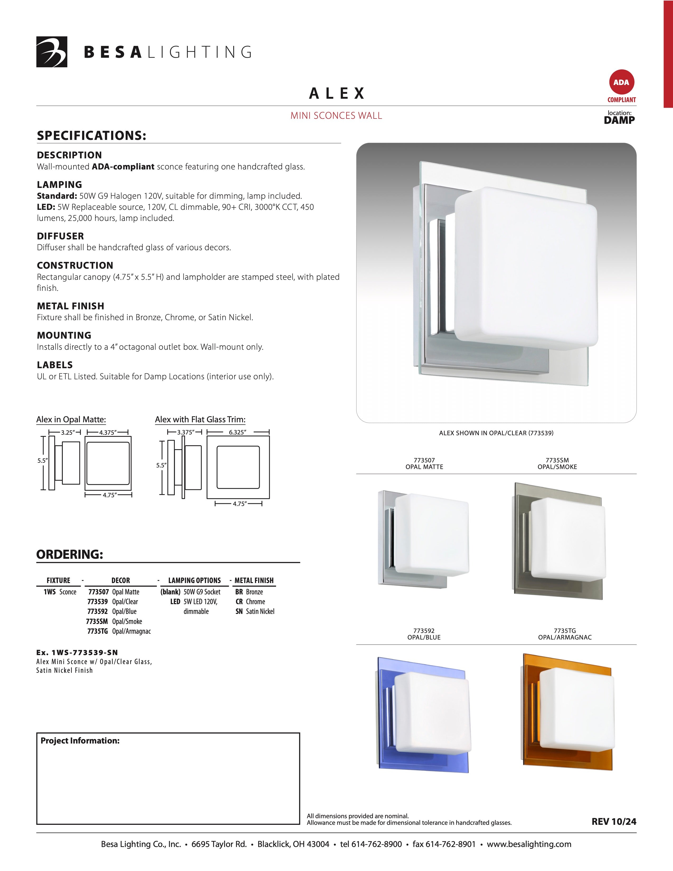 Alex has a simple, contemporary design that features handcrafted Opal glass, available with flat glass trim. This modern wall light offers flexible design potential for a variety of bath/vanity decorating schemes. Mount horizontally or vertically. ADA-Compliant. Our Opal glass is a soft white cased glass that can suit any classic or modern decor. Opal has a very tranquil glow that is pleasing in appearance. The smooth satin finish on the clear outer layer is a result of an extensive etching process. This blown glass is handcrafted by a skilled artisan, utilizing century-old techniques passed down from generation to generation.