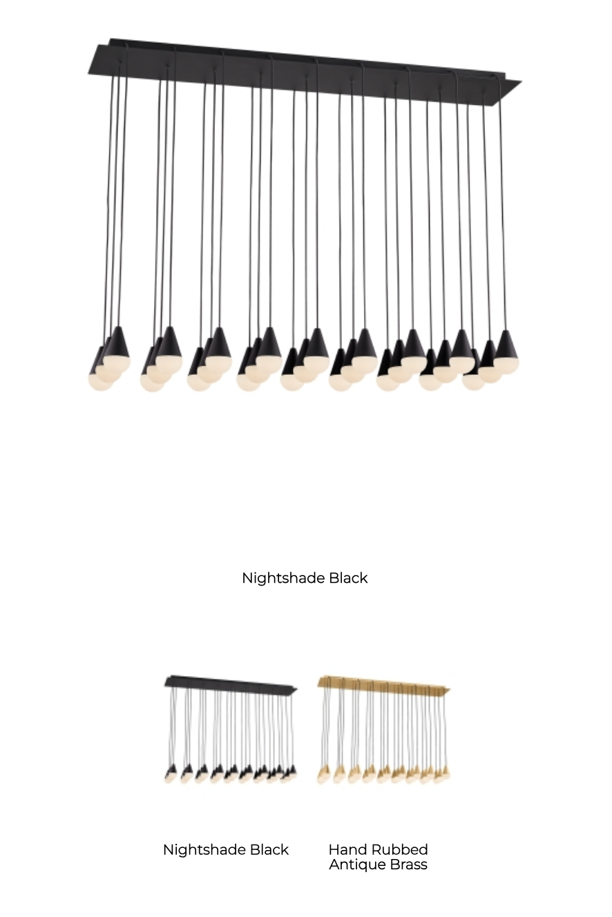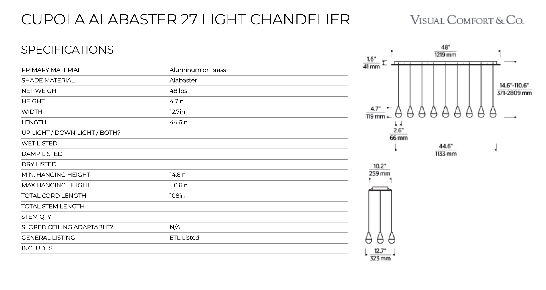 The Cupola Alabaster 27-Light Linear Chandelier by Visual Comfort, part of the Trellis collection by Sean Lavin, offers modern, minimalist illumination ideal for both residential and commercial spaces. Featuring domed alabaster optics within a tapered metal shade, it provides brilliant, glare-minimized light from its integrated 170.1W LED module, delivering 5535 lumens at 3000K with a 90 CRI. Constructed from aluminum or brass (with a natural brass option that patinas), this versatile fixture measures 44.6in L x 12.7in W x 4.7in H, weighs 48 lbs, and includes field-cuttable cable for flexible installation heights (14.6in to 110.6in). Available in Hand Rubbed Antique Brass and Nightshade Black finishes, with 120V or 277V options, it's ETL Listed and dimmable with compatible ELV/TRIAC or 0-10V dimmers, backed by a 5-year warranty.