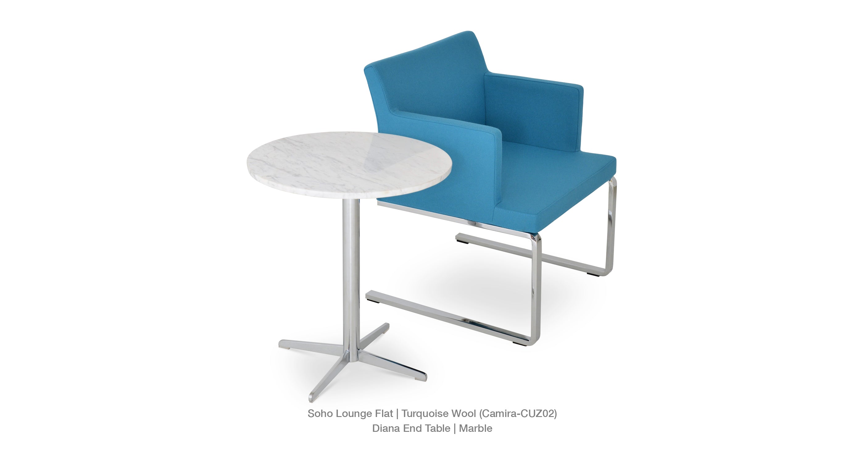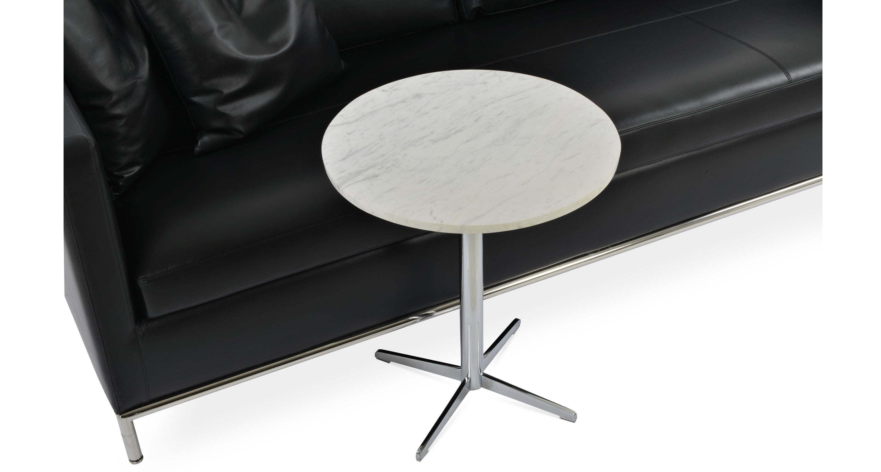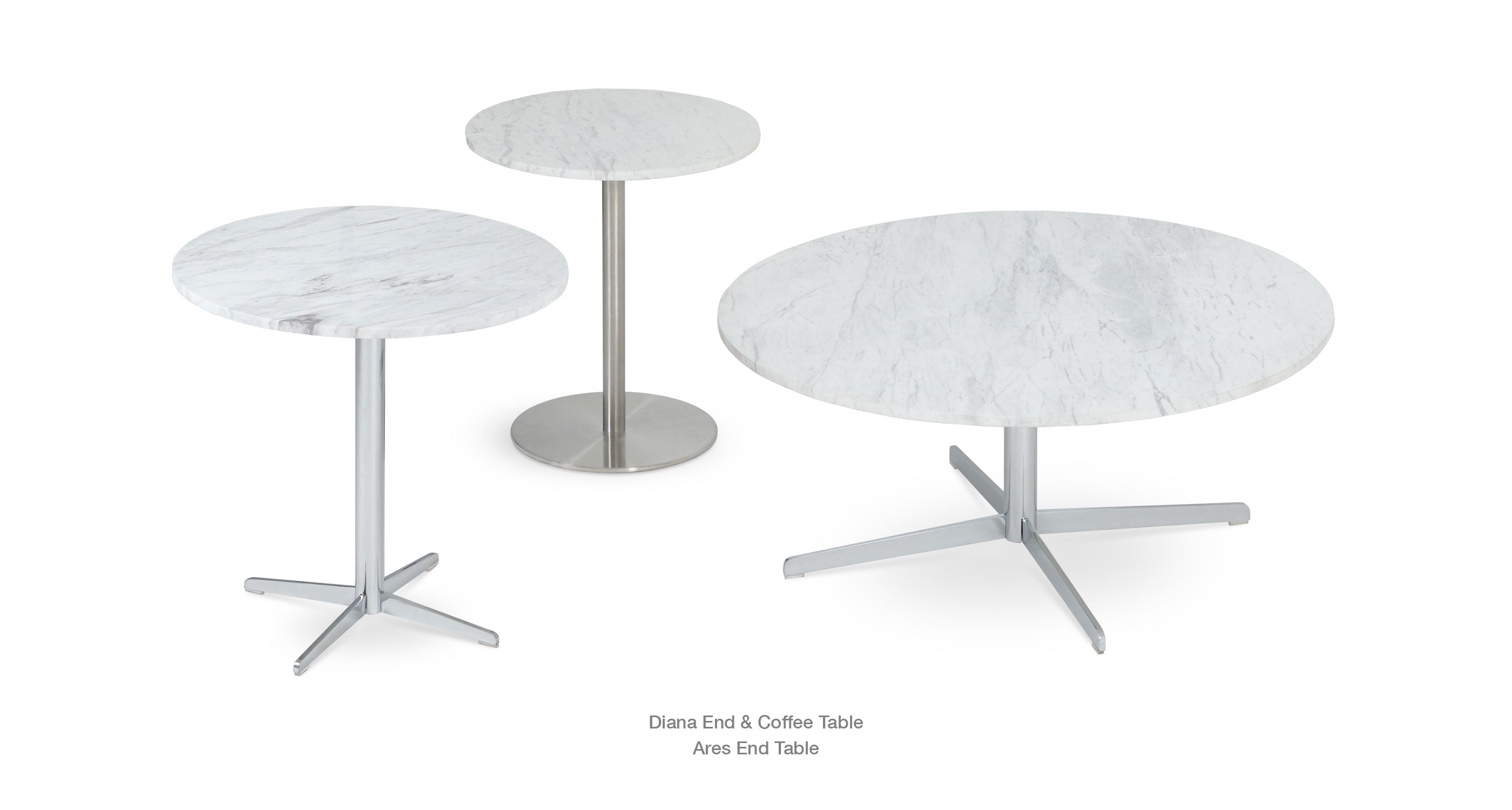 Simple and functional, Diana End Table demonstrates refined design features with its chrome 4 star base. It is offered in three different heights and several different glass top size options. The top is available in clear glass, marble and wood finishes. The table arrives in 3 boxes. Every table top is made out of natural stone and therefore each top is different and unique. Variations of color are inherent to the natural stone and considered part of the top's beauty. Diana End Table is suitable for both residential and commercial applications.