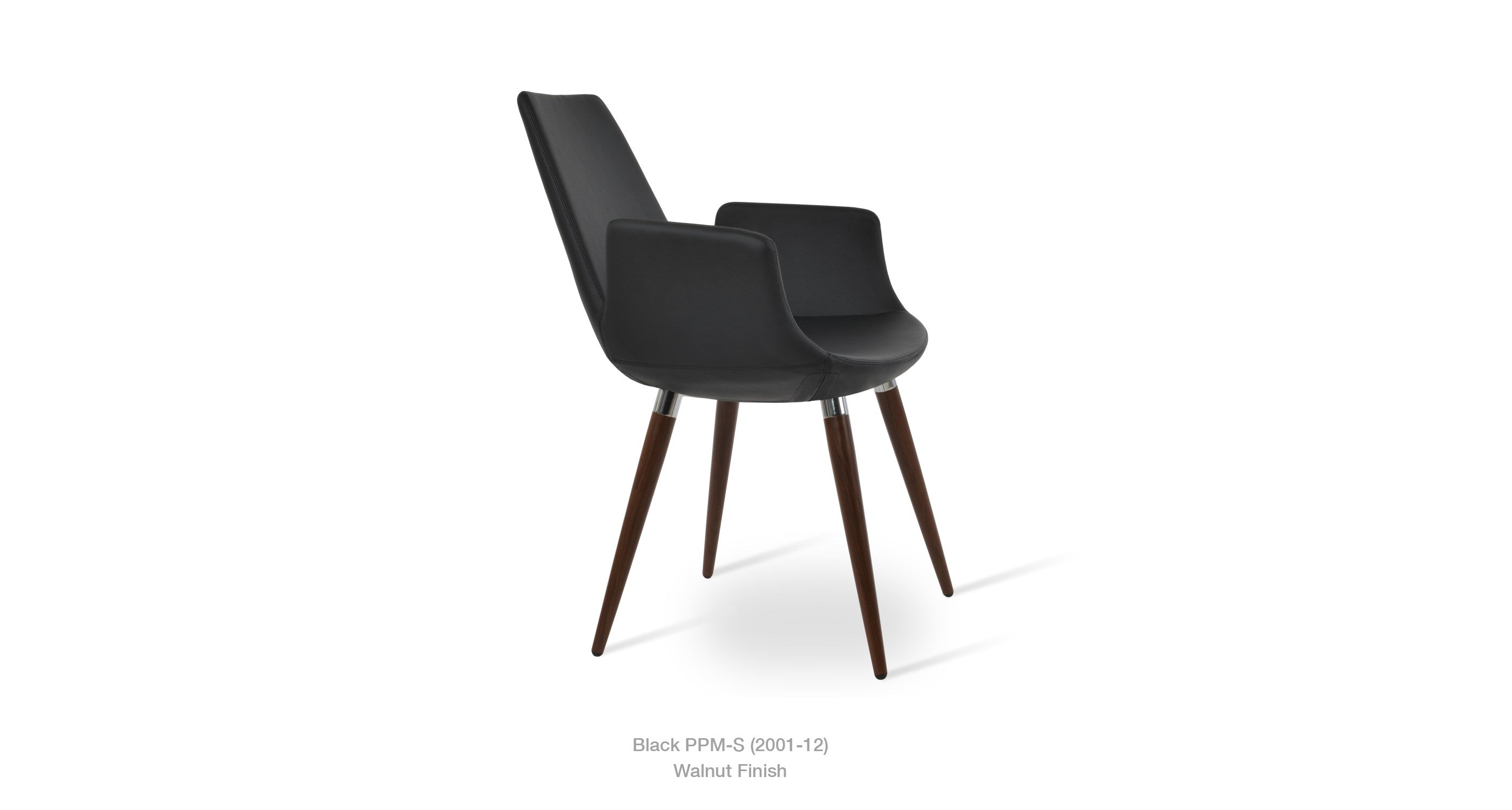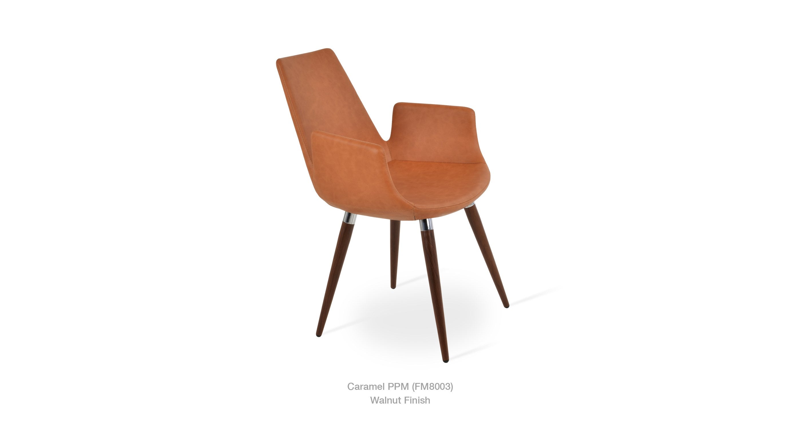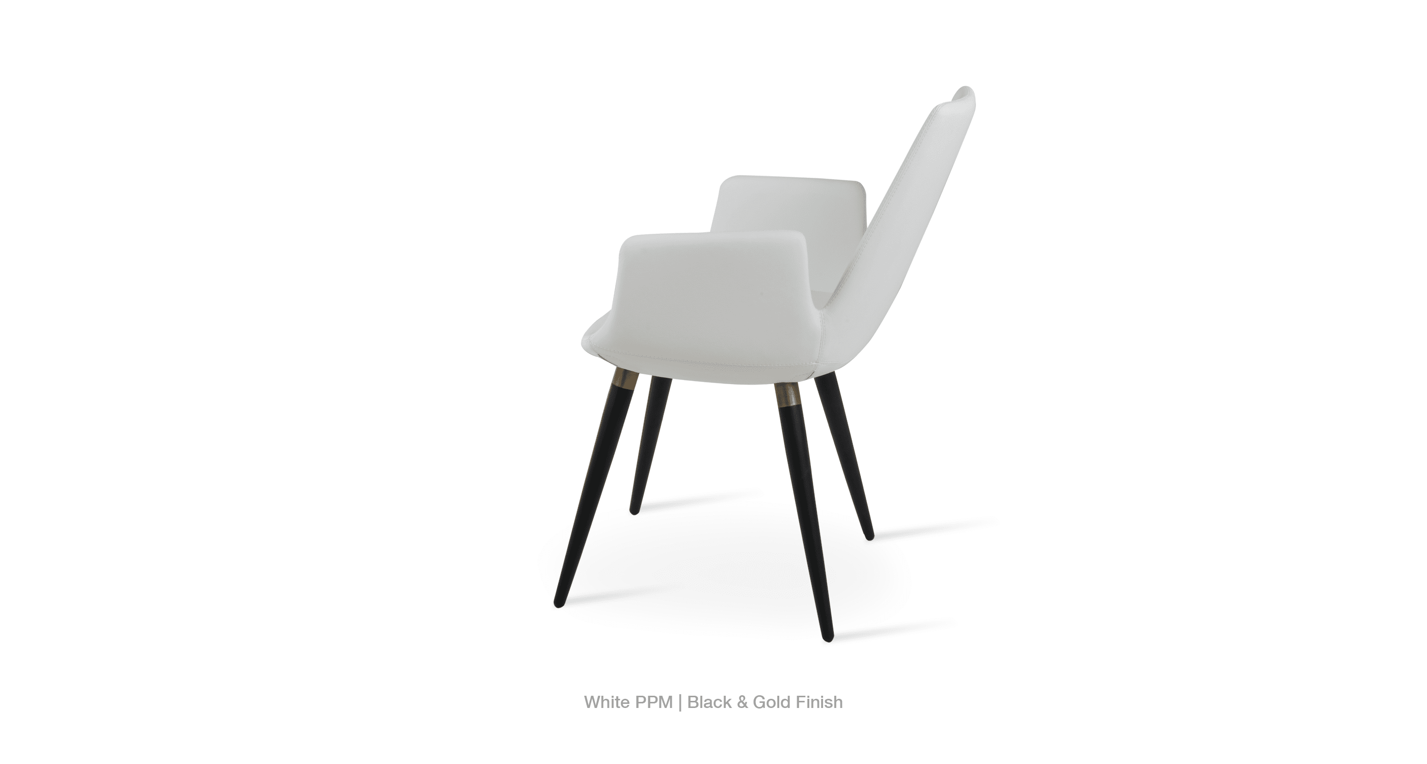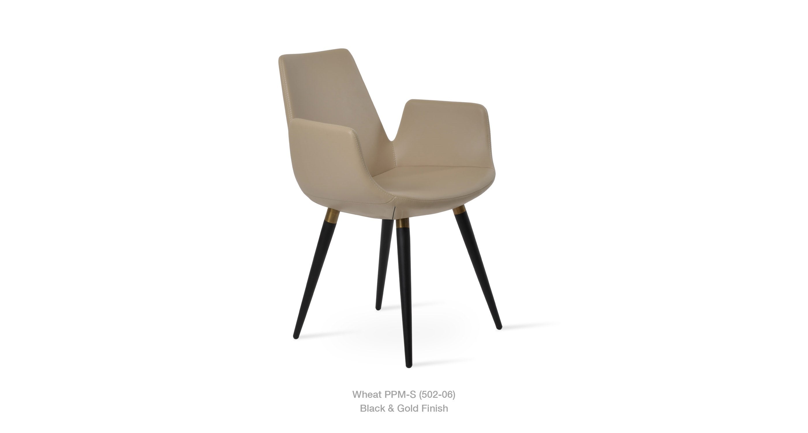 Eiffel Arm Ana is a contemporary chair with a comfortable upholstered seat and backrest on steel legs available in black powder with gold bracelets and footrest and walnut veneer with stainless steel brushed bracelets and footrest. The seat has a steel structure with “S” shape springs for extra flexibility and strength. This steel frame is molded by injecting polyurethane foam. Eiffel seat is upholstered with a removable velcro, enclosed leather, PPM, leatherette, wool as well as Camira organic wool slip cover that can be changed with professional help. Eiffel Arm Ana may be upholstered with variety of other colors as a special order with a minimum of quantity required. The chair is suitable for both residential and commercial use.