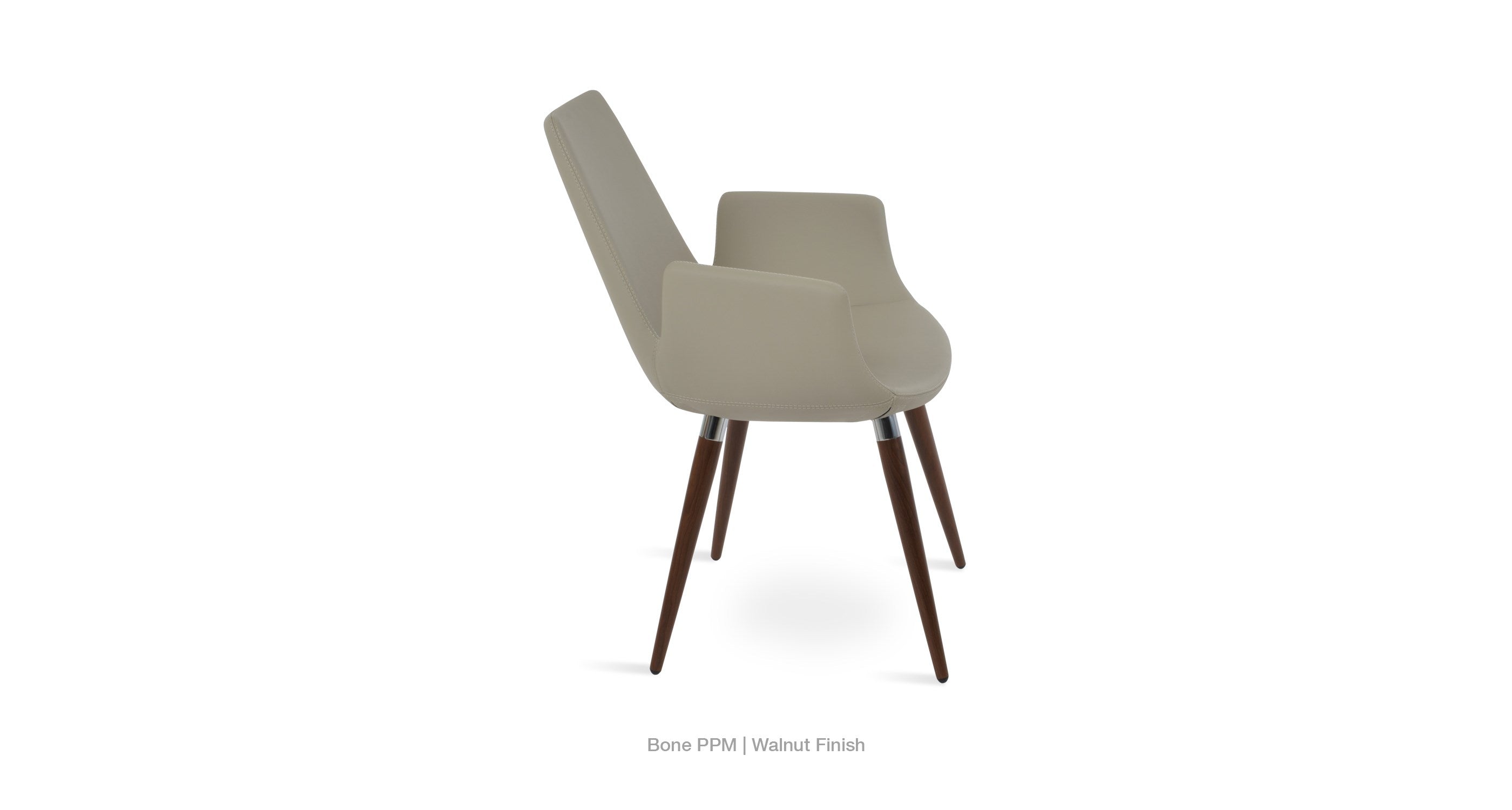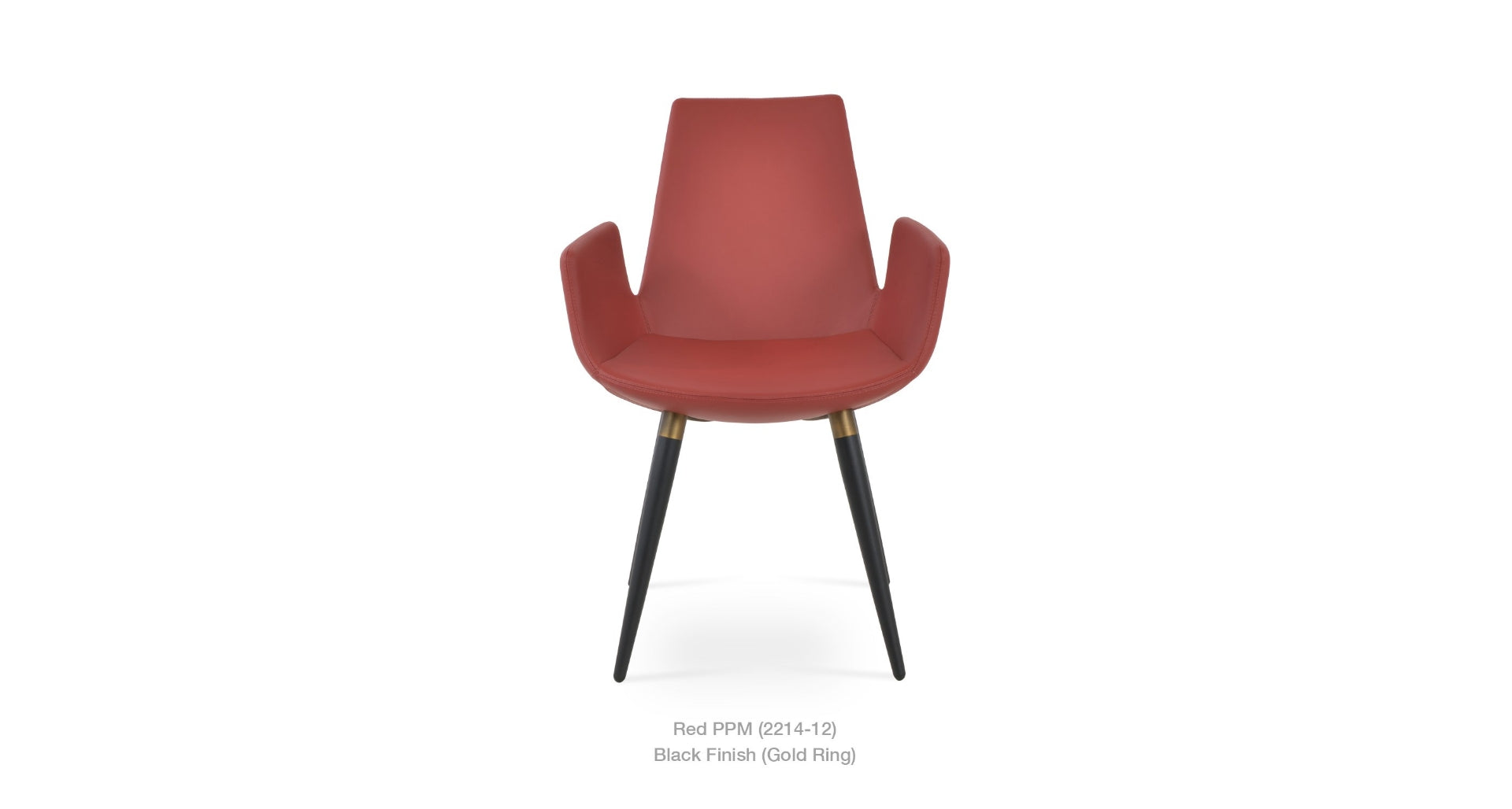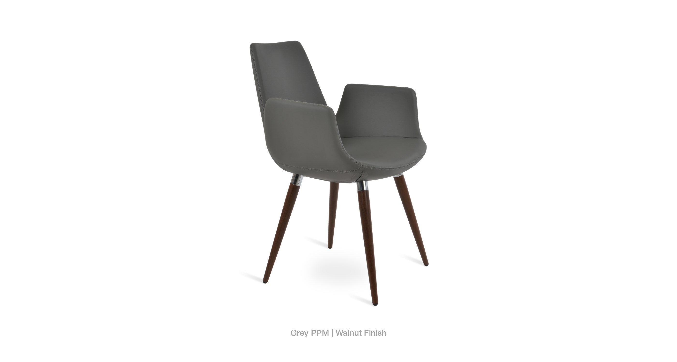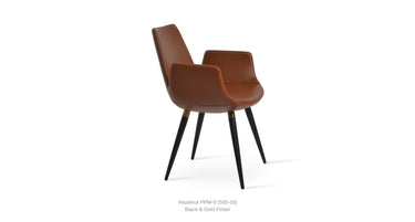 Eiffel Arm Ana is a contemporary chair with a comfortable upholstered seat and backrest on steel legs available in black powder with gold bracelets and footrest and walnut veneer with stainless steel brushed bracelets and footrest. The seat has a steel structure with “S” shape springs for extra flexibility and strength. This steel frame is molded by injecting polyurethane foam. Eiffel seat is upholstered with a removable velcro, enclosed leather, PPM, leatherette, wool as well as Camira organic wool slip cover that can be changed with professional help. Eiffel Arm Ana may be upholstered with variety of other colors as a special order with a minimum of quantity required. The chair is suitable for both residential and commercial use.