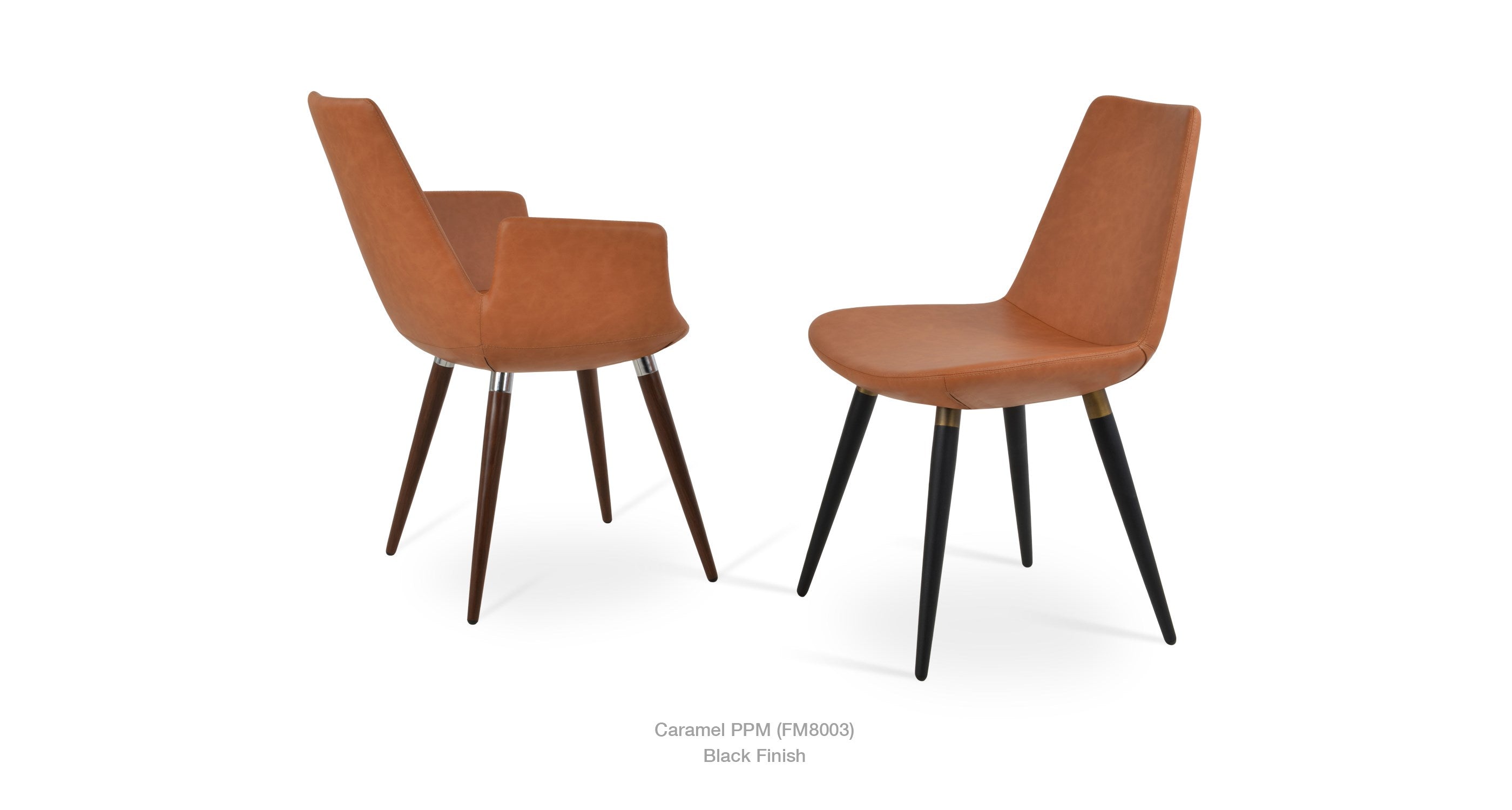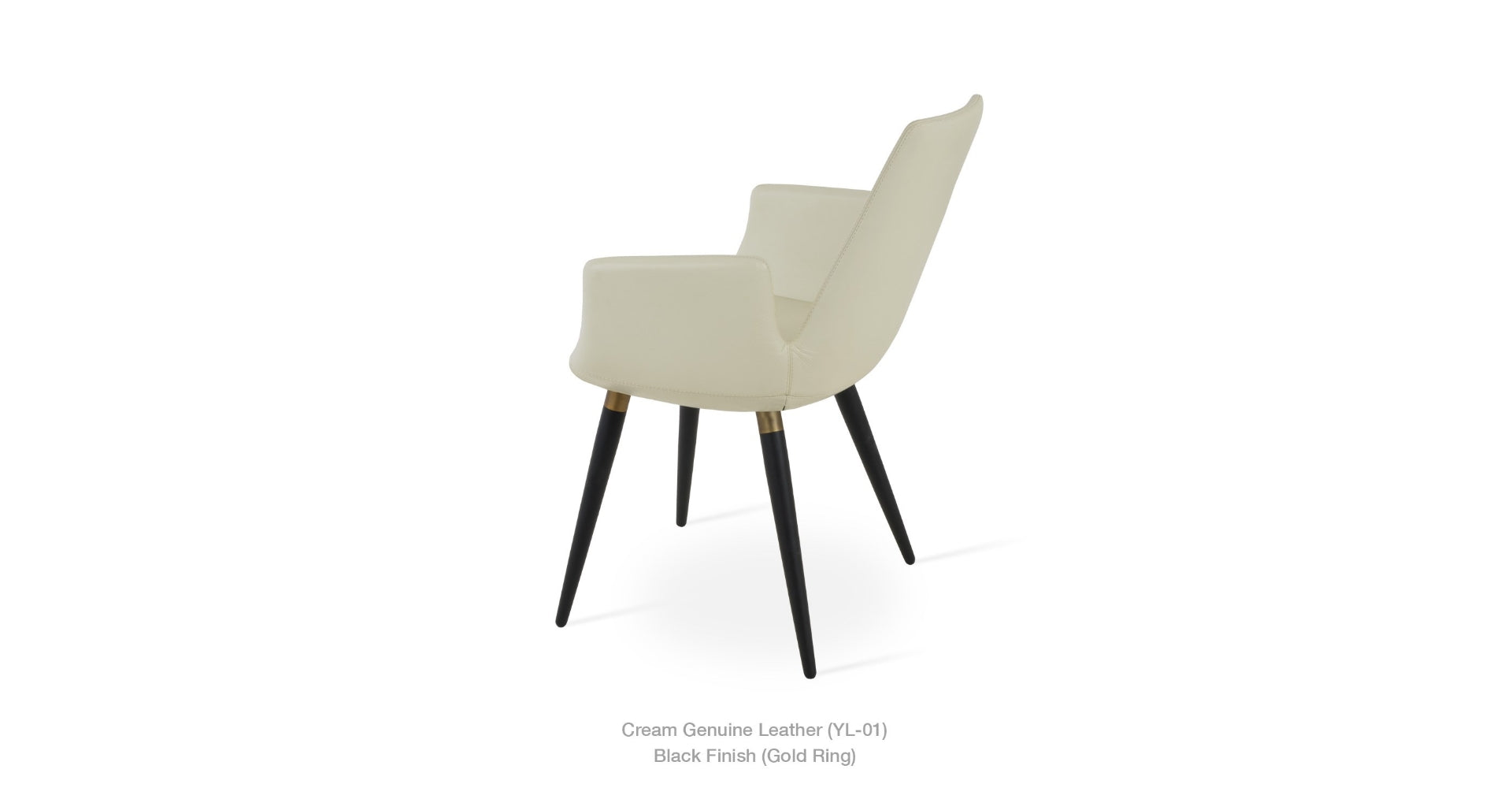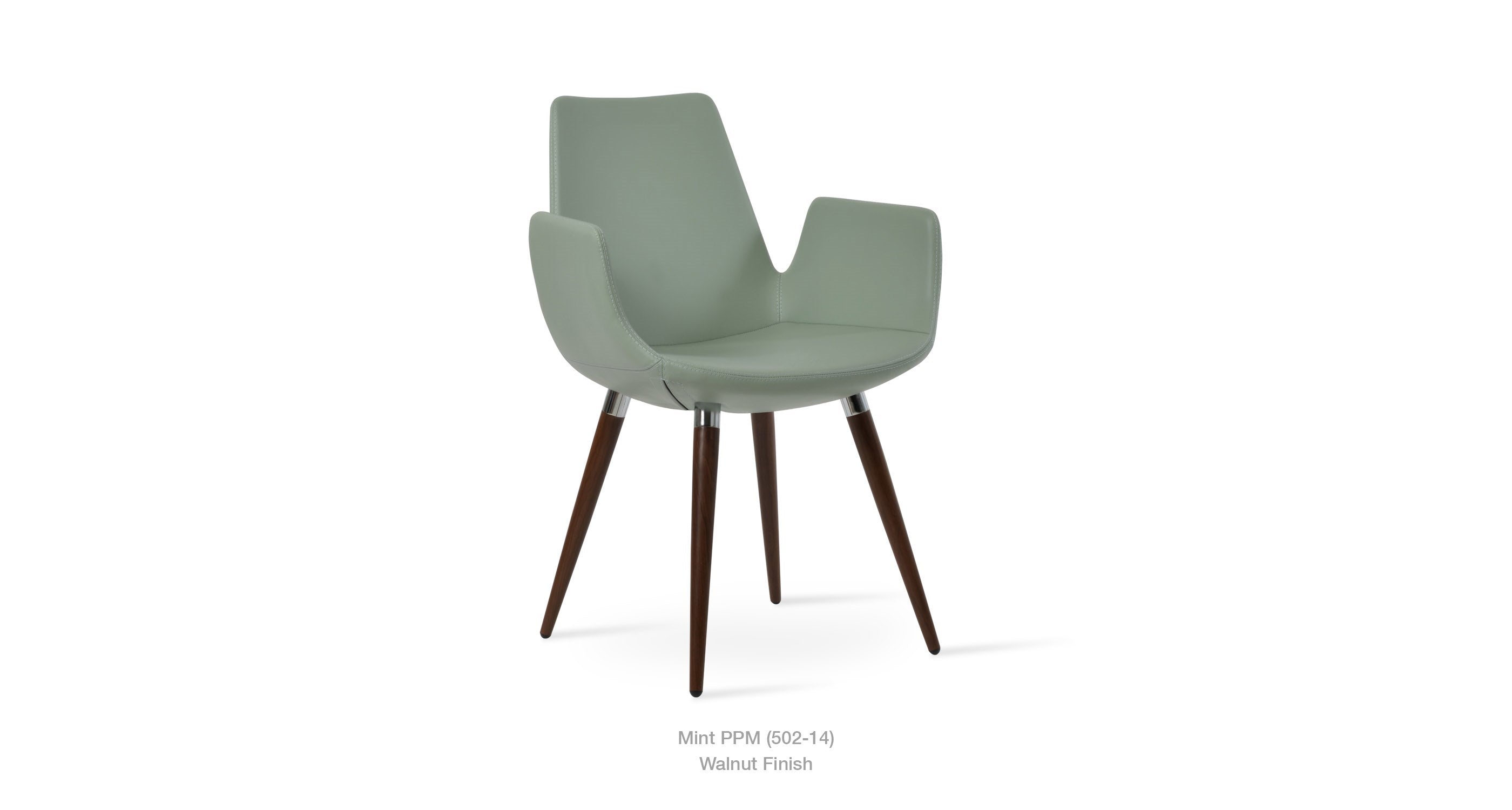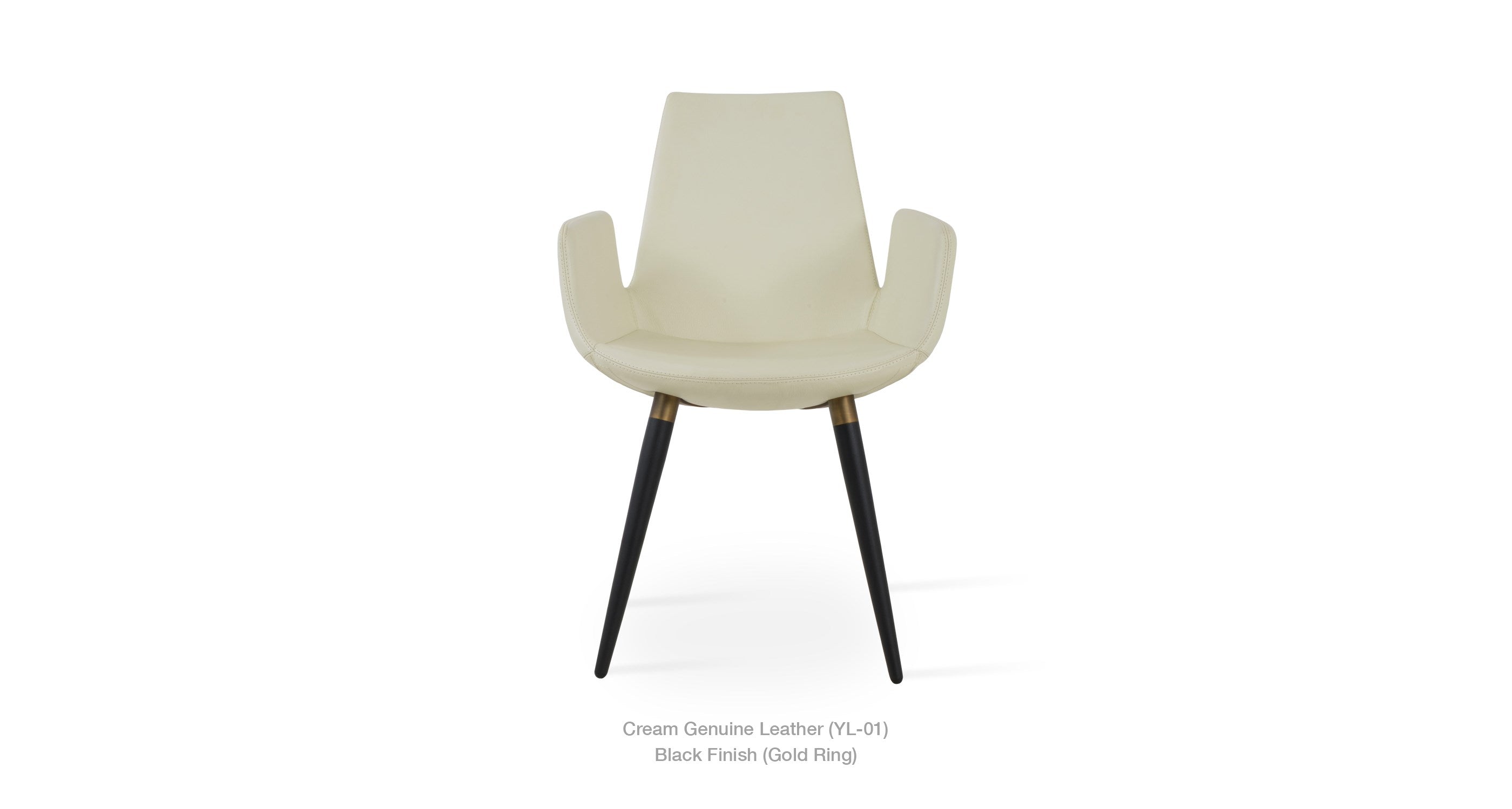Eiffel Arm Ana is a contemporary chair with a comfortable upholstered seat and backrest on steel legs available in black powder with gold bracelets and footrest and walnut veneer with stainless steel brushed bracelets and footrest. The seat has a steel structure with “S” shape springs for extra flexibility and strength. This steel frame is molded by injecting polyurethane foam. Eiffel seat is upholstered with a removable velcro, enclosed leather, PPM, leatherette, wool as well as Camira organic wool slip cover that can be changed with professional help. Eiffel Arm Ana may be upholstered with variety of other colors as a special order with a minimum of quantity required. The chair is suitable for both residential and commercial use.