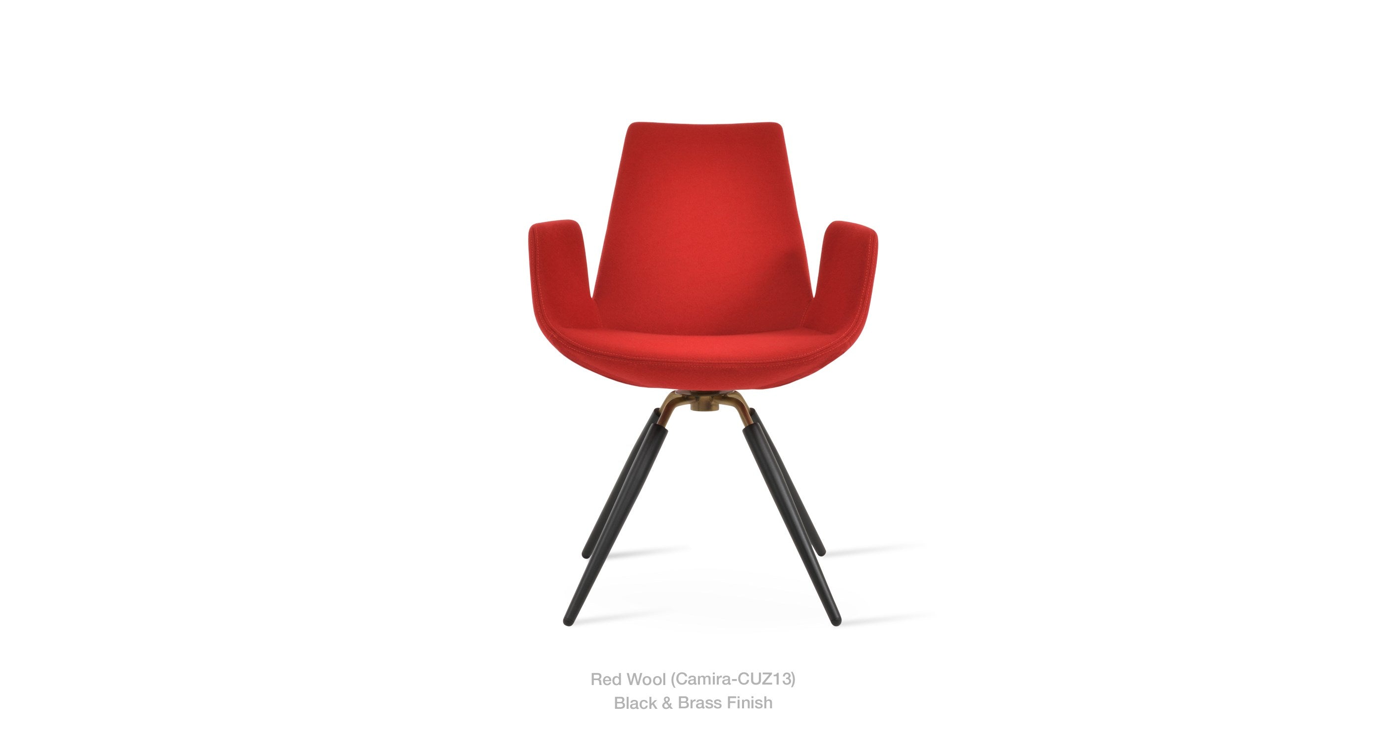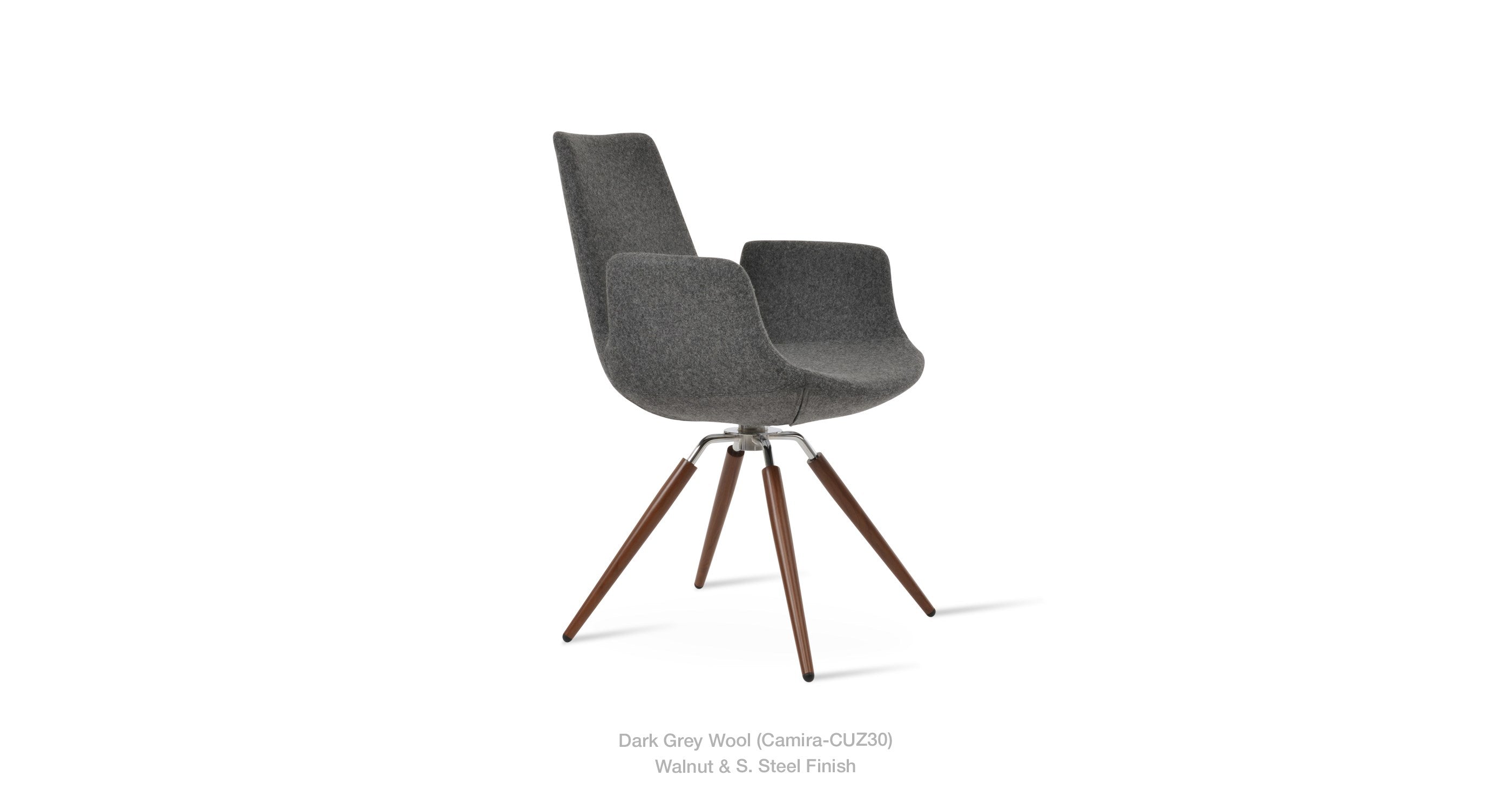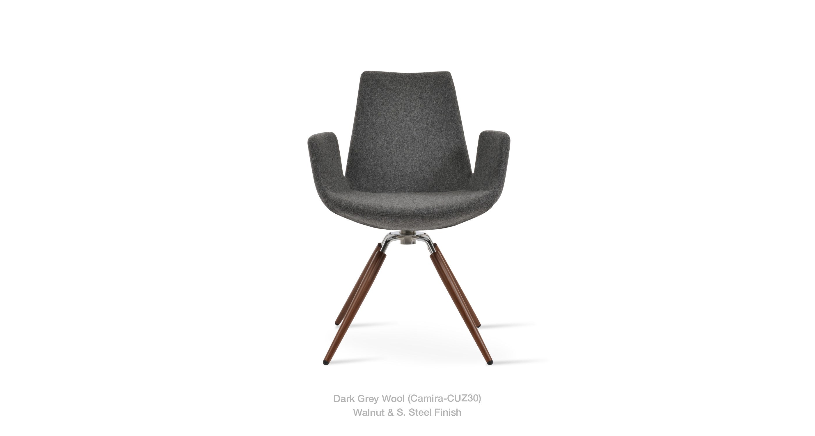 Eiffel Arm Carrot Swivel is a contemporary chair with a comfortable upholstered seat and backrest on a metal swivel legs. The seat has a steel structure with “S” shape springs for extra flexibility and strength. This steel frame is molded by injecting polyurethane foam. Eiffel Arm seat is upholstered with a removable velcro, enclosed leather, PPM, leatherette, wool as well as Camira organic wool slip cover that can be changed with professional help. Eiffel Arm Carrot Swivel may be upholstered with variety of other colors as a special order with a minimum of quantity required. The chair is suitable for both residential and commercial use.