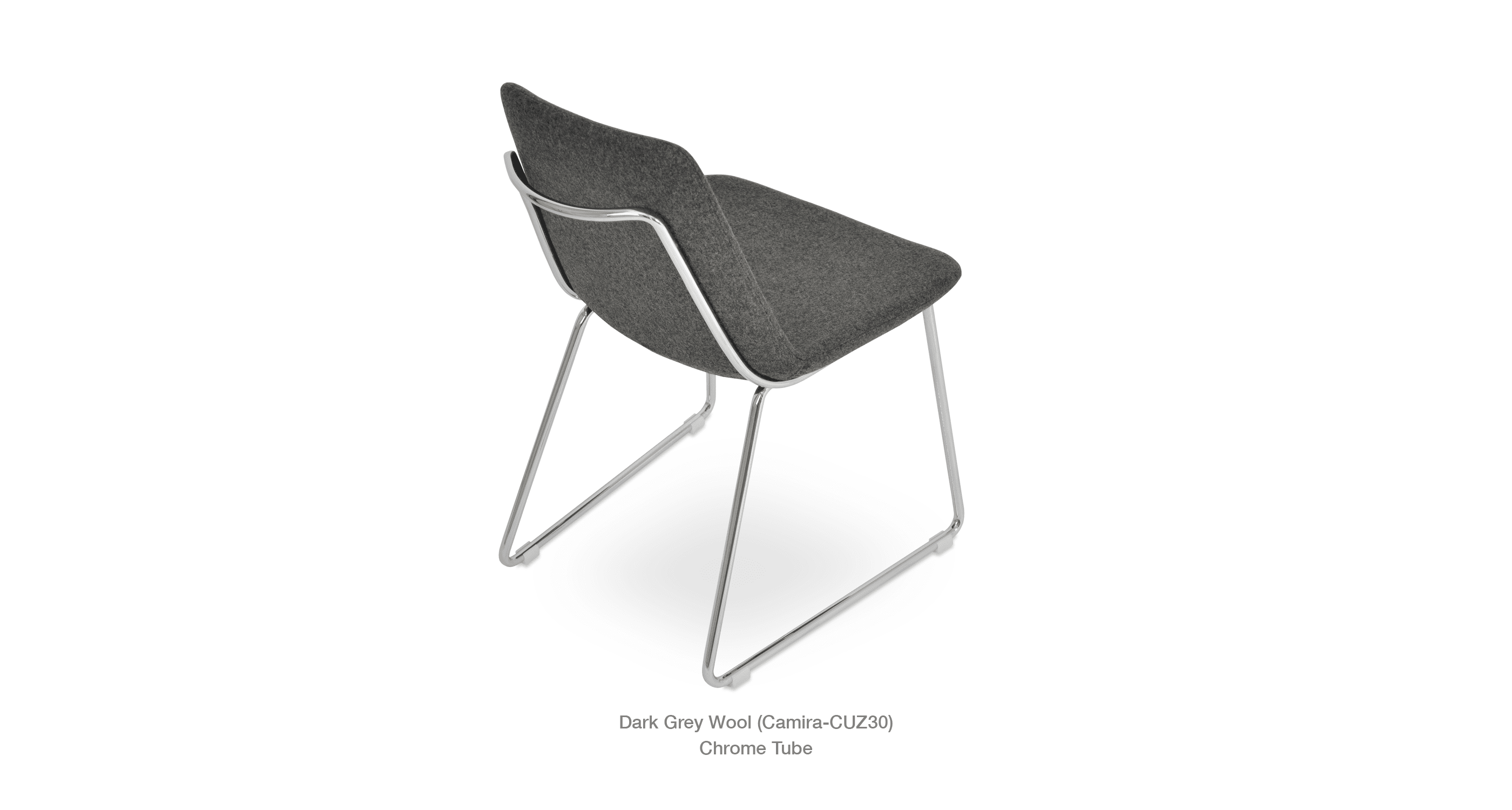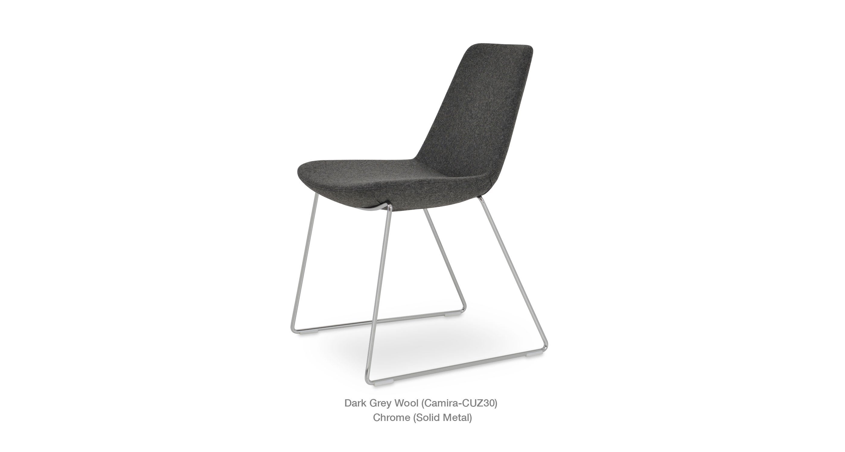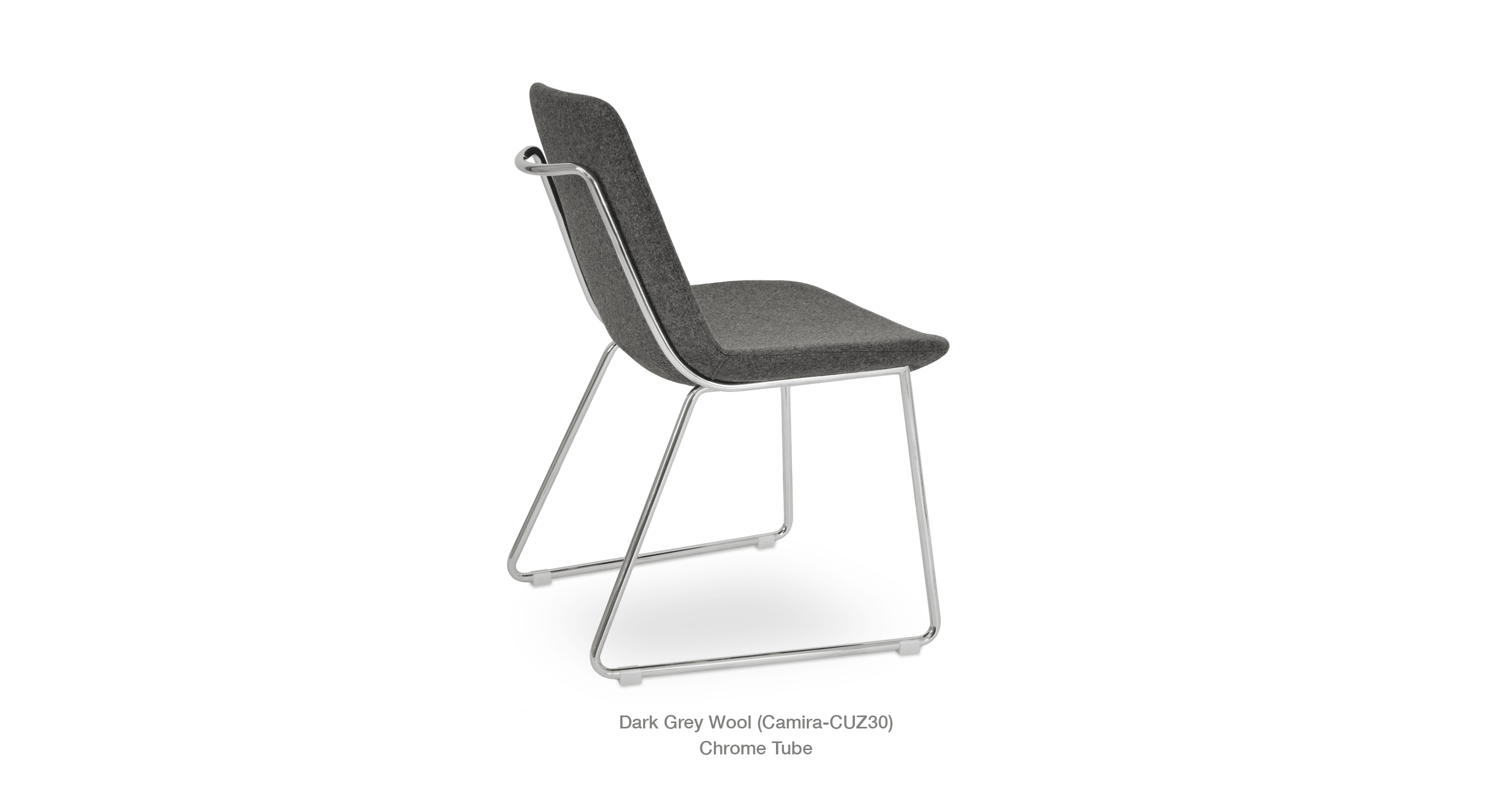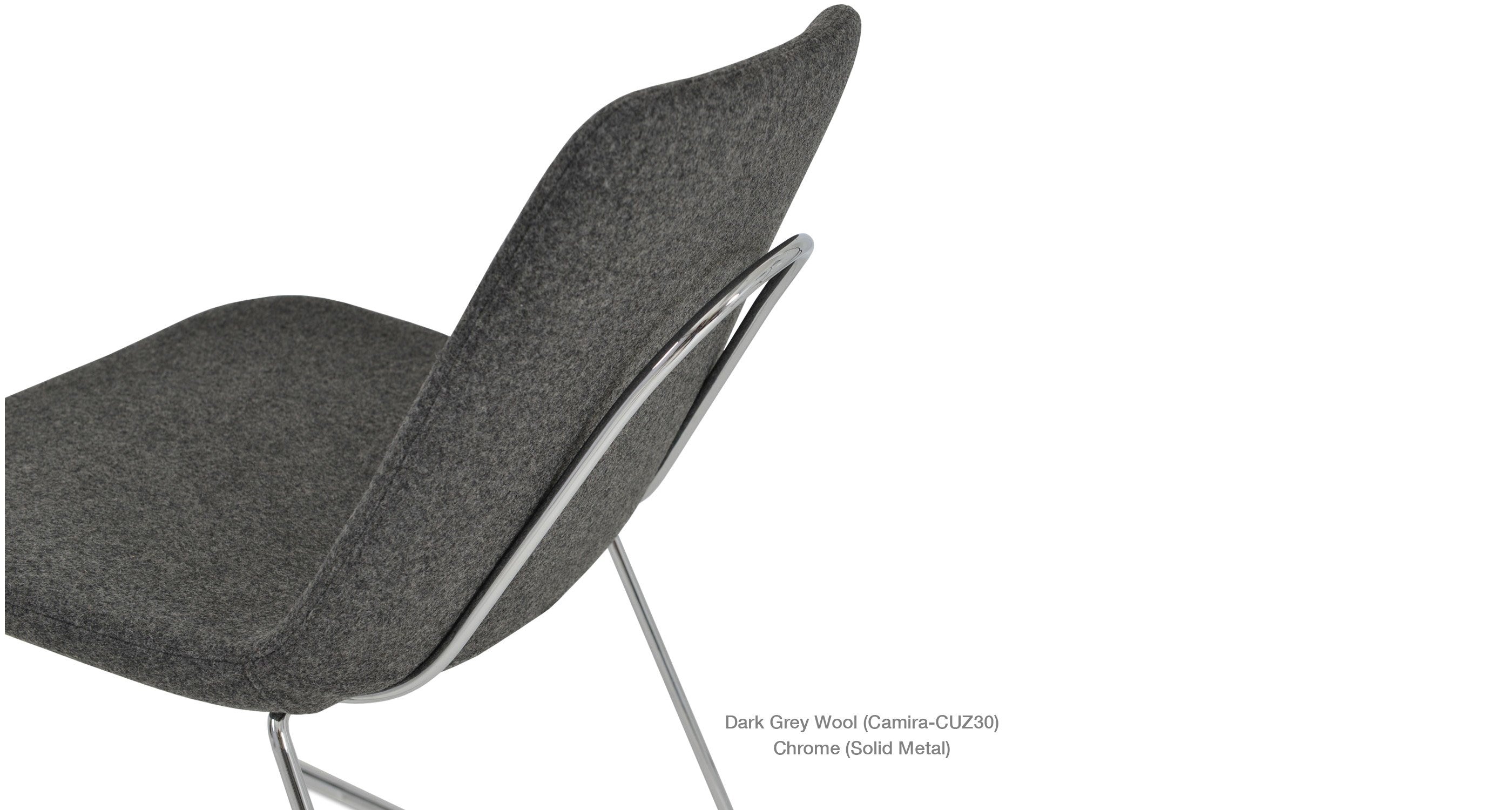 Eiffel Handle Back is a contemporary dining chair with a comfortable upholstered seat and backrest on solid metal wire in chrome, as well as tube available in chrome and black powder coated finish. Each leg is tipped with a plastic glide embedded into the metal wire. The seat has a steel structure with “S” shape springs for extra flexibility and strength. This steel frame is molded by injecting polyurethane foam. Eiffel seat is upholstered with a removable velcro, enclosed leather, PPM, leatherette, wool as well as Camira organic wool slip cover. Eiffel Handle Back may be upholstered with variety of other colors as a special order with a minimum of quantity required. The chair is suitable for both residential and commercial use.