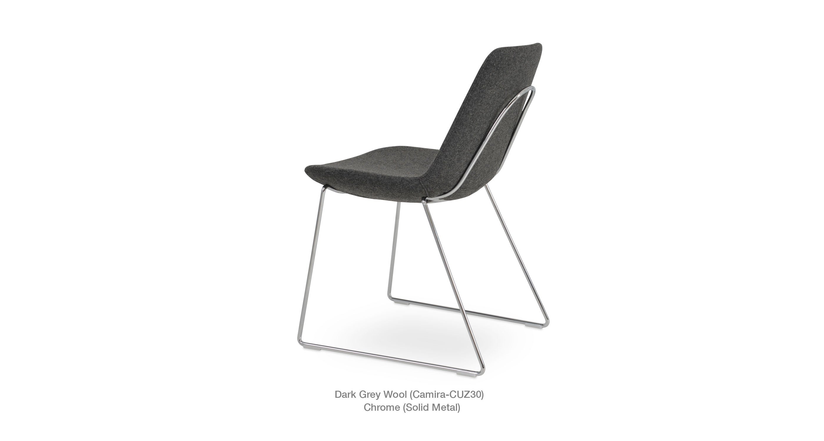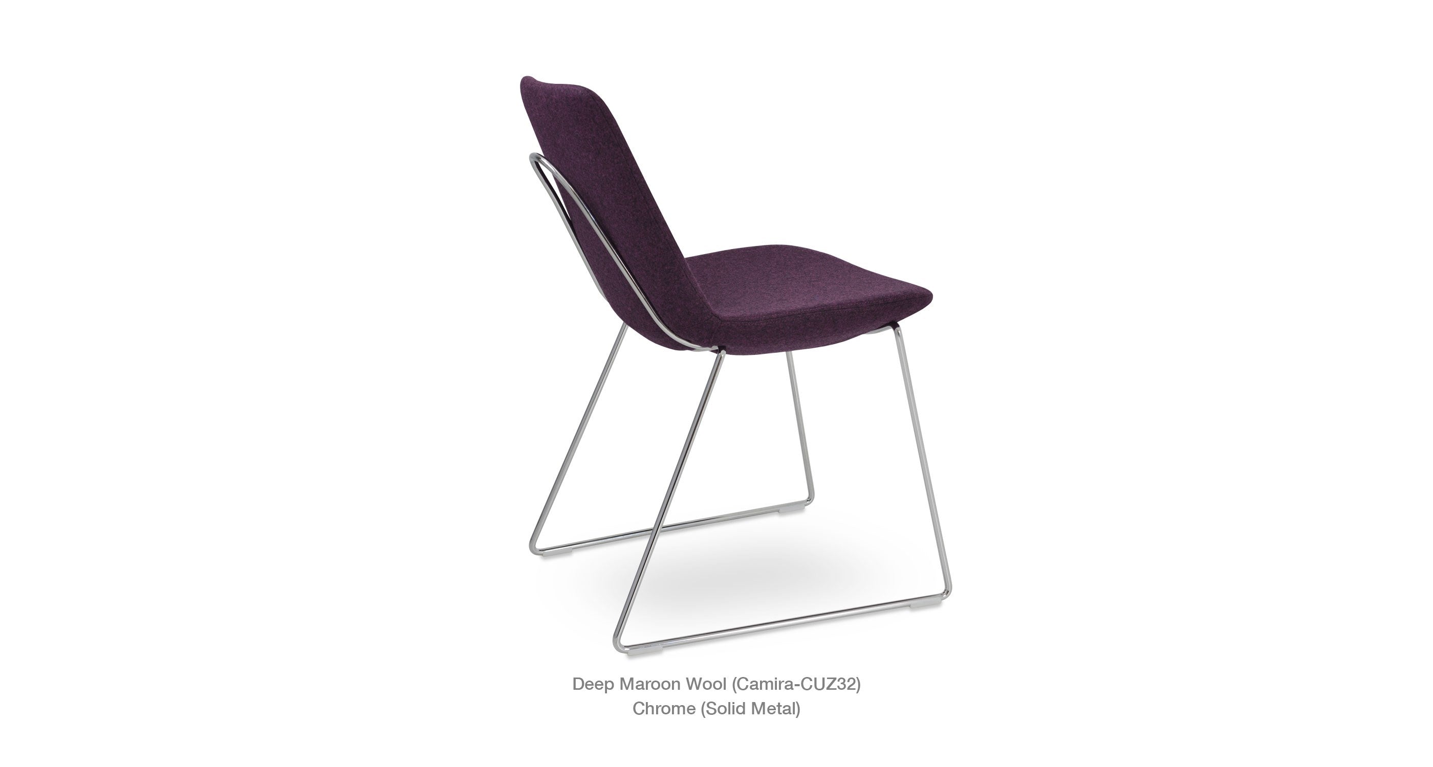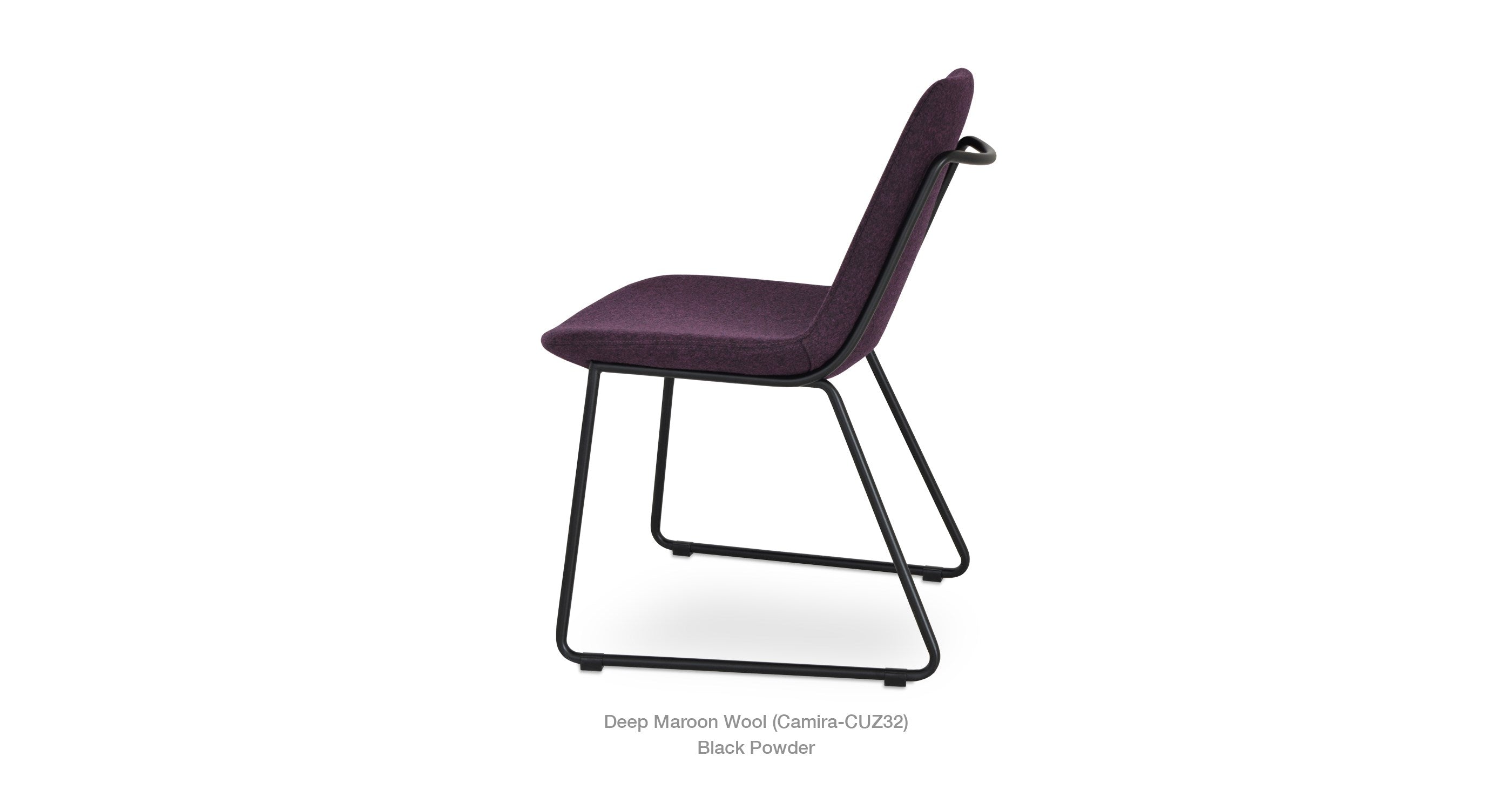 Eiffel Handle Back is a contemporary dining chair with a comfortable upholstered seat and backrest on solid metal wire in chrome, as well as tube available in chrome and black powder coated finish. Each leg is tipped with a plastic glide embedded into the metal wire. The seat has a steel structure with “S” shape springs for extra flexibility and strength. This steel frame is molded by injecting polyurethane foam. Eiffel seat is upholstered with a removable velcro, enclosed leather, PPM, leatherette, wool as well as Camira organic wool slip cover. Eiffel Handle Back may be upholstered with variety of other colors as a special order with a minimum of quantity required. The chair is suitable for both residential and commercial use.