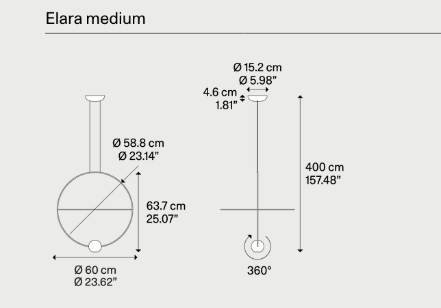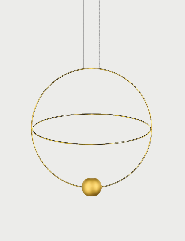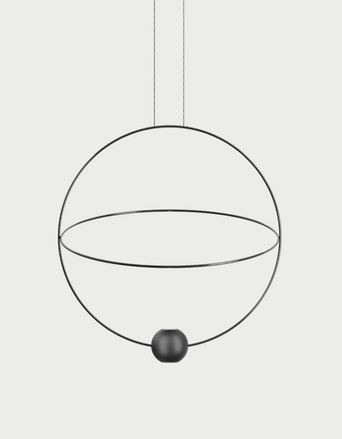 Designed by Nika Zupanc for Lodes, the Elara geometric ceiling pendant light pairs its sculptural dual-ring silhouette and rotating LED sphere with warm 3000K bi-directional illumination (2260 lm uplight + 845 lm downlight, 27W integrated LED, 90 CRI) to create a striking focal point ideal for modern dining rooms, kitchen islands, bedrooms, living rooms, home offices, hallways, hotel suites, lobbies, reception areas and restaurants; offered in medium (Ø60 cm, approx. 22.62"W x 25.07"H) and large (Ø80 cm) sizes with matte or gloss black and gold finishes, long-life integrated LED, 4 m or 10 m adjustable cord options, lightweight construction around 4.4 lb (2 kg), 5.98" round canopy, TRIAC dimming on 120V, ETL/cETLus and IP20 indoor ratings, and typically fast 3–5 business day shipping (when in stock) for a refined, comfortable and high-performance lighting solution across residential and commercial spaces.