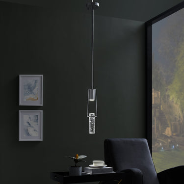 The Harmony Single Pendant in Chrome is a crystal encased in a matte black sculpture that hangs from the ceiling with a cable length of up to 11 feet.