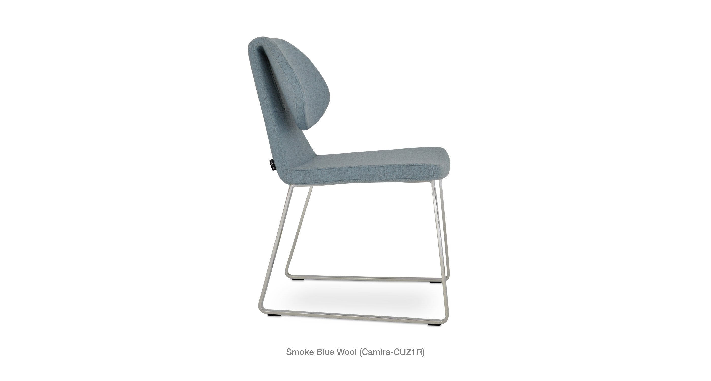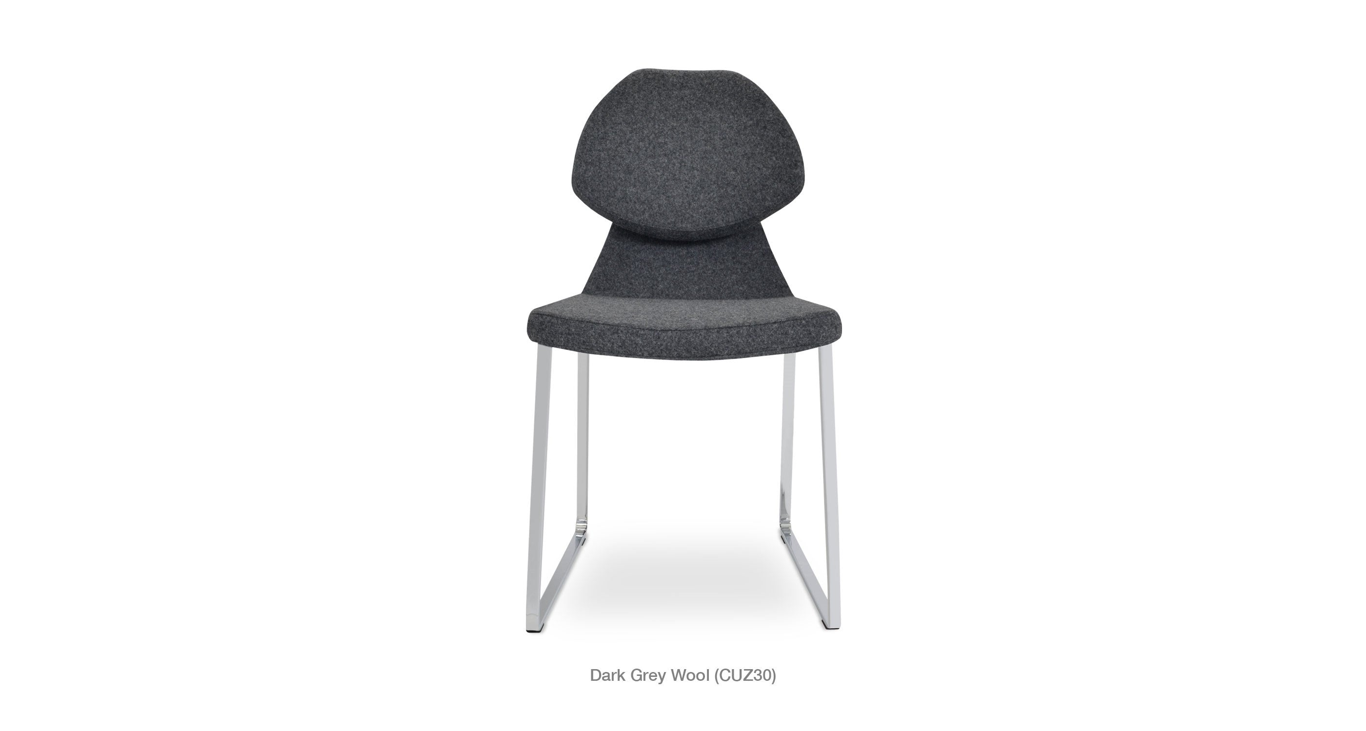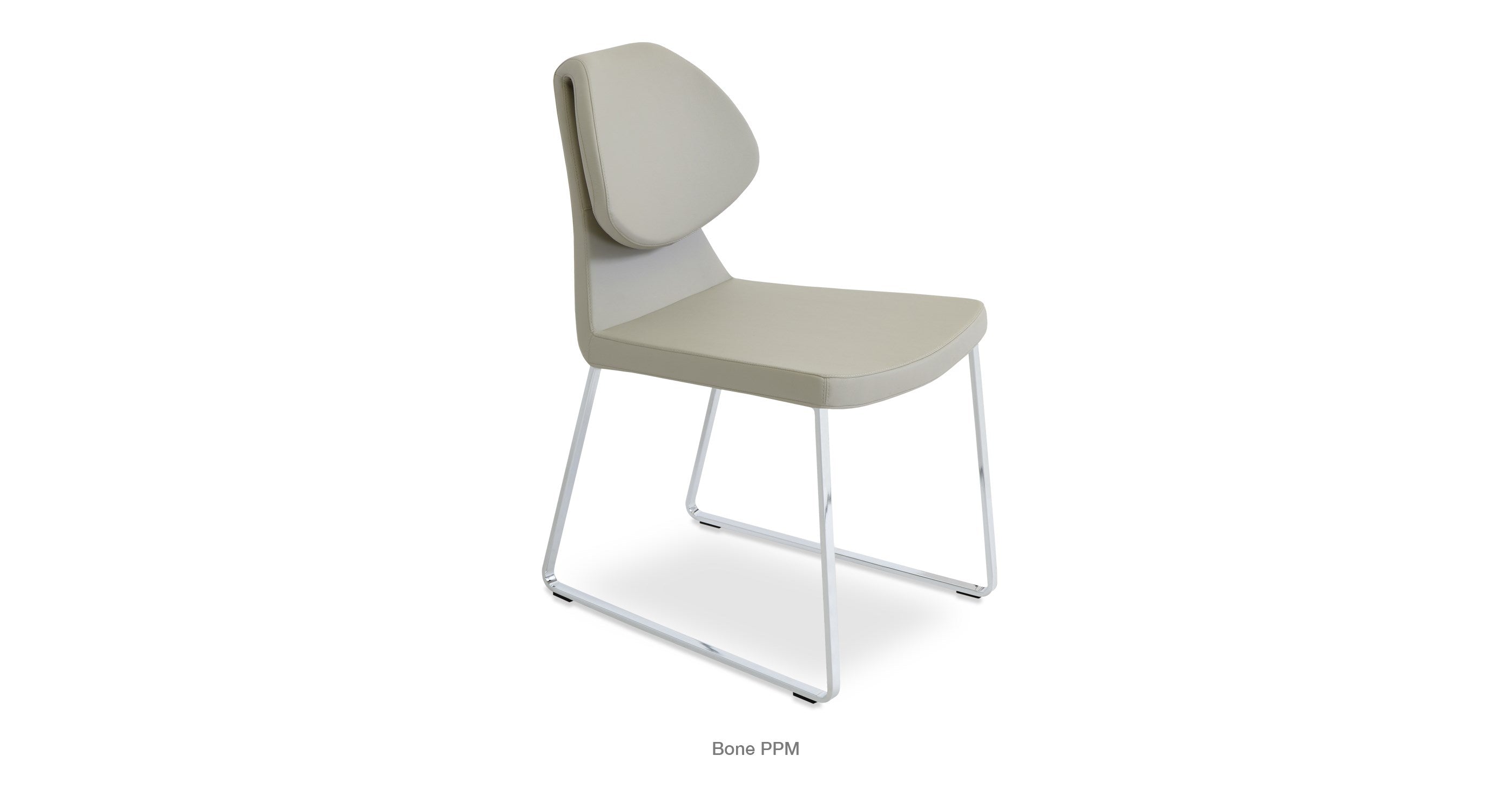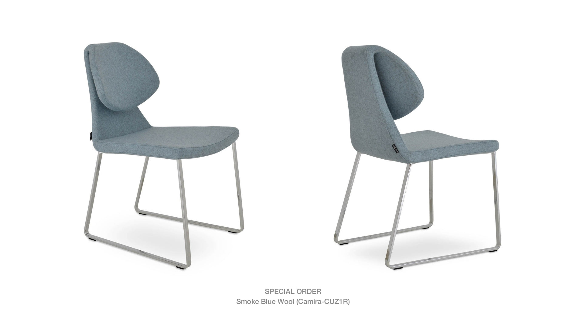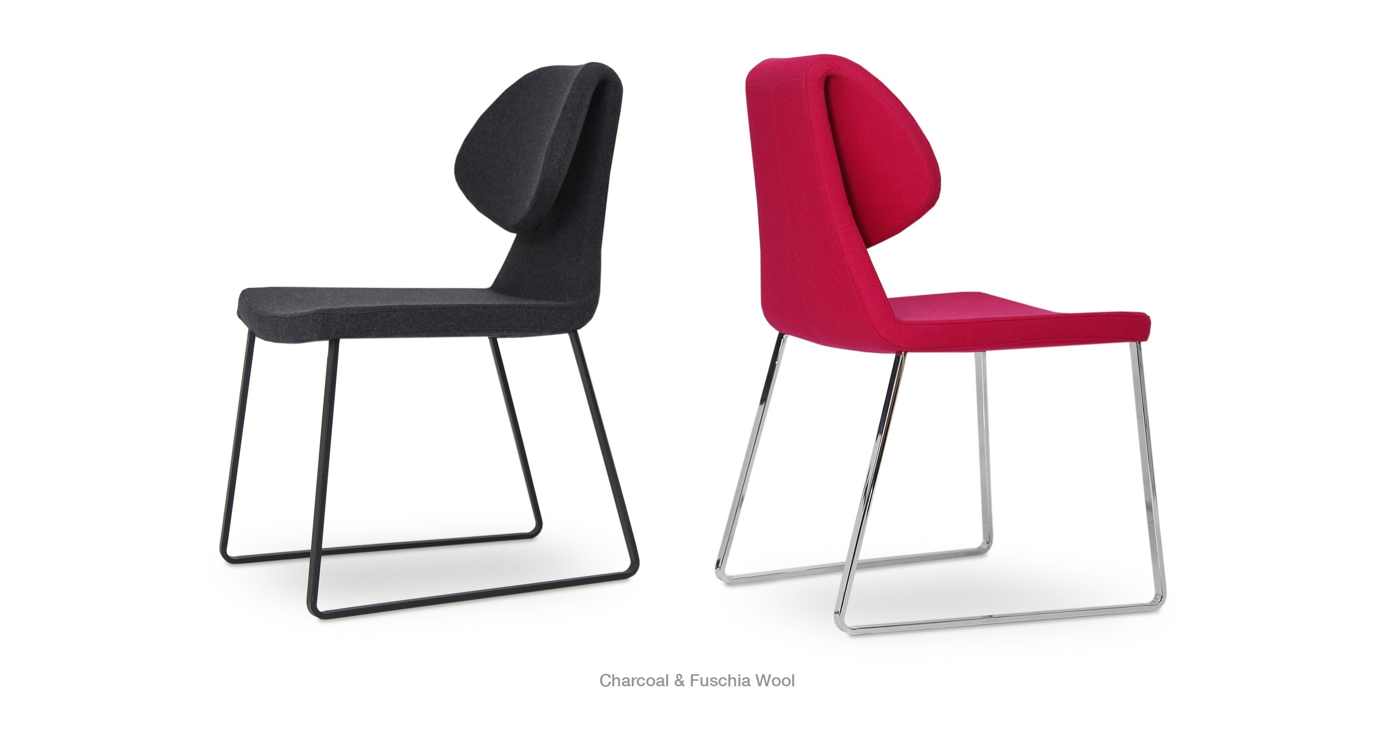 Gakko is a distinctive dining chair with a comfortable upholstered seat and backrest on a sled steel legs with plastic caps embedded inside the base. The folded backrest gives chair extra comfort and futuristic look. Gakko Seat is built on solid birch wood frame. Gakko seat is upholstered with a removable zipper and velcro enclosed top-grain leather, PPM or wool fabric slip cover. Gakko chair may be upholstered with various of other colors as a special order with a minimum of quantity required. The chair is suitable for both residential and commercial use.