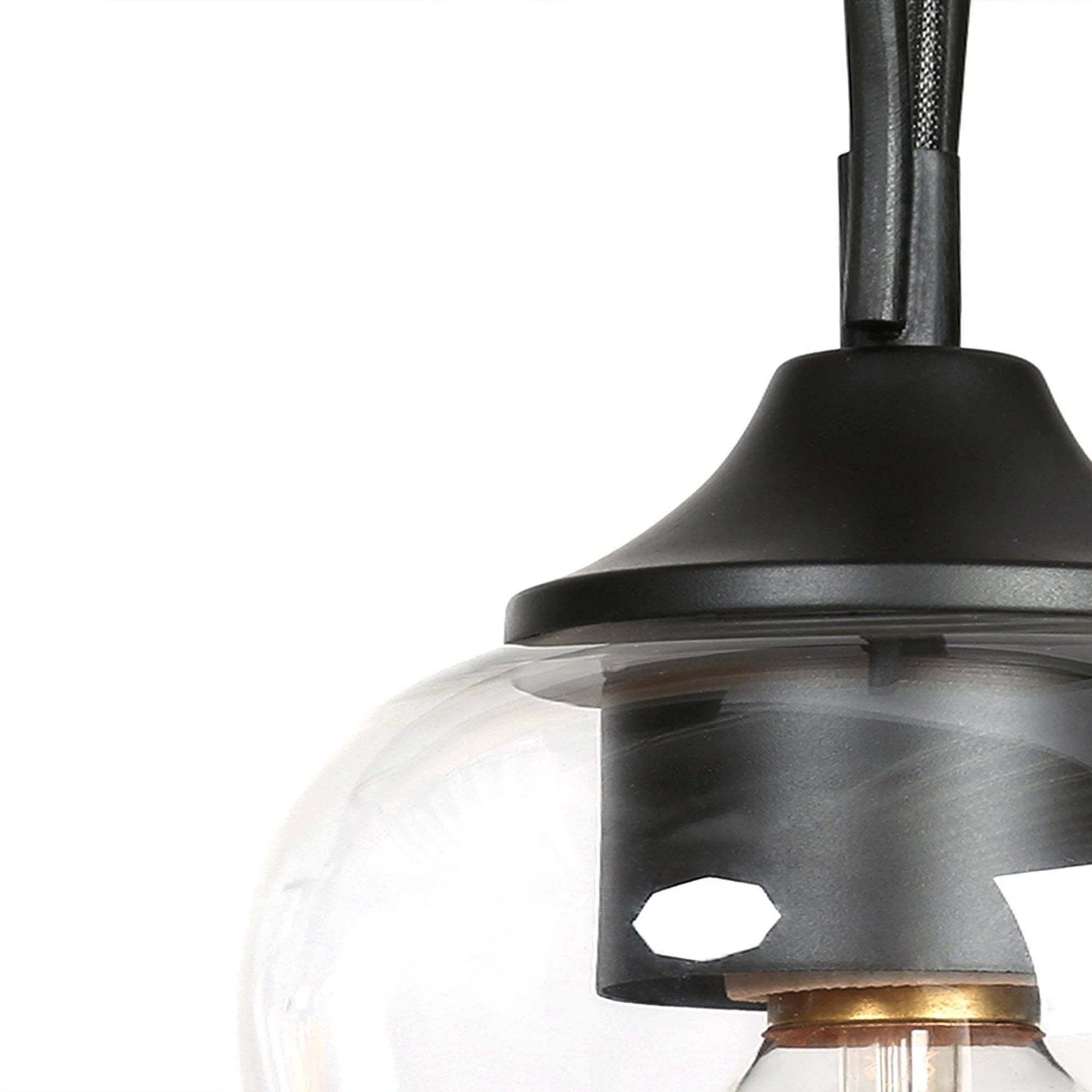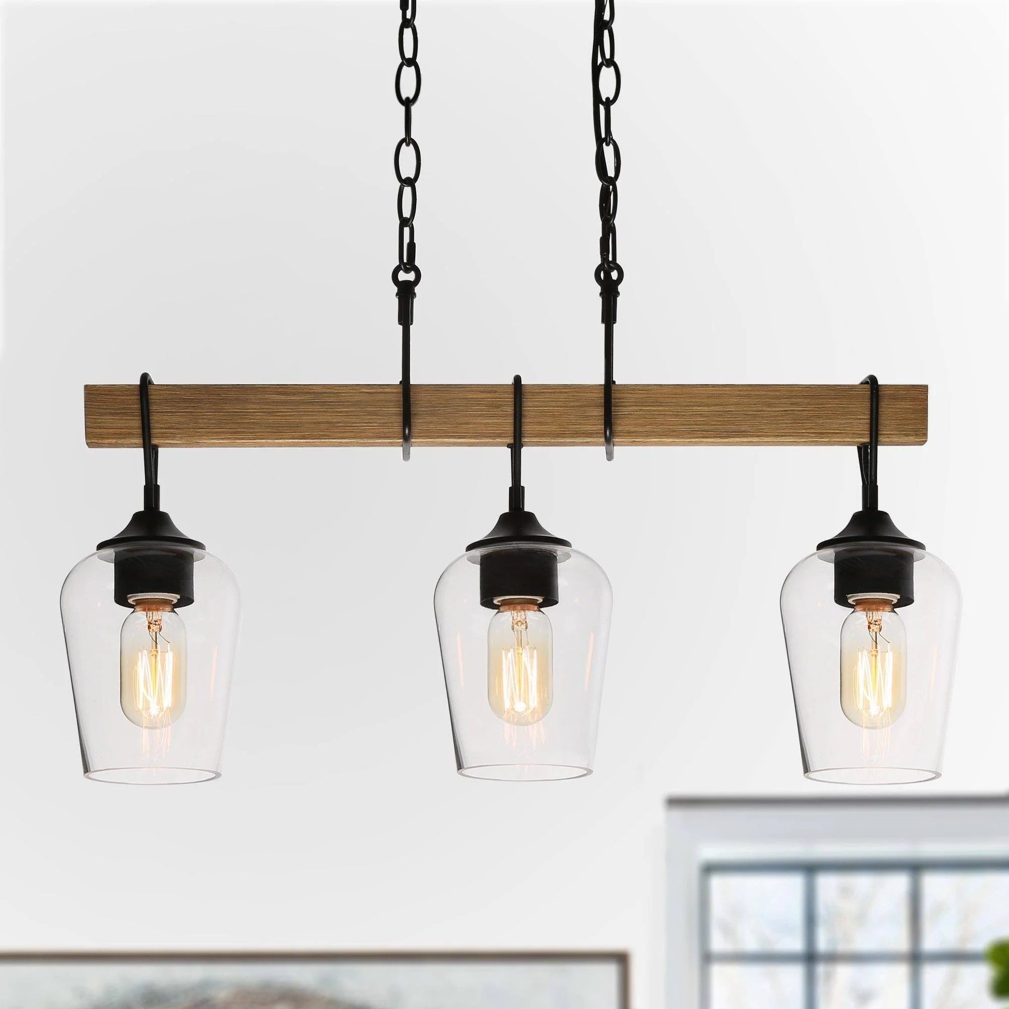 Bring warm, modern-farmhouse style to kitchens, dining rooms, game rooms, offices, and hotel suites with this 25-inch linear chandelier in matte black with pine texture accents. Three clear goblet-style glass shades highlight standard E26 medium-base bulbs (up to 60W each; dimmable with compatible switch), while the adjustable 18.5"–76" drop and included 59" chain make it easy to fit over islands or long tables—even on sloped ceilings. Crafted in durable metal and glass with a dry-location UL listing, this fixture offers straightforward installation, clean lines that pair with rustic or industrial décor, and bright, even illumination for everyday tasks and entertaining.