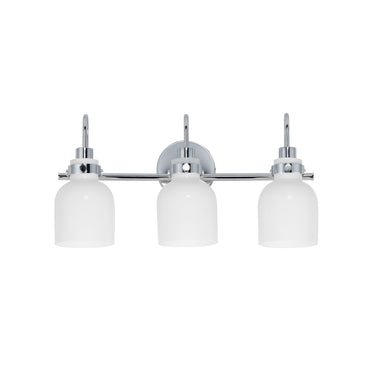 Celebrate nostalgia using these sconces that feature opal White glass shades in a bell shape. Supported on rings of metal in your choice of Polished Chrome or a bolder two-tone Black and Satin Brass, this refreshing take plays into a retro aesthetic of your bathroom decor. Available in various lengths of bath vanity lights or single sconces.