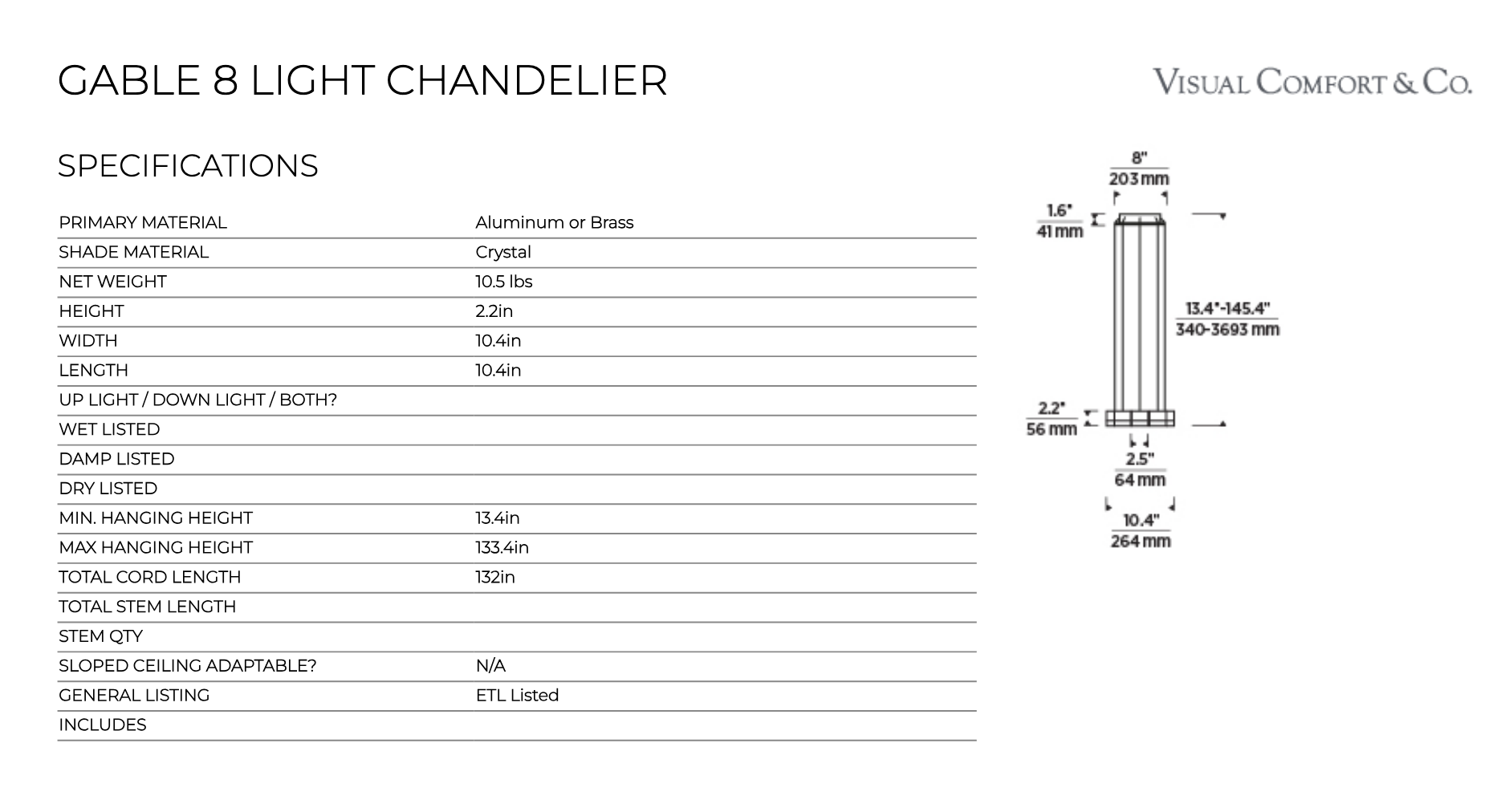 The Gable 8-Light Chandelier from the Trellis Collection by Sean Lavin blends modern design with LED performance. Featuring eight cylindrical pendants with crystal optics, this fixture delivers soft, even lighting ideal for high ceilings, open layouts, dining rooms, or commercial lobbies. Field-adjustable cables and dimmable LED technology make it a customizable, efficient choice for today’s interiors.