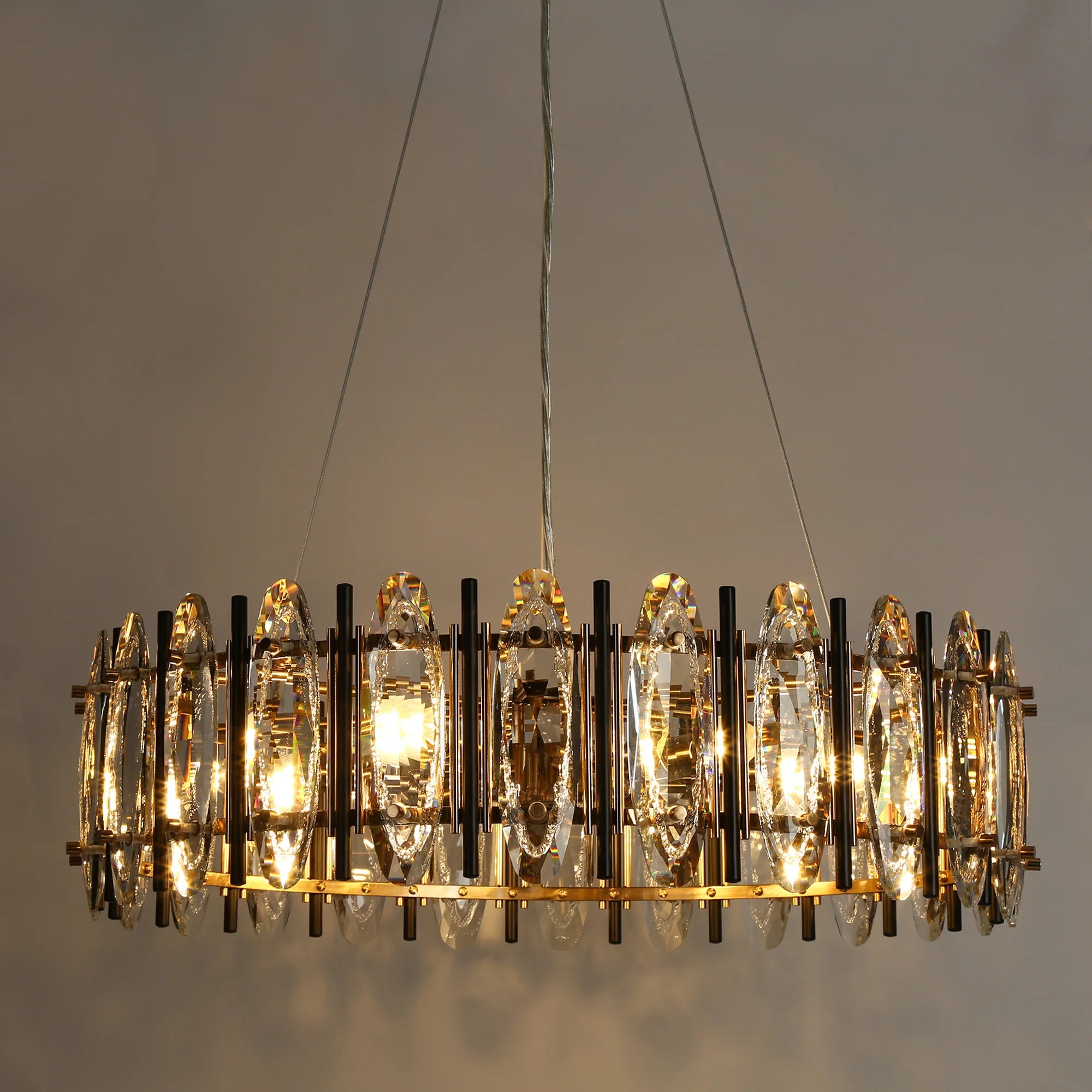 This stunning black and brass crystal drum chandelier is the perfect way to add a touch of modern elegance to your home. The unique design features oval crystals interspersed with thin metal rods, creating a dazzling display of light. With its adjustable height and sloped ceiling compatibility, this chandelier is perfect for a variety of spaces, including dining rooms, living rooms, and entryways.