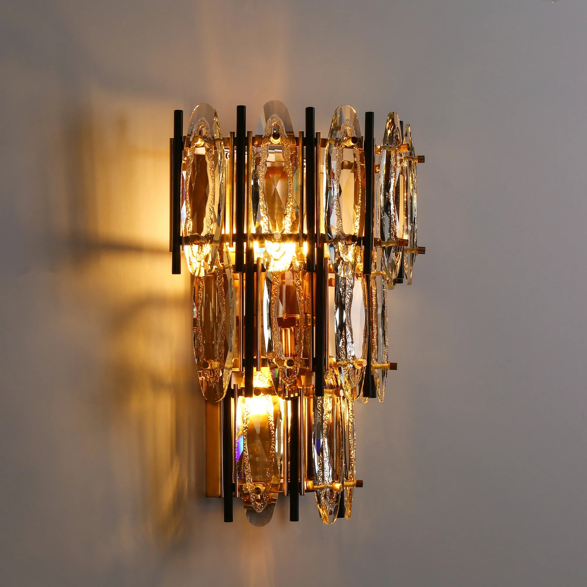 Transform your space with a touch of modern elegance. This stunning crystal wall sconce boasts a captivating design, featuring shimmering oval crystals delicately intertwined with sleek black and gold metal rods. The result? A dazzling display of light and shadow that adds a touch of glamour to any room.