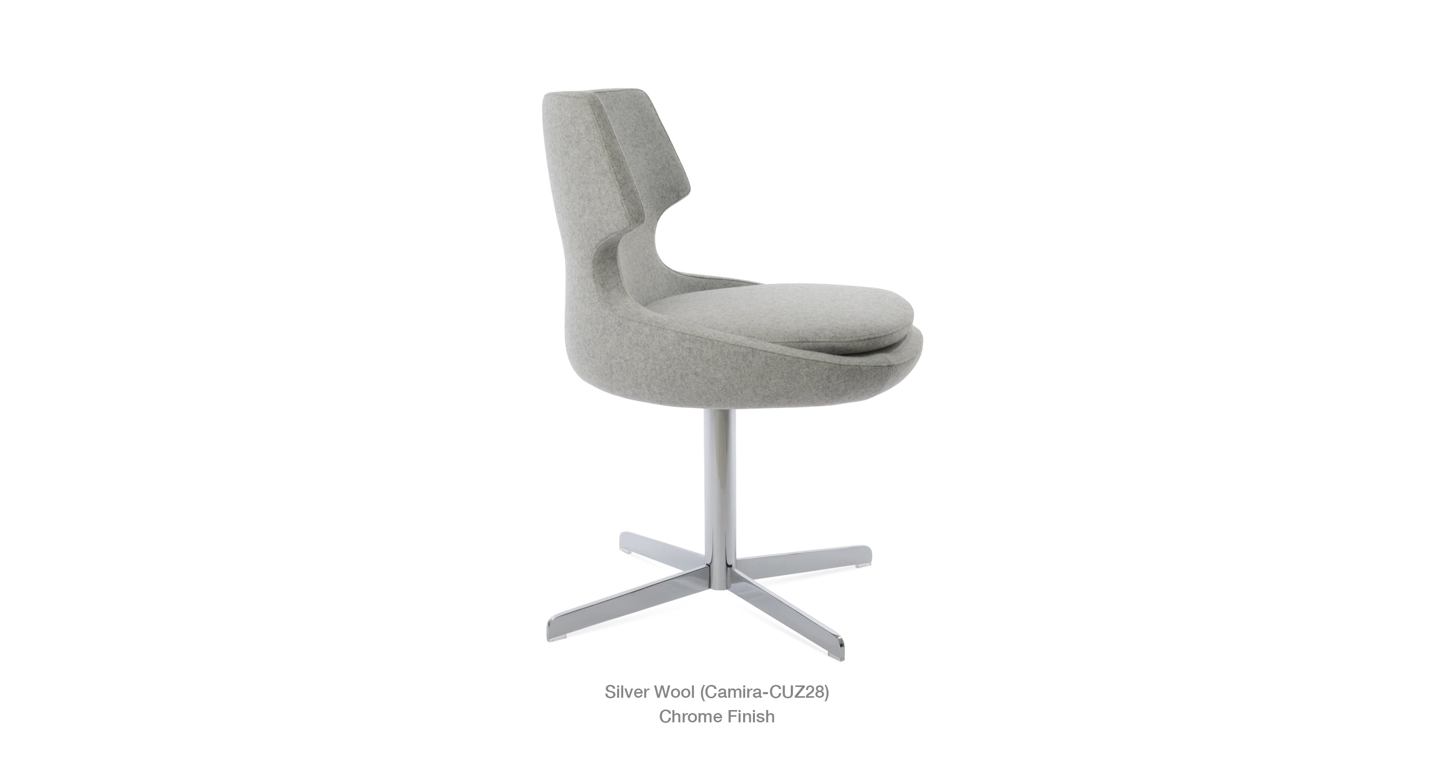 Patara is a distinctive dining chair with a comfortable upholstered seat and back rest on a 4 star matt brushed nickel legs. The legs have adjustable pod feet to level the chair on uneven surfaces and the feet are plastic-tipped. Its padded removable seat cushion provides extra comfort to the user. The seat has a steel structure with “S” shape springs for extra flexibility and strength. This steel frame is molded by an injecting polyurethane foam. Patara seat is upholstered with a removable zipper enclosed leather, or wool fabric slip cover. The chair is suitable for both residential and commercial use.