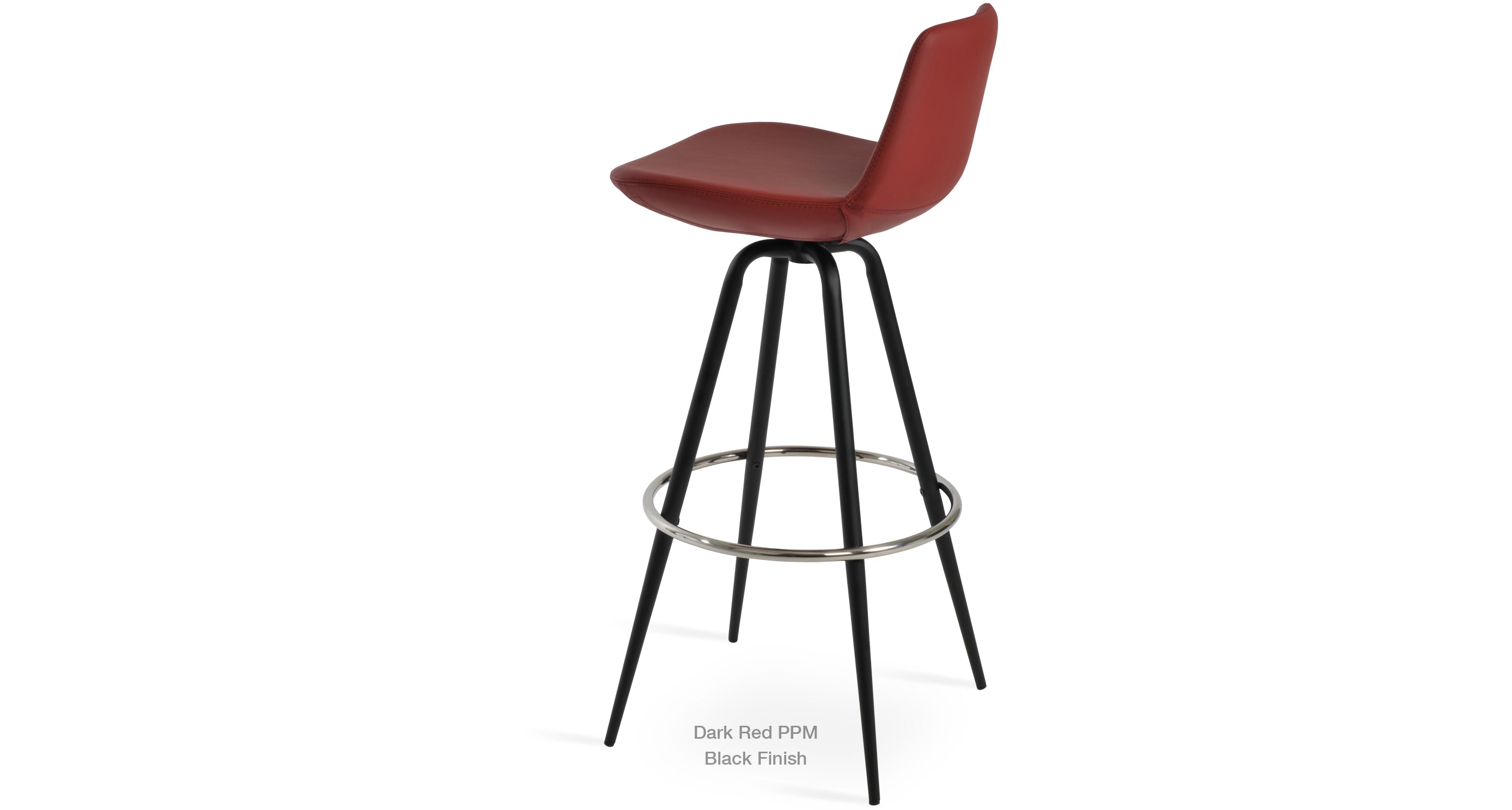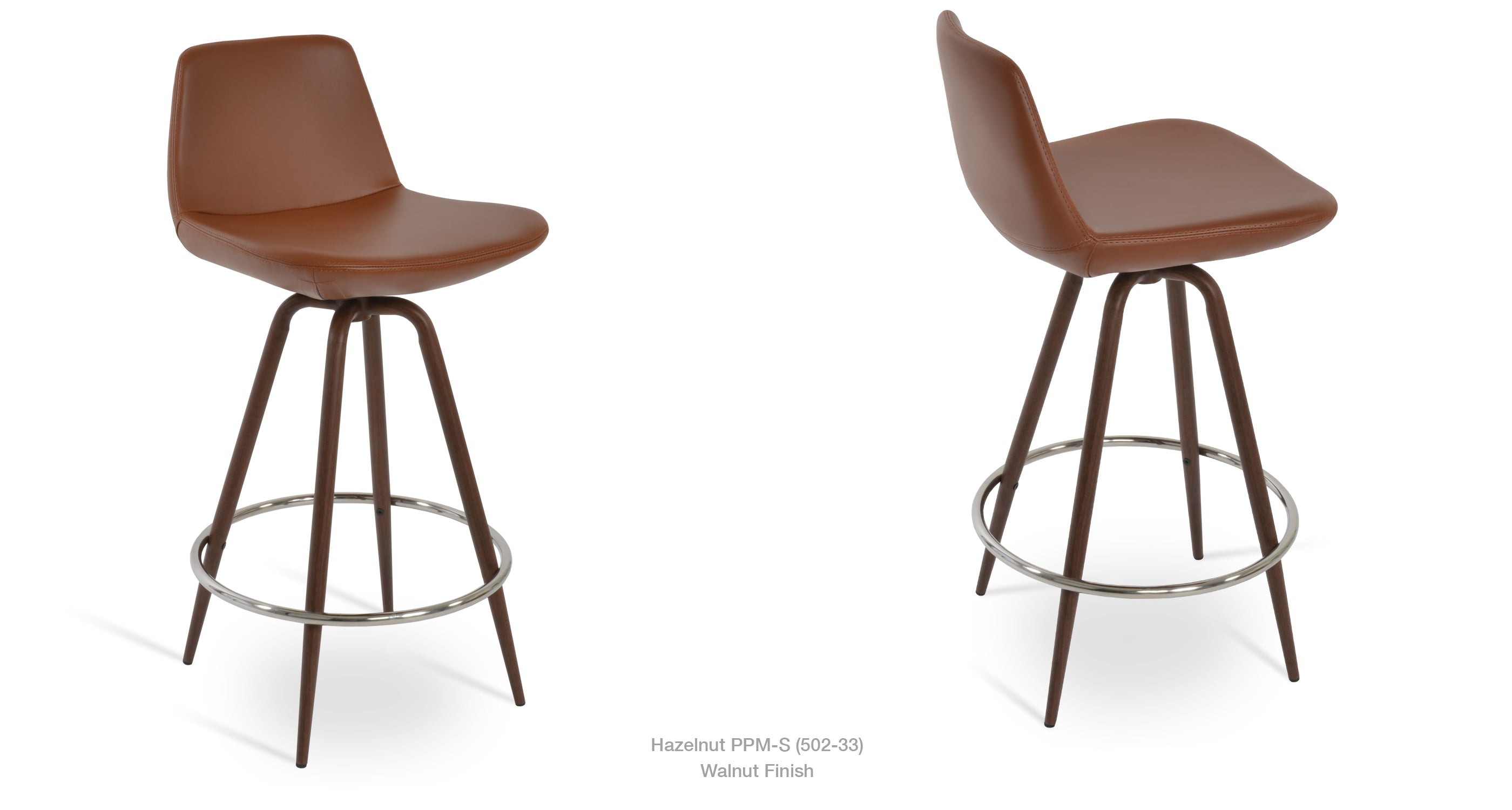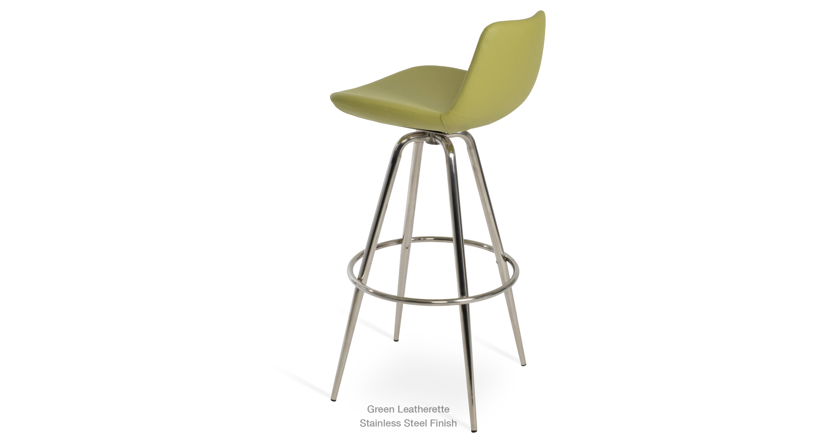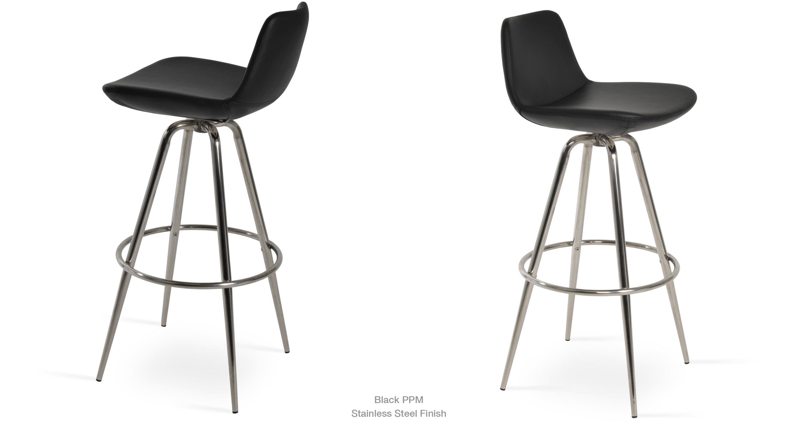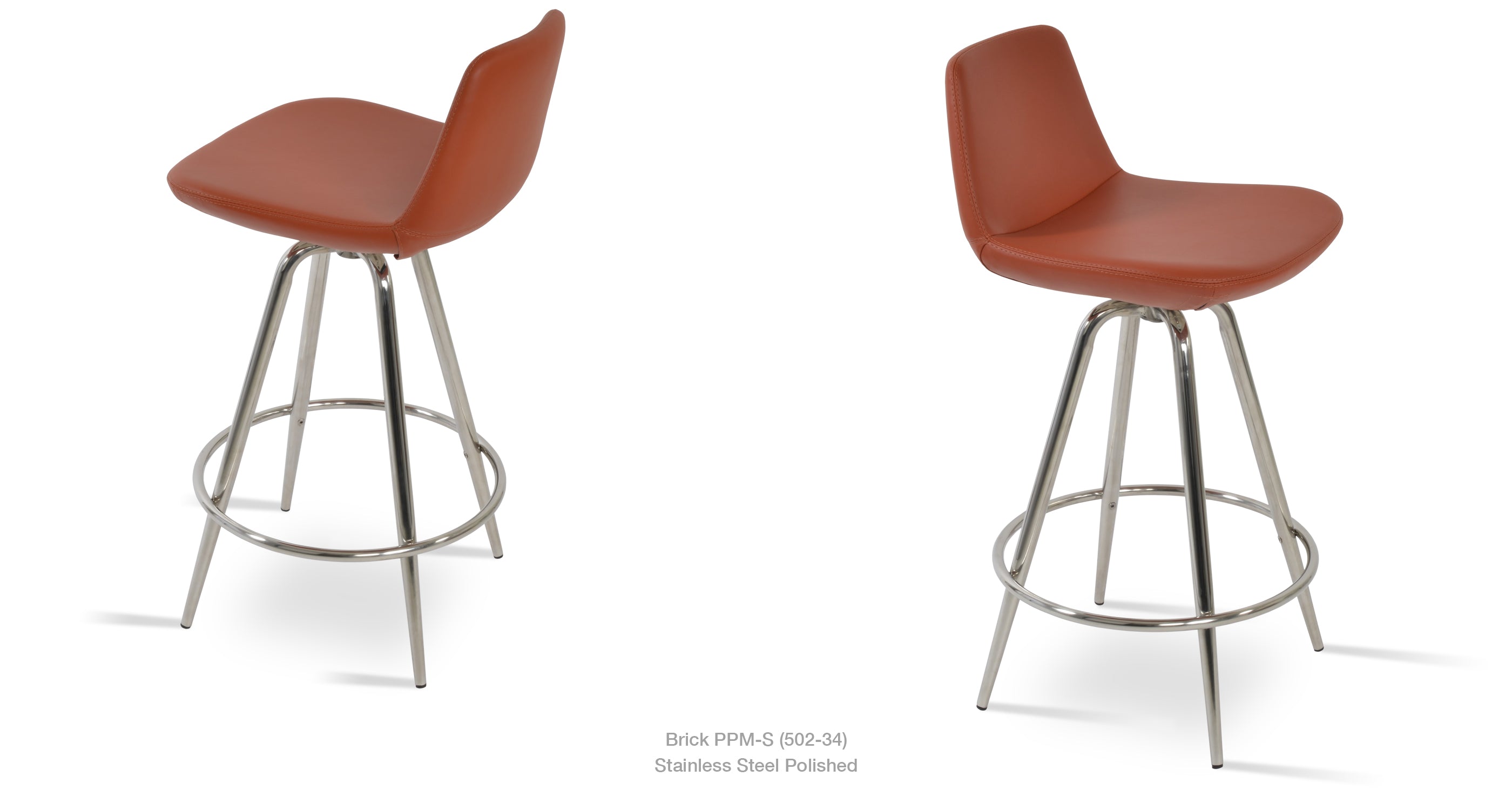 Pera Max Swivel stool is a unique counter and bar stool with a comfortable upholstered seat and backrest on solid chromed steel max swivel base. Each leg is tipped with a plastic glide embedded into the metal wire. The seat has a steel structure with “S” shape springs for extra flexibility and strength. This steel frame molded by injecting polyurethane foam. Pera seat is upholstered with a removable velcro enclosed leather, PPM or wool fabric slip cover. The stool is suitable for both residential and commercial use.