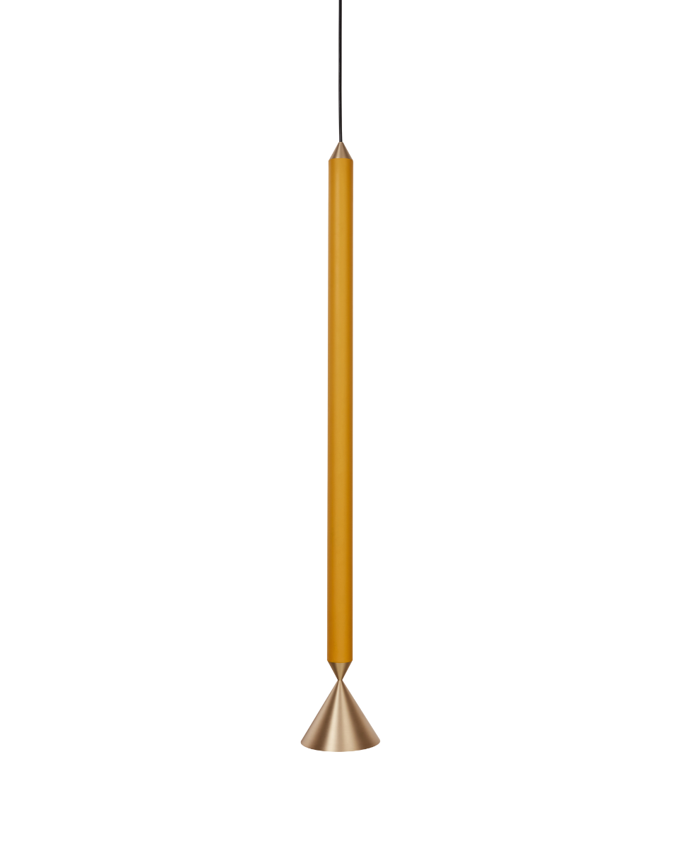 Larger cones in glowing honey gold brass deliver luxurious warmth and sculptural presence, ideal for high ceilings or grand dining spaces.