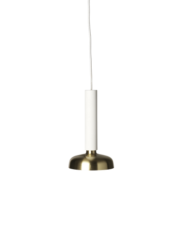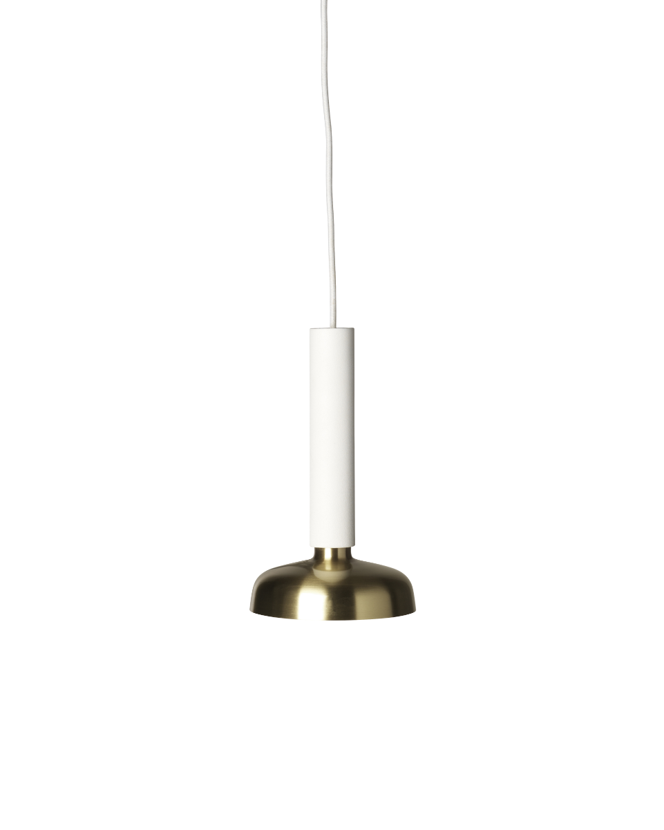 Clean traffic-white enamel pairs with warm brass detailing, forming a compact pendant that brightens breakfast bars and bedside tables with airy charm.