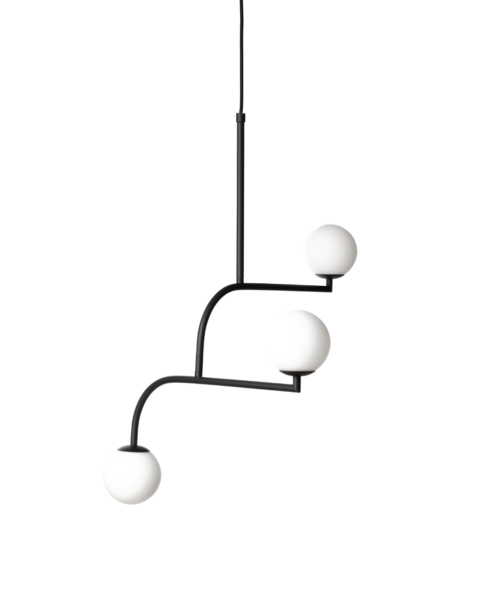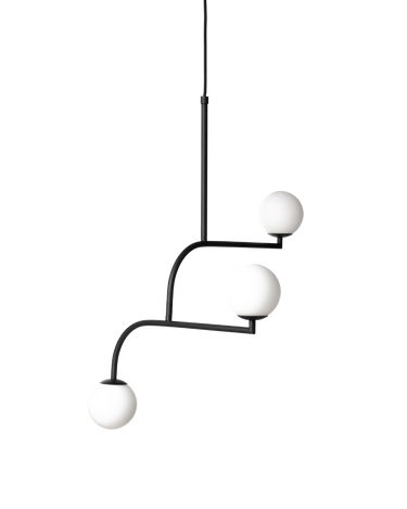 Three matte-black arms swivel luminous opal globes into balanced positions, evoking Brooklyn Bridge streetlights while casting warm, diffuse illumination over tables or islands.