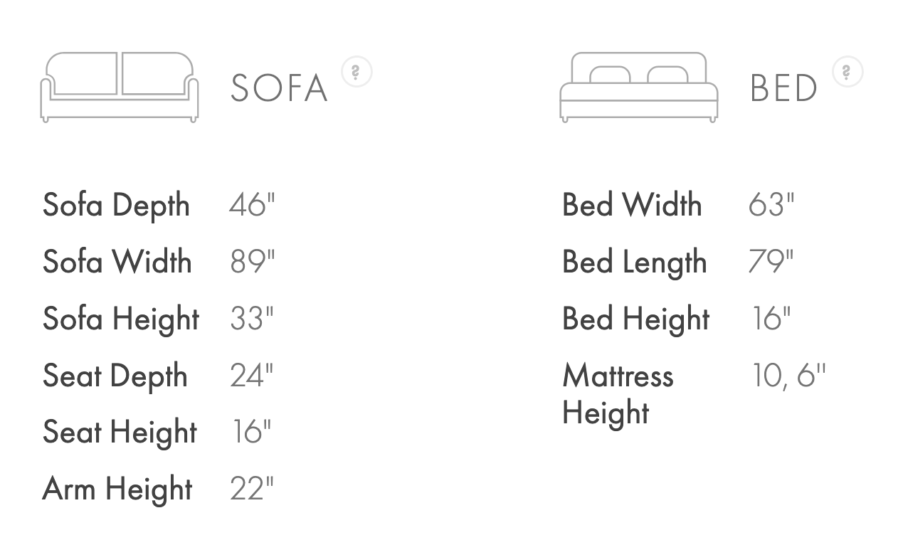 | Sofa dimensions (W x D x H) | 89 x 46 x 33 in (226 x 117 x 84 cm) |