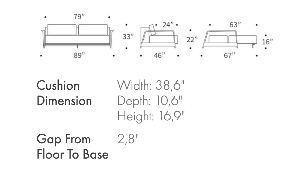 Compact sofa footprint: 89" W x 46" D x 33" H.