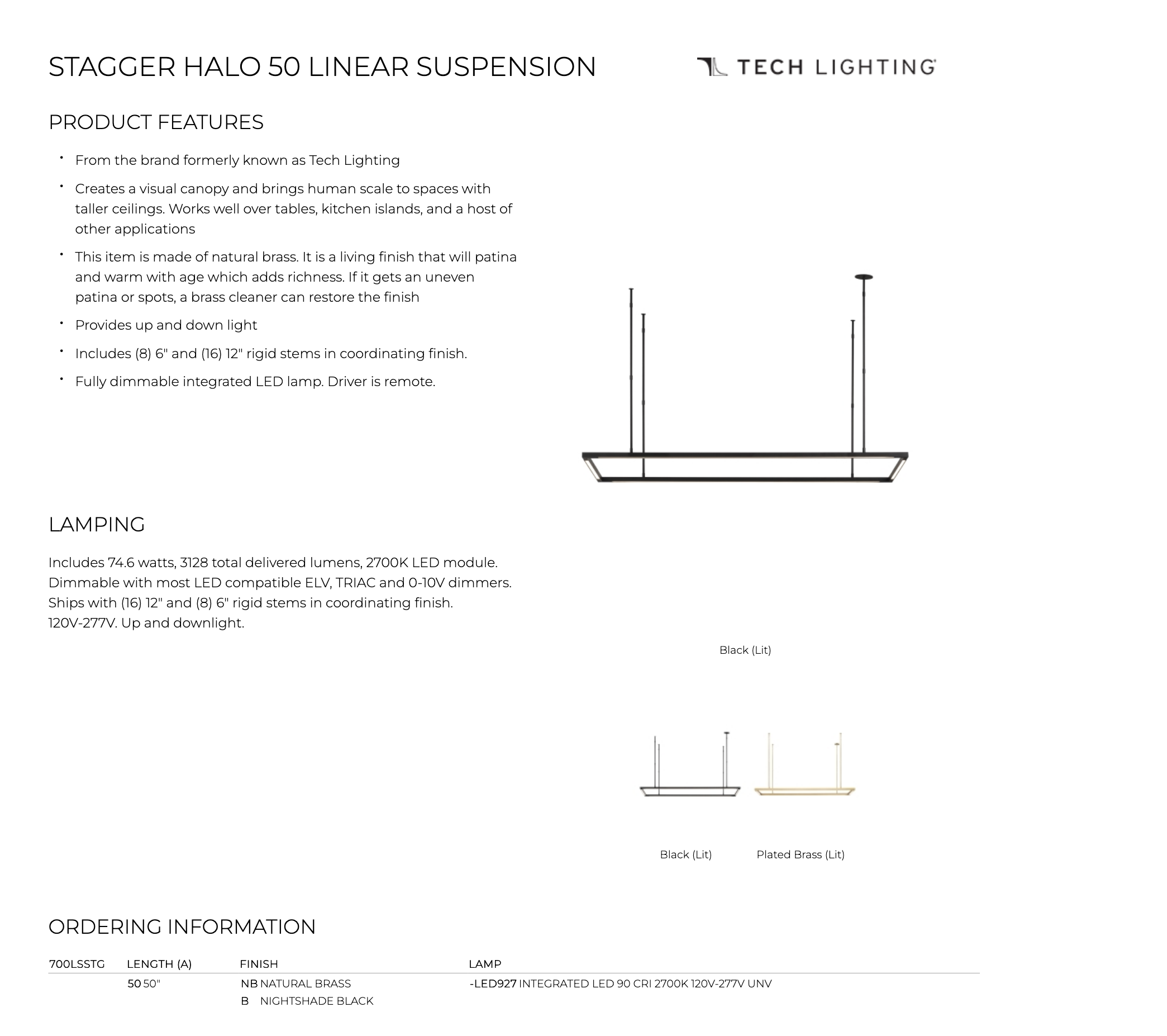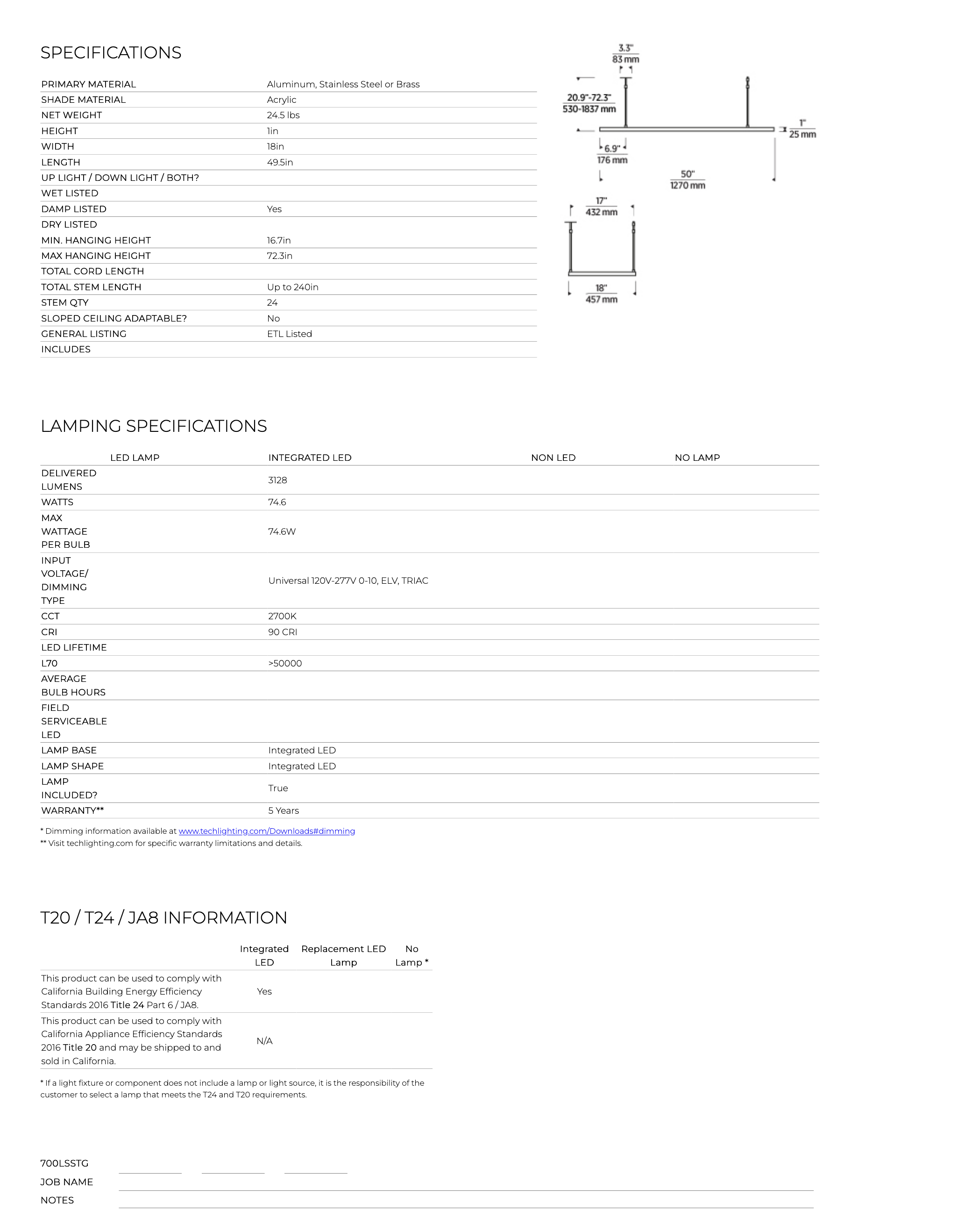 Includes 74.6 watts, 3128 total delivered lumens, 2700K LED module. Dimmable with most LED compatible ELV, TRIAC and 0-10V dimmers. Ships with (16) 12" and (8) 6" rigid stems in coordinating finish. 120V-277V. Up and downlight.
