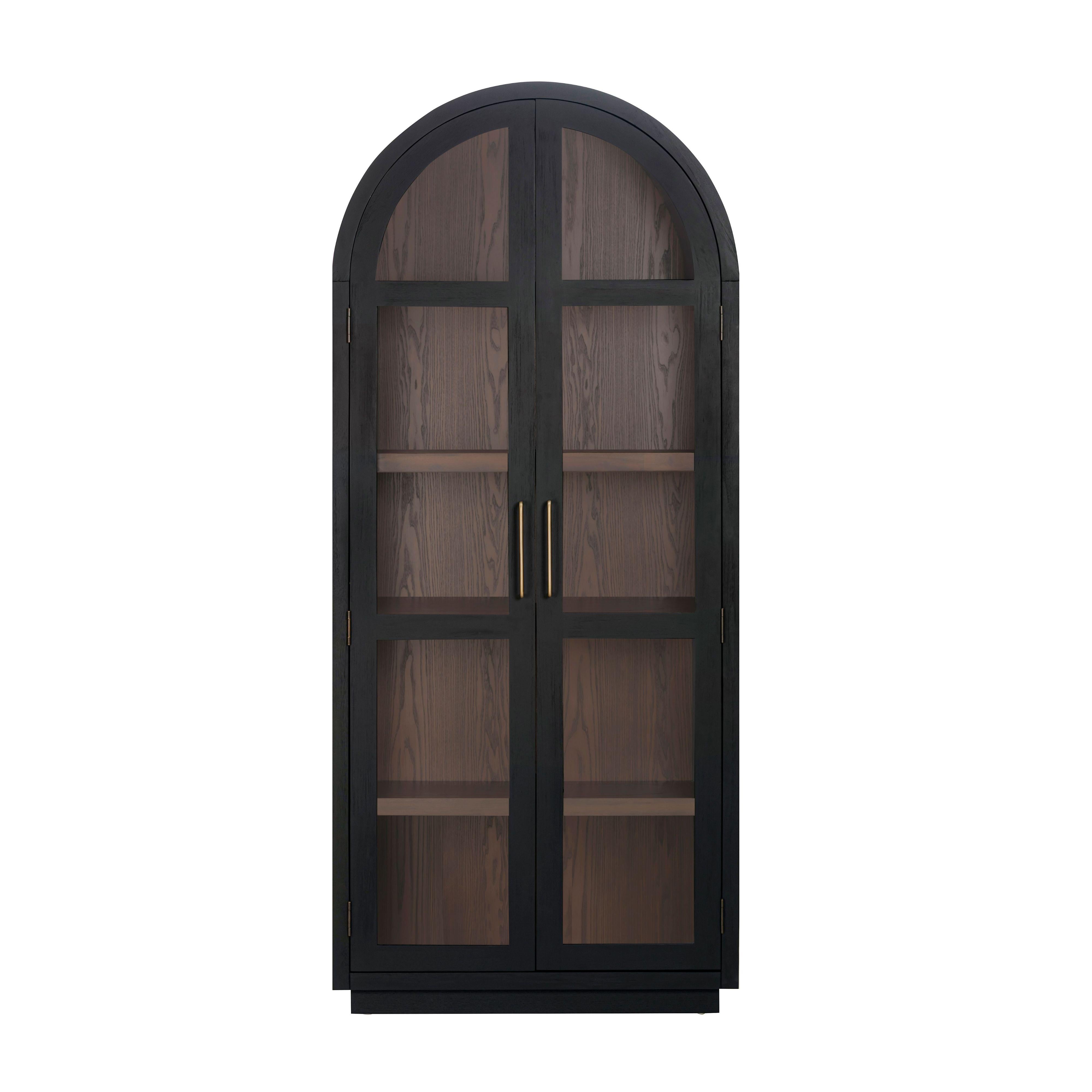 Warm and sculptural, the Marlow Display Cabinet in a natural wood finish brings effortless elegance to your space. The arched silhouette and minimalist frame offer a fresh, modern take on classic display storage. Behind two glass doors, open shelving provides the perfect backdrop for curated objects, books, or serveware. With its clean design and timeless appeal, the Marlow Display Cabinet works beautifully in living rooms, dining areas, or beyond. Available in natural wood or black and dark brown two-tone finish.